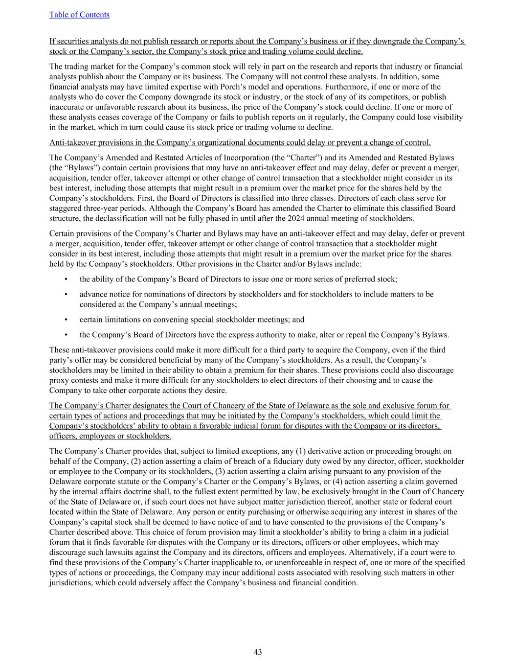 If securities analysts do not publish research or reports about the Company’s business or if they downgrade the Company’s stock or the Company’s sector, the Company’s stock price and trading volume could decline. The trading market for the Company’s common stock will rely in part on the research and reports that industry or financial analysts publish about the Company or its business. The Company will not control these analysts. In addition, some financial analysts may have limited expertise with Porch’s model and operations. Furthermore, if one or more of the analysts who do cover the Company downgrade its stock or industry, or the stock of any of its competitors, or publish inaccurate or unfavorable research about its business, the price of the Company’s stock could decline. If one or more of these analysts ceases coverage of the Company or fails to publish reports on it regularly, the Company could lose visibility in the market, which in turn could cause its stock price or trading volume to decline. Anti-takeover provisions in the Company’s organizational documents could delay or prevent a change of control. The Company’s Amended and Restated Articles of Incorporation (the “Charter”) and its Amended and Restated Bylaws (the “Bylaws”) contain certain provisions that may have an anti-takeover effect and may delay, defer or prevent a merger, acquisition, tender offer, takeover attempt or other change of control transaction that a stockholder might consider in its best interest, including those attempts that might result in a premium over the market price for the shares held by the Company’s stockholders. First, the Board of Directors is classified into three classes. Directors of each class serve for staggered three-year periods. Although the Company’s Board has amended the Charter to eliminate this classified Board structure, the declassification will not be fully phased in until after the 2024 annual meeting of stockholders. Certain provisions of the Company’s Charter and Bylaws may have an anti-takeover effect and may delay, defer or prevent a merger, acquisition, tender offer, takeover attempt or other change of control transaction that a stockholder might consider in its best interest, including those attempts that might result in a premium over the market price for the shares held by the Company’s stockholders. Other provisions in the Charter and/or Bylaws include: • the ability of the Company’s Board of Directors to issue one or more series of preferred stock; • advance notice for nominations of directors by stockholders and for stockholders to include matters to be considered at the Company’s annual meetings; • certain limitations on convening special stockholder meetings; and • the Company’s Board of Directors have the express authority to make, alter or repeal the Company’s Bylaws. These anti-takeover provisions could make it more difficult for a third party to acquire the Company, even if the third party’s offer may be considered beneficial by many of the Company’s stockholders. As a result, the Company’s stockholders may be limited in their ability to obtain a premium for their shares. These provisions could also discourage proxy contests and make it more difficult for any stockholders to elect directors of their choosing and to cause the Company to take other corporate actions they desire. The Company’s Charter designates the Court of Chancery of the State of Delaware as the sole and exclusive forum for certain types of actions and proceedings that may be initiated by the Company’s stockholders, which could limit the Company’s stockholders’ ability to obtain a favorable judicial forum for disputes with the Company or its directors, officers, employees or stockholders. The Company’s Charter provides that, subject to limited exceptions, any (1) derivative action or proceeding brought on behalf of the Company, (2) action asserting a claim of breach of a fiduciary duty owed by any director, officer, stockholder or employee to the Company or its stockholders, (3) action asserting a claim arising pursuant to any provision of the Delaware corporate statute or the Company’s Charter or the Company’s Bylaws, or (4) action asserting a claim governed by the internal affairs doctrine shall, to the fullest extent permitted by law, be exclusively brought in the Court of Chancery of the State of Delaware or, if such court does not have subject matter jurisdiction thereof, another state or federal court located within the State of Delaware. Any person or entity purchasing or otherwise acquiring any interest in shares of the Company’s capital stock shall be deemed to have notice of and to have consented to the provisions of the Company’s Charter described above. This choice of forum provision may limit a stockholder’s ability to bring a claim in a judicial forum that it finds favorable for disputes with the Company or its directors, officers or other employees, which may discourage such lawsuits against the Company and its directors, officers and employees. Alternatively, if a court were to find these provisions of the Company’s Charter inapplicable to, or unenforceable in respect of, one or more of the specified types of actions or proceedings, the Company may incur additional costs associated with resolving such matters in other jurisdictions, which could adversely affect the Company’s business and financial condition. Table of Contents 43