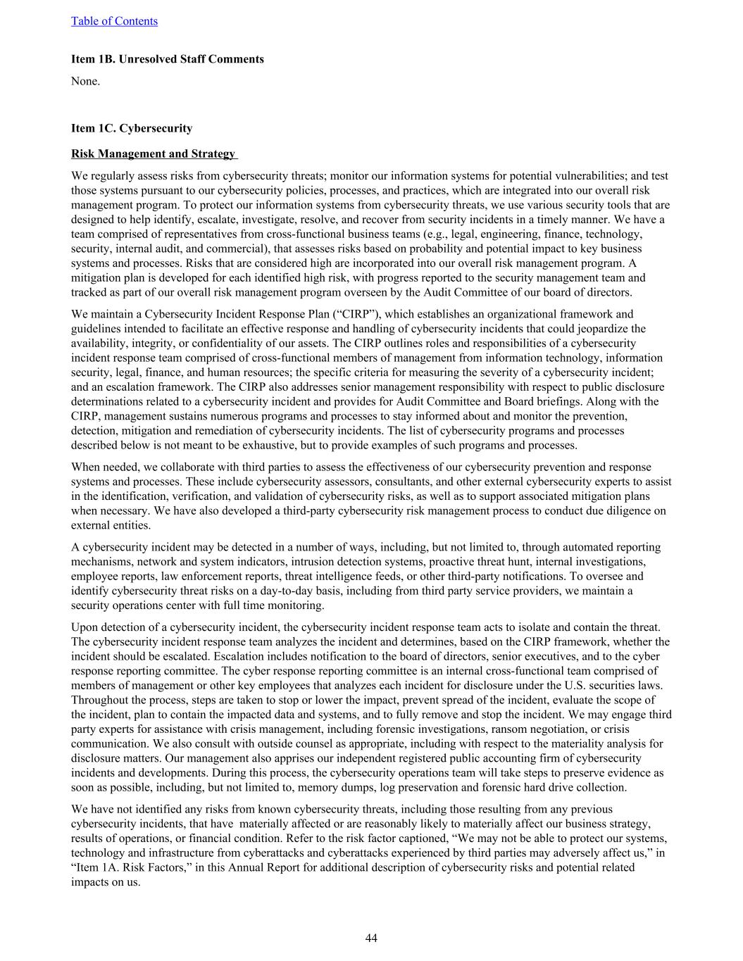 Item 1B. Unresolved Staff Comments None. Item 1C. Cybersecurity Risk Management and Strategy We regularly assess risks from cybersecurity threats; monitor our information systems for potential vulnerabilities; and test those systems pursuant to our cybersecurity policies, processes, and practices, which are integrated into our overall risk management program. To protect our information systems from cybersecurity threats, we use various security tools that are designed to help identify, escalate, investigate, resolve, and recover from security incidents in a timely manner. We have a team comprised of representatives from cross-functional business teams (e.g., legal, engineering, finance, technology, security, internal audit, and commercial), that assesses risks based on probability and potential impact to key business systems and processes. Risks that are considered high are incorporated into our overall risk management program. A mitigation plan is developed for each identified high risk, with progress reported to the security management team and tracked as part of our overall risk management program overseen by the Audit Committee of our board of directors. We maintain a Cybersecurity Incident Response Plan (“CIRP”), which establishes an organizational framework and guidelines intended to facilitate an effective response and handling of cybersecurity incidents that could jeopardize the availability, integrity, or confidentiality of our assets. The CIRP outlines roles and responsibilities of a cybersecurity incident response team comprised of cross-functional members of management from information technology, information security, legal, finance, and human resources; the specific criteria for measuring the severity of a cybersecurity incident; and an escalation framework. The CIRP also addresses senior management responsibility with respect to public disclosure determinations related to a cybersecurity incident and provides for Audit Committee and Board briefings. Along with the CIRP, management sustains numerous programs and processes to stay informed about and monitor the prevention, detection, mitigation and remediation of cybersecurity incidents. The list of cybersecurity programs and processes described below is not meant to be exhaustive, but to provide examples of such programs and processes. When needed, we collaborate with third parties to assess the effectiveness of our cybersecurity prevention and response systems and processes. These include cybersecurity assessors, consultants, and other external cybersecurity experts to assist in the identification, verification, and validation of cybersecurity risks, as well as to support associated mitigation plans when necessary. We have also developed a third-party cybersecurity risk management process to conduct due diligence on external entities. A cybersecurity incident may be detected in a number of ways, including, but not limited to, through automated reporting mechanisms, network and system indicators, intrusion detection systems, proactive threat hunt, internal investigations, employee reports, law enforcement reports, threat intelligence feeds, or other third-party notifications. To oversee and identify cybersecurity threat risks on a day-to-day basis, including from third party service providers, we maintain a security operations center with full time monitoring. Upon detection of a cybersecurity incident, the cybersecurity incident response team acts to isolate and contain the threat. The cybersecurity incident response team analyzes the incident and determines, based on the CIRP framework, whether the incident should be escalated. Escalation includes notification to the board of directors, senior executives, and to the cyber response reporting committee. The cyber response reporting committee is an internal cross-functional team comprised of members of management or other key employees that analyzes each incident for disclosure under the U.S. securities laws. Throughout the process, steps are taken to stop or lower the impact, prevent spread of the incident, evaluate the scope of the incident, plan to contain the impacted data and systems, and to fully remove and stop the incident. We may engage third party experts for assistance with crisis management, including forensic investigations, ransom negotiation, or crisis communication. We also consult with outside counsel as appropriate, including with respect to the materiality analysis for disclosure matters. Our management also apprises our independent registered public accounting firm of cybersecurity incidents and developments. During this process, the cybersecurity operations team will take steps to preserve evidence as soon as possible, including, but not limited to, memory dumps, log preservation and forensic hard drive collection. We have not identified any risks from known cybersecurity threats, including those resulting from any previous cybersecurity incidents, that have materially affected or are reasonably likely to materially affect our business strategy, results of operations, or financial condition. Refer to the risk factor captioned, “We may not be able to protect our systems, technology and infrastructure from cyberattacks and cyberattacks experienced by third parties may adversely affect us,” in “Item 1A. Risk Factors,” in this Annual Report for additional description of cybersecurity risks and potential related impacts on us. Table of Contents 44