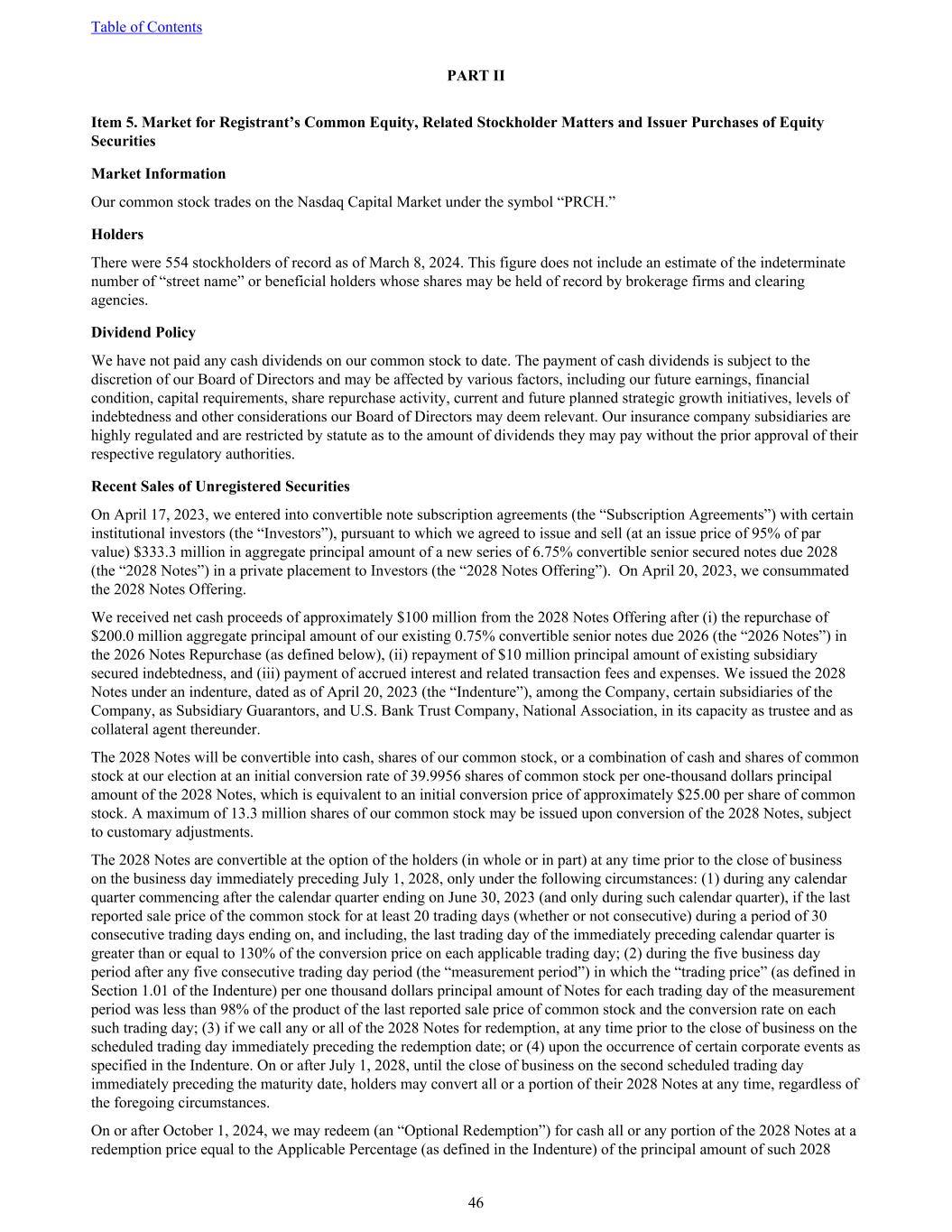 PART II Item 5. Market for Registrant’s Common Equity, Related Stockholder Matters and Issuer Purchases of Equity Securities Market Information Our common stock trades on the Nasdaq Capital Market under the symbol “PRCH.” Holders There were 554 stockholders of record as of March 8, 2024. This figure does not include an estimate of the indeterminate number of “street name” or beneficial holders whose shares may be held of record by brokerage firms and clearing agencies. Dividend Policy We have not paid any cash dividends on our common stock to date. The payment of cash dividends is subject to the discretion of our Board of Directors and may be affected by various factors, including our future earnings, financial condition, capital requirements, share repurchase activity, current and future planned strategic growth initiatives, levels of indebtedness and other considerations our Board of Directors may deem relevant. Our insurance company subsidiaries are highly regulated and are restricted by statute as to the amount of dividends they may pay without the prior approval of their respective regulatory authorities. Recent Sales of Unregistered Securities On April 17, 2023, we entered into convertible note subscription agreements (the “Subscription Agreements”) with certain institutional investors (the “Investors”), pursuant to which we agreed to issue and sell (at an issue price of 95% of par value) $333.3 million in aggregate principal amount of a new series of 6.75% convertible senior secured notes due 2028 (the “2028 Notes”) in a private placement to Investors (the “2028 Notes Offering”). On April 20, 2023, we consummated the 2028 Notes Offering. We received net cash proceeds of approximately $100 million from the 2028 Notes Offering after (i) the repurchase of $200.0 million aggregate principal amount of our existing 0.75% convertible senior notes due 2026 (the “2026 Notes”) in the 2026 Notes Repurchase (as defined below), (ii) repayment of $10 million principal amount of existing subsidiary secured indebtedness, and (iii) payment of accrued interest and related transaction fees and expenses. We issued the 2028 Notes under an indenture, dated as of April 20, 2023 (the “Indenture”), among the Company, certain subsidiaries of the Company, as Subsidiary Guarantors, and U.S. Bank Trust Company, National Association, in its capacity as trustee and as collateral agent thereunder. The 2028 Notes will be convertible into cash, shares of our common stock, or a combination of cash and shares of common stock at our election at an initial conversion rate of 39.9956 shares of common stock per one-thousand dollars principal amount of the 2028 Notes, which is equivalent to an initial conversion price of approximately $25.00 per share of common stock. A maximum of 13.3 million shares of our common stock may be issued upon conversion of the 2028 Notes, subject to customary adjustments. The 2028 Notes are convertible at the option of the holders (in whole or in part) at any time prior to the close of business on the business day immediately preceding July 1, 2028, only under the following circumstances: (1) during any calendar quarter commencing after the calendar quarter ending on June 30, 2023 (and only during such calendar quarter), if the last reported sale price of the common stock for at least 20 trading days (whether or not consecutive) during a period of 30 consecutive trading days ending on, and including, the last trading day of the immediately preceding calendar quarter is greater than or equal to 130% of the conversion price on each applicable trading day; (2) during the five business day period after any five consecutive trading day period (the “measurement period”) in which the “trading price” (as defined in Section 1.01 of the Indenture) per one thousand dollars principal amount of Notes for each trading day of the measurement period was less than 98% of the product of the last reported sale price of common stock and the conversion rate on each such trading day; (3) if we call any or all of the 2028 Notes for redemption, at any time prior to the close of business on the scheduled trading day immediately preceding the redemption date; or (4) upon the occurrence of certain corporate events as specified in the Indenture. On or after July 1, 2028, until the close of business on the second scheduled trading day immediately preceding the maturity date, holders may convert all or a portion of their 2028 Notes at any time, regardless of the foregoing circumstances. On or after October 1, 2024, we may redeem (an “Optional Redemption”) for cash all or any portion of the 2028 Notes at a redemption price equal to the Applicable Percentage (as defined in the Indenture) of the principal amount of such 2028 Table of Contents 46