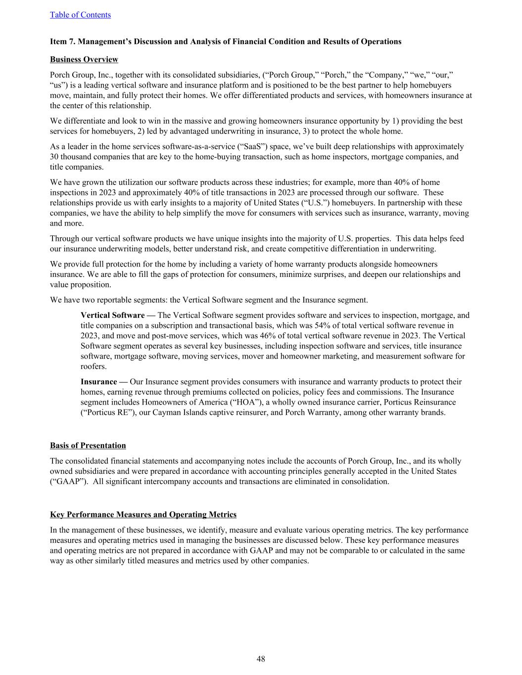 Item 7. Management’s Discussion and Analysis of Financial Condition and Results of Operations Business Overview Porch Group, Inc., together with its consolidated subsidiaries, (“Porch Group,” “Porch,” the “Company,” “we,” “our,” “us”) is a leading vertical software and insurance platform and is positioned to be the best partner to help homebuyers move, maintain, and fully protect their homes. We offer differentiated products and services, with homeowners insurance at the center of this relationship. We differentiate and look to win in the massive and growing homeowners insurance opportunity by 1) providing the best services for homebuyers, 2) led by advantaged underwriting in insurance, 3) to protect the whole home. As a leader in the home services software-as-a-service (“SaaS”) space, we’ve built deep relationships with approximately 30 thousand companies that are key to the home-buying transaction, such as home inspectors, mortgage companies, and title companies. We have grown the utilization our software products across these industries; for example, more than 40% of home inspections in 2023 and approximately 40% of title transactions in 2023 are processed through our software. These relationships provide us with early insights to a majority of United States (“U.S.”) homebuyers. In partnership with these companies, we have the ability to help simplify the move for consumers with services such as insurance, warranty, moving and more. Through our vertical software products we have unique insights into the majority of U.S. properties. This data helps feed our insurance underwriting models, better understand risk, and create competitive differentiation in underwriting. We provide full protection for the home by including a variety of home warranty products alongside homeowners insurance. We are able to fill the gaps of protection for consumers, minimize surprises, and deepen our relationships and value proposition. We have two reportable segments: the Vertical Software segment and the Insurance segment. Vertical Software — The Vertical Software segment provides software and services to inspection, mortgage, and title companies on a subscription and transactional basis, which was 54% of total vertical software revenue in 2023, and move and post-move services, which was 46% of total vertical software revenue in 2023. The Vertical Software segment operates as several key businesses, including inspection software and services, title insurance software, mortgage software, moving services, mover and homeowner marketing, and measurement software for roofers. Insurance — Our Insurance segment provides consumers with insurance and warranty products to protect their homes, earning revenue through premiums collected on policies, policy fees and commissions. The Insurance segment includes Homeowners of America (“HOA”), a wholly owned insurance carrier, Porticus Reinsurance (“Porticus RE”), our Cayman Islands captive reinsurer, and Porch Warranty, among other warranty brands. Basis of Presentation The consolidated financial statements and accompanying notes include the accounts of Porch Group, Inc., and its wholly owned subsidiaries and were prepared in accordance with accounting principles generally accepted in the United States (“GAAP”). All significant intercompany accounts and transactions are eliminated in consolidation. Key Performance Measures and Operating Metrics In the management of these businesses, we identify, measure and evaluate various operating metrics. The key performance measures and operating metrics used in managing the businesses are discussed below. These key performance measures and operating metrics are not prepared in accordance with GAAP and may not be comparable to or calculated in the same way as other similarly titled measures and metrics used by other companies. Table of Contents 48