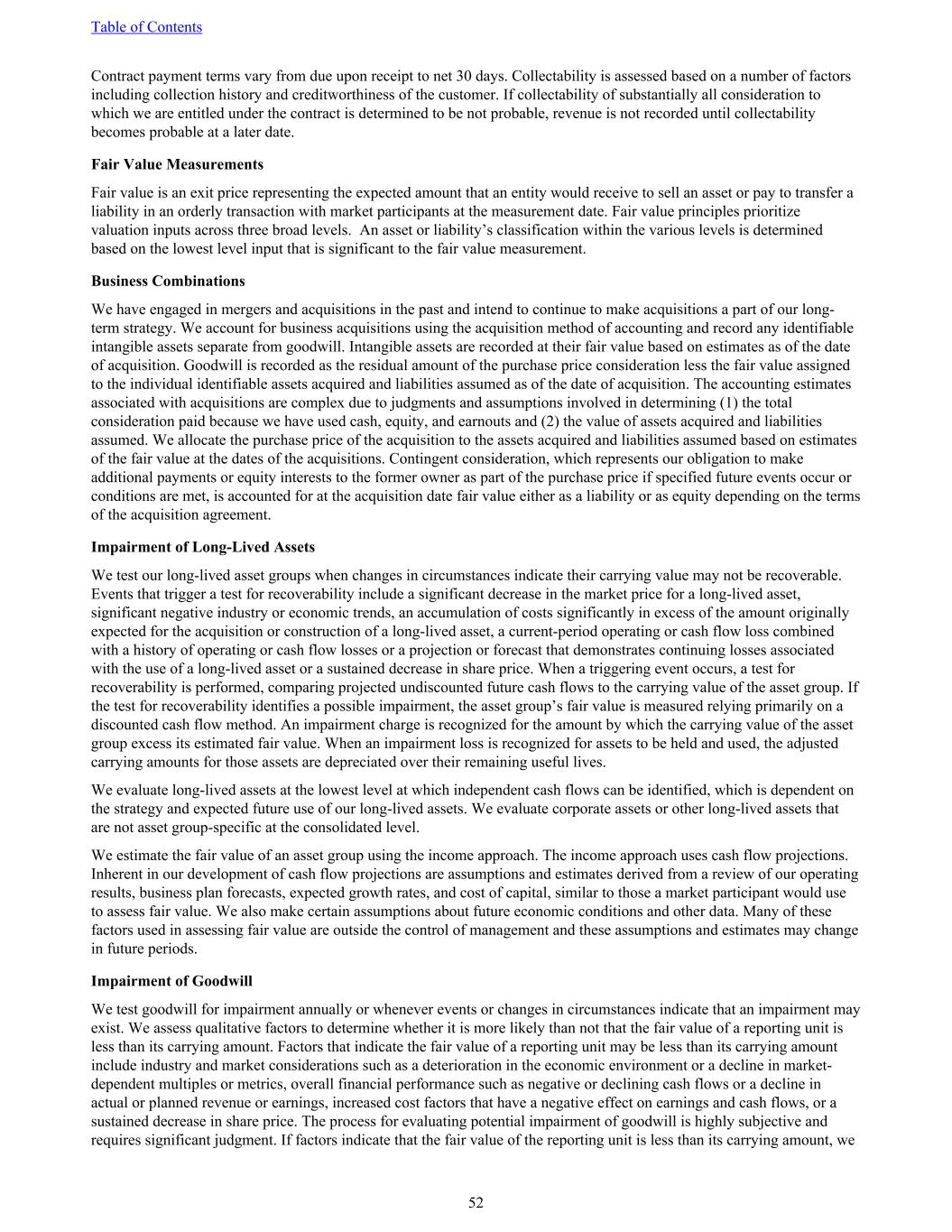 Contract payment terms vary from due upon receipt to net 30 days. Collectability is assessed based on a number of factors including collection history and creditworthiness of the customer. If collectability of substantially all consideration to which we are entitled under the contract is determined to be not probable, revenue is not recorded until collectability becomes probable at a later date. Fair Value Measurements Fair value is an exit price representing the expected amount that an entity would receive to sell an asset or pay to transfer a liability in an orderly transaction with market participants at the measurement date. Fair value principles prioritize valuation inputs across three broad levels. An asset or liability’s classification within the various levels is determined based on the lowest level input that is significant to the fair value measurement. Business Combinations We have engaged in mergers and acquisitions in the past and intend to continue to make acquisitions a part of our long- term strategy. We account for business acquisitions using the acquisition method of accounting and record any identifiable intangible assets separate from goodwill. Intangible assets are recorded at their fair value based on estimates as of the date of acquisition. Goodwill is recorded as the residual amount of the purchase price consideration less the fair value assigned to the individual identifiable assets acquired and liabilities assumed as of the date of acquisition. The accounting estimates associated with acquisitions are complex due to judgments and assumptions involved in determining (1) the total consideration paid because we have used cash, equity, and earnouts and (2) the value of assets acquired and liabilities assumed. We allocate the purchase price of the acquisition to the assets acquired and liabilities assumed based on estimates of the fair value at the dates of the acquisitions. Contingent consideration, which represents our obligation to make additional payments or equity interests to the former owner as part of the purchase price if specified future events occur or conditions are met, is accounted for at the acquisition date fair value either as a liability or as equity depending on the terms of the acquisition agreement. Impairment of Long-Lived Assets We test our long-lived asset groups when changes in circumstances indicate their carrying value may not be recoverable. Events that trigger a test for recoverability include a significant decrease in the market price for a long-lived asset, significant negative industry or economic trends, an accumulation of costs significantly in excess of the amount originally expected for the acquisition or construction of a long-lived asset, a current-period operating or cash flow loss combined with a history of operating or cash flow losses or a projection or forecast that demonstrates continuing losses associated with the use of a long-lived asset or a sustained decrease in share price. When a triggering event occurs, a test for recoverability is performed, comparing projected undiscounted future cash flows to the carrying value of the asset group. If the test for recoverability identifies a possible impairment, the asset group’s fair value is measured relying primarily on a discounted cash flow method. An impairment charge is recognized for the amount by which the carrying value of the asset group excess its estimated fair value. When an impairment loss is recognized for assets to be held and used, the adjusted carrying amounts for those assets are depreciated over their remaining useful lives. We evaluate long-lived assets at the lowest level at which independent cash flows can be identified, which is dependent on the strategy and expected future use of our long-lived assets. We evaluate corporate assets or other long-lived assets that are not asset group-specific at the consolidated level. We estimate the fair value of an asset group using the income approach. The income approach uses cash flow projections. Inherent in our development of cash flow projections are assumptions and estimates derived from a review of our operating results, business plan forecasts, expected growth rates, and cost of capital, similar to those a market participant would use to assess fair value. We also make certain assumptions about future economic conditions and other data. Many of these factors used in assessing fair value are outside the control of management and these assumptions and estimates may change in future periods. Impairment of Goodwill We test goodwill for impairment annually or whenever events or changes in circumstances indicate that an impairment may exist. We assess qualitative factors to determine whether it is more likely than not that the fair value of a reporting unit is less than its carrying amount. Factors that indicate the fair value of a reporting unit may be less than its carrying amount include industry and market considerations such as a deterioration in the economic environment or a decline in market- dependent multiples or metrics, overall financial performance such as negative or declining cash flows or a decline in actual or planned revenue or earnings, increased cost factors that have a negative effect on earnings and cash flows, or a sustained decrease in share price. The process for evaluating potential impairment of goodwill is highly subjective and requires significant judgment. If factors indicate that the fair value of the reporting unit is less than its carrying amount, we Table of Contents 52
