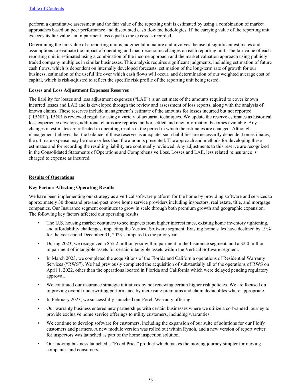 perform a quantitative assessment and the fair value of the reporting unit is estimated by using a combination of market approaches based on peer performance and discounted cash flow methodologies. If the carrying value of the reporting unit exceeds its fair value, an impairment loss equal to the excess is recorded. Determining the fair value of a reporting unit is judgmental in nature and involves the use of significant estimates and assumptions to evaluate the impact of operating and macroeconomic changes on each reporting unit. The fair value of each reporting unit is estimated using a combination of the income approach and the market valuation approach using publicly traded company multiples in similar businesses. This analysis requires significant judgments, including estimation of future cash flows, which is dependent on internally developed forecasts, estimation of the long-term rate of growth for our business, estimation of the useful life over which cash flows will occur, and determination of our weighted average cost of capital, which is risk-adjusted to reflect the specific risk profile of the reporting unit being tested. Losses and Loss Adjustment Expenses Reserves The liability for losses and loss adjustment expenses (“LAE”) is an estimate of the amounts required to cover known incurred losses and LAE and is developed through the review and assessment of loss reports, along with the analysis of known claims. These reserves include management’s estimate of the amounts for losses incurred but not reported (“IBNR”). IBNR is reviewed regularly using a variety of actuarial techniques. We update the reserve estimates as historical loss experience develops, additional claims are reported and/or settled and new information becomes available. Any changes in estimates are reflected in operating results in the period in which the estimates are changed. Although management believes that the balance of these reserves is adequate, such liabilities are necessarily dependent on estimates, the ultimate expense may be more or less than the amounts presented. The approach and methods for developing these estimates and for recording the resulting liability are continually reviewed. Any adjustments to this reserve are recognized in the Consolidated Statements of Operations and Comprehensive Loss. Losses and LAE, less related reinsurance is charged to expense as incurred. Results of Operations Key Factors Affecting Operating Results We have been implementing our strategy as a vertical software platform for the home by providing software and services to approximately 30 thousand pre-and-post move home service providers including inspectors, real estate, title, and mortgage companies. Our Insurance segment continues to grow in scale through both premium growth and geographic expansion. The following key factors affected our operating results. • The U.S. housing market continues to see impacts from higher interest rates, existing home inventory tightening, and affordability challenges, impacting the Vertical Software segment. Existing home sales have declined by 19% for the year ended December 31, 2023, compared to the prior year. • During 2023, we recognized a $55.2 million goodwill impairment in the Insurance segment, and a $2.0 million impairment of intangible assets for certain intangible assets within the Vertical Software segment. • In March 2023, we completed the acquisitions of the Florida and California operations of Residential Warranty Services (“RWS”). We had previously completed the acquisition of substantially all of the operations of RWS on April 1, 2022, other than the operations located in Florida and California which were delayed pending regulatory approval. • We continued our insurance strategic initiatives by not renewing certain higher risk policies. We are focused on improving overall underwriting performance by increasing premiums and claim deductibles where appropriate. • In February 2023, we successfully launched our Porch Warranty offering. • Our warranty business entered new partnerships with certain businesses where we utilize a co-branded journey to provide exclusive home service offerings to utility customers, including warranties. • We continue to develop software for customers, including the expansion of our suite of solutions for our Floify customers and partners. A new module version was rolled out within Rynoh, and a new version of report writer for inspectors was launched as part of the home inspection solution. • Our moving business launched a “Fixed Price” product which makes the moving journey simpler for moving companies and consumers. Table of Contents 53