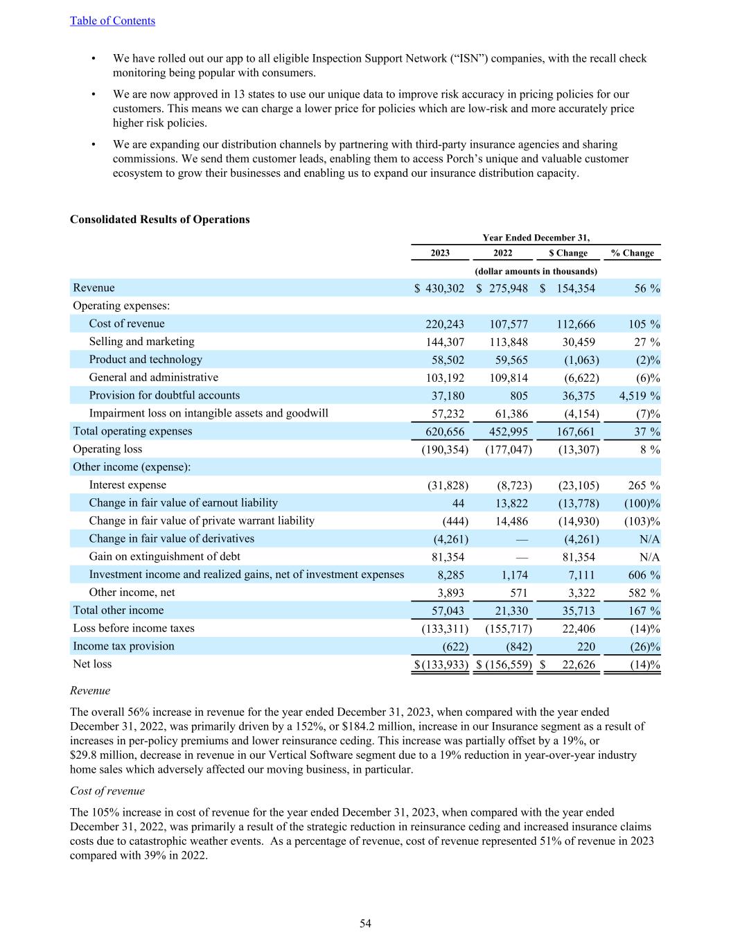 • We have rolled out our app to all eligible Inspection Support Network (“ISN”) companies, with the recall check monitoring being popular with consumers. • We are now approved in 13 states to use our unique data to improve risk accuracy in pricing policies for our customers. This means we can charge a lower price for policies which are low-risk and more accurately price higher risk policies. • We are expanding our distribution channels by partnering with third-party insurance agencies and sharing commissions. We send them customer leads, enabling them to access Porch’s unique and valuable customer ecosystem to grow their businesses and enabling us to expand our insurance distribution capacity. Consolidated Results of Operations Year Ended December 31, 2023 2022 $ Change % Change (dollar amounts in thousands) Revenue $ 430,302 $ 275,948 $ 154,354 56 % Operating expenses: Cost of revenue 220,243 107,577 112,666 105 % Selling and marketing 144,307 113,848 30,459 27 % Product and technology 58,502 59,565 (1,063) (2) % General and administrative 103,192 109,814 (6,622) (6) % Provision for doubtful accounts 37,180 805 36,375 4,519 % Impairment loss on intangible assets and goodwill 57,232 61,386 (4,154) (7) % Total operating expenses 620,656 452,995 167,661 37 % Operating loss (190,354) (177,047) (13,307) 8 % Other income (expense): Interest expense (31,828) (8,723) (23,105) 265 % Change in fair value of earnout liability 44 13,822 (13,778) (100) % Change in fair value of private warrant liability (444) 14,486 (14,930) (103) % Change in fair value of derivatives (4,261) — (4,261) N/A Gain on extinguishment of debt 81,354 — 81,354 N/A Investment income and realized gains, net of investment expenses 8,285 1,174 7,111 606 % Other income, net 3,893 571 3,322 582 % Total other income 57,043 21,330 35,713 167 % Loss before income taxes (133,311) (155,717) 22,406 (14) % Income tax provision (622) (842) 220 (26) % Net loss $ (133,933) $ (156,559) $ 22,626 (14) % Revenue The overall 56% increase in revenue for the year ended December 31, 2023, when compared with the year ended December 31, 2022, was primarily driven by a 152%, or $184.2 million, increase in our Insurance segment as a result of increases in per-policy premiums and lower reinsurance ceding. This increase was partially offset by a 19%, or $29.8 million, decrease in revenue in our Vertical Software segment due to a 19% reduction in year-over-year industry home sales which adversely affected our moving business, in particular. Cost of revenue The 105% increase in cost of revenue for the year ended December 31, 2023, when compared with the year ended December 31, 2022, was primarily a result of the strategic reduction in reinsurance ceding and increased insurance claims costs due to catastrophic weather events. As a percentage of revenue, cost of revenue represented 51% of revenue in 2023 compared with 39% in 2022. Table of Contents 54