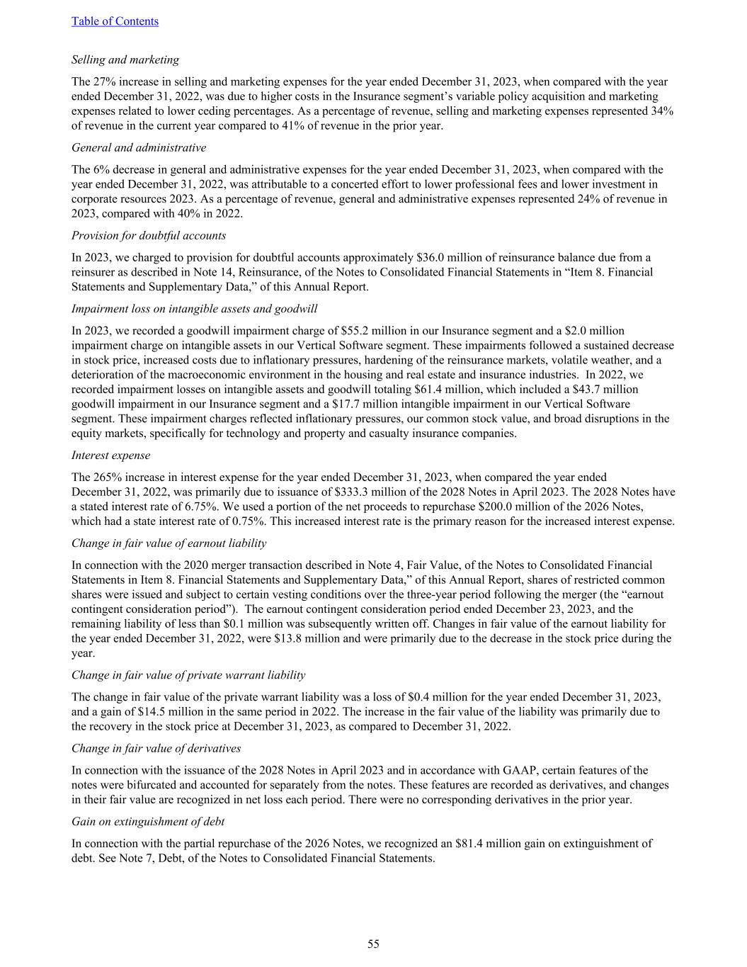 Selling and marketing The 27% increase in selling and marketing expenses for the year ended December 31, 2023, when compared with the year ended December 31, 2022, was due to higher costs in the Insurance segment’s variable policy acquisition and marketing expenses related to lower ceding percentages. As a percentage of revenue, selling and marketing expenses represented 34% of revenue in the current year compared to 41% of revenue in the prior year. General and administrative The 6% decrease in general and administrative expenses for the year ended December 31, 2023, when compared with the year ended December 31, 2022, was attributable to a concerted effort to lower professional fees and lower investment in corporate resources 2023. As a percentage of revenue, general and administrative expenses represented 24% of revenue in 2023, compared with 40% in 2022. Provision for doubtful accounts In 2023, we charged to provision for doubtful accounts approximately $36.0 million of reinsurance balance due from a reinsurer as described in Note 14, Reinsurance, of the Notes to Consolidated Financial Statements in “Item 8. Financial Statements and Supplementary Data,” of this Annual Report. Impairment loss on intangible assets and goodwill In 2023, we recorded a goodwill impairment charge of $55.2 million in our Insurance segment and a $2.0 million impairment charge on intangible assets in our Vertical Software segment. These impairments followed a sustained decrease in stock price, increased costs due to inflationary pressures, hardening of the reinsurance markets, volatile weather, and a deterioration of the macroeconomic environment in the housing and real estate and insurance industries. In 2022, we recorded impairment losses on intangible assets and goodwill totaling $61.4 million, which included a $43.7 million goodwill impairment in our Insurance segment and a $17.7 million intangible impairment in our Vertical Software segment. These impairment charges reflected inflationary pressures, our common stock value, and broad disruptions in the equity markets, specifically for technology and property and casualty insurance companies. Interest expense The 265% increase in interest expense for the year ended December 31, 2023, when compared the year ended December 31, 2022, was primarily due to issuance of $333.3 million of the 2028 Notes in April 2023. The 2028 Notes have a stated interest rate of 6.75%. We used a portion of the net proceeds to repurchase $200.0 million of the 2026 Notes, which had a state interest rate of 0.75%. This increased interest rate is the primary reason for the increased interest expense. Change in fair value of earnout liability In connection with the 2020 merger transaction described in Note 4, Fair Value, of the Notes to Consolidated Financial Statements in Item 8. Financial Statements and Supplementary Data,” of this Annual Report, shares of restricted common shares were issued and subject to certain vesting conditions over the three-year period following the merger (the “earnout contingent consideration period”). The earnout contingent consideration period ended December 23, 2023, and the remaining liability of less than $0.1 million was subsequently written off. Changes in fair value of the earnout liability for the year ended December 31, 2022, were $13.8 million and were primarily due to the decrease in the stock price during the year. Change in fair value of private warrant liability The change in fair value of the private warrant liability was a loss of $0.4 million for the year ended December 31, 2023, and a gain of $14.5 million in the same period in 2022. The increase in the fair value of the liability was primarily due to the recovery in the stock price at December 31, 2023, as compared to December 31, 2022. Change in fair value of derivatives In connection with the issuance of the 2028 Notes in April 2023 and in accordance with GAAP, certain features of the notes were bifurcated and accounted for separately from the notes. These features are recorded as derivatives, and changes in their fair value are recognized in net loss each period. There were no corresponding derivatives in the prior year. Gain on extinguishment of debt In connection with the partial repurchase of the 2026 Notes, we recognized an $81.4 million gain on extinguishment of debt. See Note 7, Debt, of the Notes to Consolidated Financial Statements. Table of Contents 55