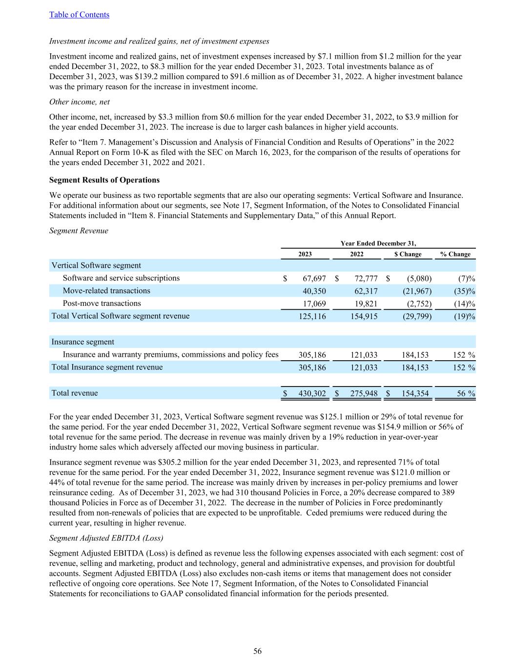 Investment income and realized gains, net of investment expenses Investment income and realized gains, net of investment expenses increased by $7.1 million from $1.2 million for the year ended December 31, 2022, to $8.3 million for the year ended December 31, 2023. Total investments balance as of December 31, 2023, was $139.2 million compared to $91.6 million as of December 31, 2022. A higher investment balance was the primary reason for the increase in investment income. Other income, net Other income, net, increased by $3.3 million from $0.6 million for the year ended December 31, 2022, to $3.9 million for the year ended December 31, 2023. The increase is due to larger cash balances in higher yield accounts. Refer to “Item 7. Management’s Discussion and Analysis of Financial Condition and Results of Operations” in the 2022 Annual Report on Form 10-K as filed with the SEC on March 16, 2023, for the comparison of the results of operations for the years ended December 31, 2022 and 2021. Segment Results of Operations We operate our business as two reportable segments that are also our operating segments: Vertical Software and Insurance. For additional information about our segments, see Note 17, Segment Information, of the Notes to Consolidated Financial Statements included in “Item 8. Financial Statements and Supplementary Data,” of this Annual Report. Segment Revenue Year Ended December 31, 2023 2022 $ Change % Change Vertical Software segment Software and service subscriptions $ 67,697 $ 72,777 $ (5,080) (7) % Move-related transactions 40,350 62,317 (21,967) (35) % Post-move transactions 17,069 19,821 (2,752) (14) % Total Vertical Software segment revenue 125,116 154,915 (29,799) (19) % Insurance segment Insurance and warranty premiums, commissions and policy fees 305,186 121,033 184,153 152 % Total Insurance segment revenue 305,186 121,033 184,153 152 % Total revenue $ 430,302 $ 275,948 $ 154,354 56 % For the year ended December 31, 2023, Vertical Software segment revenue was $125.1 million or 29% of total revenue for the same period. For the year ended December 31, 2022, Vertical Software segment revenue was $154.9 million or 56% of total revenue for the same period. The decrease in revenue was mainly driven by a 19% reduction in year-over-year industry home sales which adversely affected our moving business in particular. Insurance segment revenue was $305.2 million for the year ended December 31, 2023, and represented 71% of total revenue for the same period. For the year ended December 31, 2022, Insurance segment revenue was $121.0 million or 44% of total revenue for the same period. The increase was mainly driven by increases in per-policy premiums and lower reinsurance ceding. As of December 31, 2023, we had 310 thousand Policies in Force, a 20% decrease compared to 389 thousand Policies in Force as of December 31, 2022. The decrease in the number of Policies in Force predominantly resulted from non-renewals of policies that are expected to be unprofitable. Ceded premiums were reduced during the current year, resulting in higher revenue. Segment Adjusted EBITDA (Loss) Segment Adjusted EBITDA (Loss) is defined as revenue less the following expenses associated with each segment: cost of revenue, selling and marketing, product and technology, general and administrative expenses, and provision for doubtful accounts. Segment Adjusted EBITDA (Loss) also excludes non-cash items or items that management does not consider reflective of ongoing core operations. See Note 17, Segment Information, of the Notes to Consolidated Financial Statements for reconciliations to GAAP consolidated financial information for the periods presented. Table of Contents 56