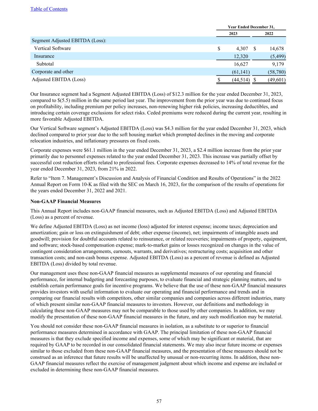 Year Ended December 31, 2023 2022 Segment Adjusted EBITDA (Loss): Vertical Software $ 4,307 $ 14,678 Insurance 12,320 (5,499) Subtotal 16,627 9,179 Corporate and other (61,141) (58,780) Adjusted EBITDA (Loss) $ (44,514) $ (49,601) Our Insurance segment had a Segment Adjusted EBITDA (Loss) of $12.3 million for the year ended December 31, 2023, compared to $(5.5) million in the same period last year. The improvement from the prior year was due to continued focus on profitability, including premium per policy increases, non-renewing higher risk policies, increasing deductibles, and introducing certain coverage exclusions for select risks. Ceded premiums were reduced during the current year, resulting in more favorable Adjusted EBITDA. Our Vertical Software segment’s Adjusted EBITDA (Loss) was $4.3 million for the year ended December 31, 2023, which declined compared to prior year due to the soft housing market which prompted declines in the moving and corporate relocation industries, and inflationary pressures on fixed costs. Corporate expenses were $61.1 million in the year ended December 31, 2023, a $2.4 million increase from the prior year primarily due to personnel expenses related to the year ended December 31, 2023. This increase was partially offset by successful cost reduction efforts related to professional fees. Corporate expenses decreased to 14% of total revenue for the year ended December 31, 2023, from 21% in 2022. Refer to “Item 7. Management’s Discussion and Analysis of Financial Condition and Results of Operations” in the 2022 Annual Report on Form 10-K as filed with the SEC on March 16, 2023, for the comparison of the results of operations for the years ended December 31, 2022 and 2021. Non-GAAP Financial Measures This Annual Report includes non-GAAP financial measures, such as Adjusted EBITDA (Loss) and Adjusted EBITDA (Loss) as a percent of revenue. We define Adjusted EBITDA (Loss) as net income (loss) adjusted for interest expense; income taxes; depreciation and amortization; gain or loss on extinguishment of debt; other expense (income), net; impairments of intangible assets and goodwill; provision for doubtful accounts related to reinsurance, or related recoveries; impairments of property, equipment, and software; stock-based compensation expense; mark-to-market gains or losses recognized on changes in the value of contingent consideration arrangements, earnouts, warrants, and derivatives; restructuring costs; acquisition and other transaction costs; and non-cash bonus expense. Adjusted EBITDA (Loss) as a percent of revenue is defined as Adjusted EBITDA (Loss) divided by total revenue. Our management uses these non-GAAP financial measures as supplemental measures of our operating and financial performance, for internal budgeting and forecasting purposes, to evaluate financial and strategic planning matters, and to establish certain performance goals for incentive programs. We believe that the use of these non-GAAP financial measures provides investors with useful information to evaluate our operating and financial performance and trends and in comparing our financial results with competitors, other similar companies and companies across different industries, many of which present similar non-GAAP financial measures to investors. However, our definitions and methodology in calculating these non-GAAP measures may not be comparable to those used by other companies. In addition, we may modify the presentation of these non-GAAP financial measures in the future, and any such modification may be material. You should not consider these non-GAAP financial measures in isolation, as a substitute to or superior to financial performance measures determined in accordance with GAAP. The principal limitation of these non-GAAP financial measures is that they exclude specified income and expenses, some of which may be significant or material, that are required by GAAP to be recorded in our consolidated financial statements. We may also incur future income or expenses similar to those excluded from these non-GAAP financial measures, and the presentation of these measures should not be construed as an inference that future results will be unaffected by unusual or non-recurring items. In addition, these non- GAAP financial measures reflect the exercise of management judgment about which income and expense are included or excluded in determining these non-GAAP financial measures. Table of Contents 57