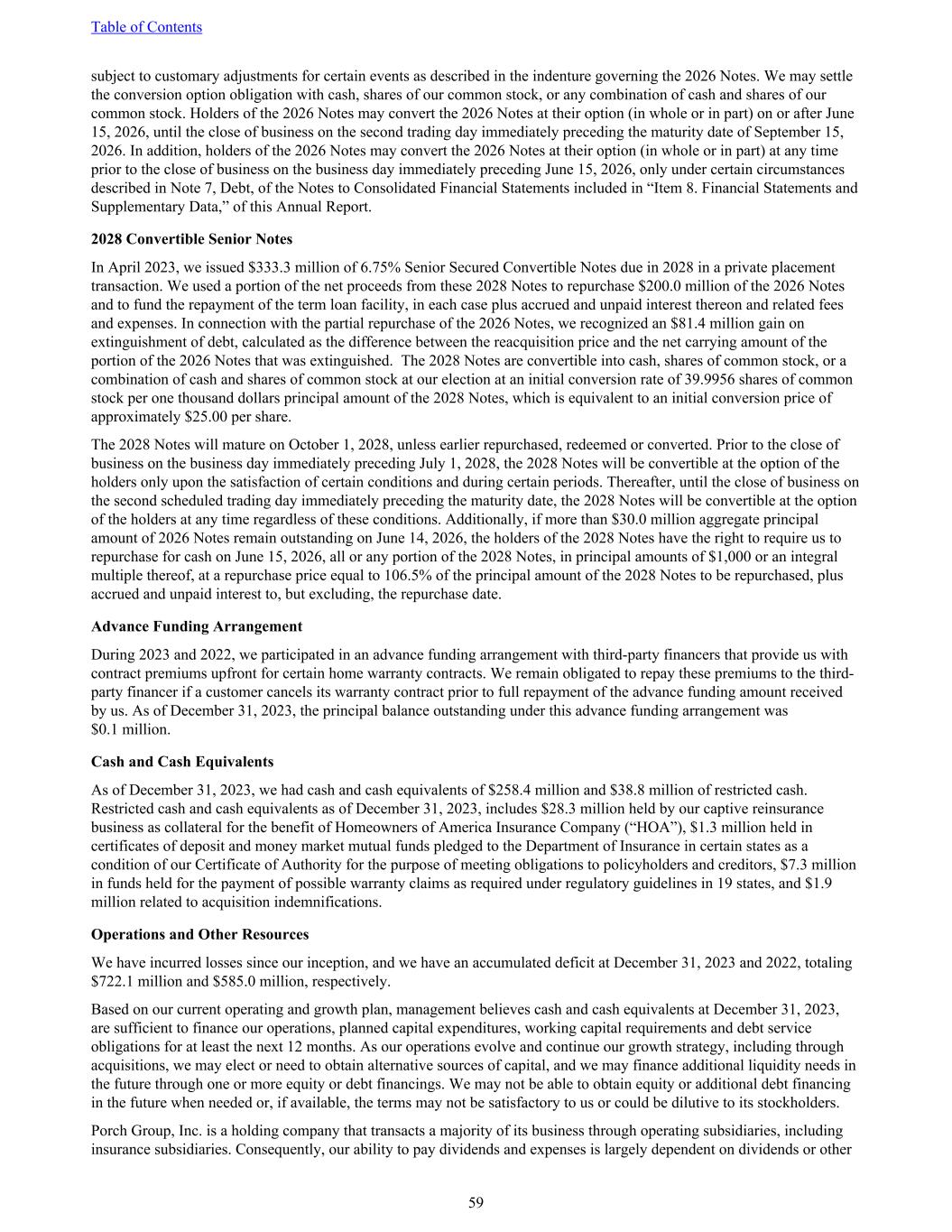 subject to customary adjustments for certain events as described in the indenture governing the 2026 Notes. We may settle the conversion option obligation with cash, shares of our common stock, or any combination of cash and shares of our common stock. Holders of the 2026 Notes may convert the 2026 Notes at their option (in whole or in part) on or after June 15, 2026, until the close of business on the second trading day immediately preceding the maturity date of September 15, 2026. In addition, holders of the 2026 Notes may convert the 2026 Notes at their option (in whole or in part) at any time prior to the close of business on the business day immediately preceding June 15, 2026, only under certain circumstances described in Note 7, Debt, of the Notes to Consolidated Financial Statements included in “Item 8. Financial Statements and Supplementary Data,” of this Annual Report. 2028 Convertible Senior Notes In April 2023, we issued $333.3 million of 6.75% Senior Secured Convertible Notes due in 2028 in a private placement transaction. We used a portion of the net proceeds from these 2028 Notes to repurchase $200.0 million of the 2026 Notes and to fund the repayment of the term loan facility, in each case plus accrued and unpaid interest thereon and related fees and expenses. In connection with the partial repurchase of the 2026 Notes, we recognized an $81.4 million gain on extinguishment of debt, calculated as the difference between the reacquisition price and the net carrying amount of the portion of the 2026 Notes that was extinguished. The 2028 Notes are convertible into cash, shares of common stock, or a combination of cash and shares of common stock at our election at an initial conversion rate of 39.9956 shares of common stock per one thousand dollars principal amount of the 2028 Notes, which is equivalent to an initial conversion price of approximately $25.00 per share. The 2028 Notes will mature on October 1, 2028, unless earlier repurchased, redeemed or converted. Prior to the close of business on the business day immediately preceding July 1, 2028, the 2028 Notes will be convertible at the option of the holders only upon the satisfaction of certain conditions and during certain periods. Thereafter, until the close of business on the second scheduled trading day immediately preceding the maturity date, the 2028 Notes will be convertible at the option of the holders at any time regardless of these conditions. Additionally, if more than $30.0 million aggregate principal amount of 2026 Notes remain outstanding on June 14, 2026, the holders of the 2028 Notes have the right to require us to repurchase for cash on June 15, 2026, all or any portion of the 2028 Notes, in principal amounts of $1,000 or an integral multiple thereof, at a repurchase price equal to 106.5% of the principal amount of the 2028 Notes to be repurchased, plus accrued and unpaid interest to, but excluding, the repurchase date. Advance Funding Arrangement During 2023 and 2022, we participated in an advance funding arrangement with third-party financers that provide us with contract premiums upfront for certain home warranty contracts. We remain obligated to repay these premiums to the third- party financer if a customer cancels its warranty contract prior to full repayment of the advance funding amount received by us. As of December 31, 2023, the principal balance outstanding under this advance funding arrangement was $0.1 million. Cash and Cash Equivalents As of December 31, 2023, we had cash and cash equivalents of $258.4 million and $38.8 million of restricted cash. Restricted cash and cash equivalents as of December 31, 2023, includes $28.3 million held by our captive reinsurance business as collateral for the benefit of Homeowners of America Insurance Company (“HOA”), $1.3 million held in certificates of deposit and money market mutual funds pledged to the Department of Insurance in certain states as a condition of our Certificate of Authority for the purpose of meeting obligations to policyholders and creditors, $7.3 million in funds held for the payment of possible warranty claims as required under regulatory guidelines in 19 states, and $1.9 million related to acquisition indemnifications. Operations and Other Resources We have incurred losses since our inception, and we have an accumulated deficit at December 31, 2023 and 2022, totaling $722.1 million and $585.0 million, respectively. Based on our current operating and growth plan, management believes cash and cash equivalents at December 31, 2023, are sufficient to finance our operations, planned capital expenditures, working capital requirements and debt service obligations for at least the next 12 months. As our operations evolve and continue our growth strategy, including through acquisitions, we may elect or need to obtain alternative sources of capital, and we may finance additional liquidity needs in the future through one or more equity or debt financings. We may not be able to obtain equity or additional debt financing in the future when needed or, if available, the terms may not be satisfactory to us or could be dilutive to its stockholders. Porch Group, Inc. is a holding company that transacts a majority of its business through operating subsidiaries, including insurance subsidiaries. Consequently, our ability to pay dividends and expenses is largely dependent on dividends or other Table of Contents 59