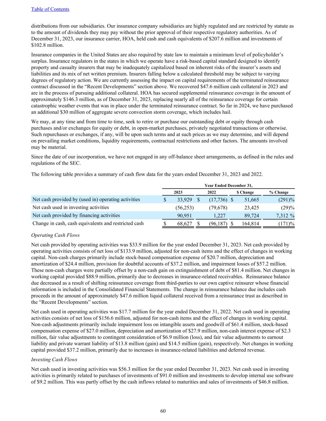 distributions from our subsidiaries. Our insurance company subsidiaries are highly regulated and are restricted by statute as to the amount of dividends they may pay without the prior approval of their respective regulatory authorities. As of December 31, 2023, our insurance carrier, HOA, held cash and cash equivalents of $207.6 million and investments of $102.8 million. Insurance companies in the United States are also required by state law to maintain a minimum level of policyholder’s surplus. Insurance regulators in the states in which we operate have a risk-based capital standard designed to identify property and casualty insurers that may be inadequately capitalized based on inherent risks of the insurer’s assets and liabilities and its mix of net written premium. Insurers falling below a calculated threshold may be subject to varying degrees of regulatory action. We are currently assessing the impact on capital requirements of the terminated reinsurance contract discussed in the “Recent Developments” section above. We recovered $47.6 million cash collateral in 2023 and are in the process of pursuing additional collateral. HOA has secured supplemental reinsurance coverage in the amount of approximately $146.3 million, as of December 31, 2023, replacing nearly all of the reinsurance coverage for certain catastrophic weather events that was in place under the terminated reinsurance contract. So far in 2024, we have purchased an additional $30 million of aggregate severe convection storm coverage, which includes hail. We may, at any time and from time to time, seek to retire or purchase our outstanding debt or equity through cash purchases and/or exchanges for equity or debt, in open-market purchases, privately negotiated transactions or otherwise. Such repurchases or exchanges, if any, will be upon such terms and at such prices as we may determine, and will depend on prevailing market conditions, liquidity requirements, contractual restrictions and other factors. The amounts involved may be material. Since the date of our incorporation, we have not engaged in any off-balance sheet arrangements, as defined in the rules and regulations of the SEC. The following table provides a summary of cash flow data for the years ended December 31, 2023 and 2022. Year Ended December 31, 2023 2022 $ Change % Change Net cash provided by (used in) operating activities $ 33,929 $ (17,736) $ 51,665 (291) % Net cash used in investing activities (56,253) (79,678) 23,425 (29) % Net cash provided by financing activities 90,951 1,227 89,724 7,312 % Change in cash, cash equivalents and restricted cash $ 68,627 $ (96,187) $ 164,814 (171) % Operating Cash Flows Net cash provided by operating activities was $33.9 million for the year ended December 31, 2023. Net cash provided by operating activities consists of net loss of $133.9 million, adjusted for non-cash items and the effect of changes in working capital. Non-cash charges primarily include stock-based compensation expense of $20.7 million, depreciation and amortization of $24.4 million, provision for doubtful accounts of $37.2 million, and impairment losses of $57.2 million. These non-cash charges were partially offset by a non-cash gain on extinguishment of debt of $81.4 million. Net changes in working capital provided $88.9 million, primarily due to decreases in insurance-related receivables. Reinsurance balance due decreased as a result of shifting reinsurance coverage from third-parties to our own captive reinsurer whose financial information is included in the Consolidated Financial Statements. The change in reinsurance balance due includes cash proceeds in the amount of approximately $47.6 million liquid collateral received from a reinsurance trust as described in the “Recent Developments” section. Net cash used in operating activities was $17.7 million for the year ended December 31, 2022. Net cash used in operating activities consists of net loss of $156.6 million, adjusted for non-cash items and the effect of changes in working capital. Non-cash adjustments primarily include impairment loss on intangible assets and goodwill of $61.4 million, stock-based compensation expense of $27.0 million, depreciation and amortization of $27.9 million, non-cash interest expense of $2.3 million, fair value adjustments to contingent consideration of $6.9 million (loss), and fair value adjustments to earnout liability and private warrant liability of $13.8 million (gain) and $14.5 million (gain), respectively. Net changes in working capital provided $37.2 million, primarily due to increases in insurance-related liabilities and deferred revenue. Investing Cash Flows Net cash used in investing activities was $56.3 million for the year ended December 31, 2023. Net cash used in investing activities is primarily related to purchases of investments of $91.0 million and investments to develop internal use software of $9.2 million. This was partly offset by the cash inflows related to maturities and sales of investments of $46.8 million. Table of Contents 60