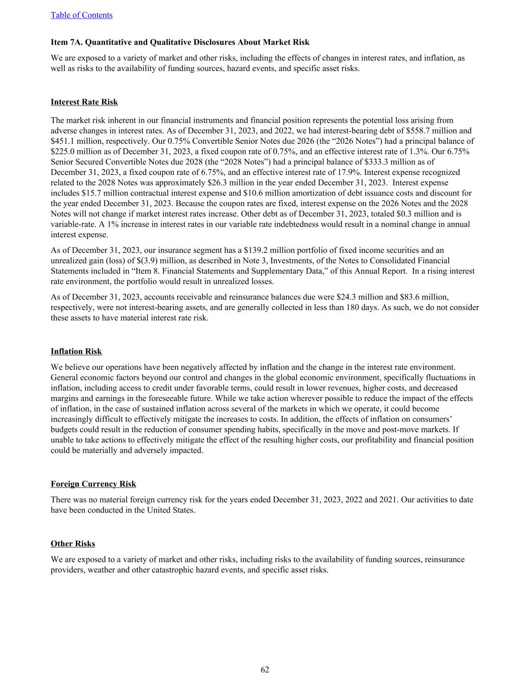 Item 7A. Quantitative and Qualitative Disclosures About Market Risk We are exposed to a variety of market and other risks, including the effects of changes in interest rates, and inflation, as well as risks to the availability of funding sources, hazard events, and specific asset risks. Interest Rate Risk The market risk inherent in our financial instruments and financial position represents the potential loss arising from adverse changes in interest rates. As of December 31, 2023, and 2022, we had interest-bearing debt of $558.7 million and $451.1 million, respectively. Our 0.75% Convertible Senior Notes due 2026 (the “2026 Notes”) had a principal balance of $225.0 million as of December 31, 2023, a fixed coupon rate of 0.75%, and an effective interest rate of 1.3%. Our 6.75% Senior Secured Convertible Notes due 2028 (the “2028 Notes”) had a principal balance of $333.3 million as of December 31, 2023, a fixed coupon rate of 6.75%, and an effective interest rate of 17.9%. Interest expense recognized related to the 2028 Notes was approximately $26.3 million in the year ended December 31, 2023. Interest expense includes $15.7 million contractual interest expense and $10.6 million amortization of debt issuance costs and discount for the year ended December 31, 2023. Because the coupon rates are fixed, interest expense on the 2026 Notes and the 2028 Notes will not change if market interest rates increase. Other debt as of December 31, 2023, totaled $0.3 million and is variable-rate. A 1% increase in interest rates in our variable rate indebtedness would result in a nominal change in annual interest expense. As of December 31, 2023, our insurance segment has a $139.2 million portfolio of fixed income securities and an unrealized gain (loss) of $(3.9) million, as described in Note 3, Investments, of the Notes to Consolidated Financial Statements included in “Item 8. Financial Statements and Supplementary Data,” of this Annual Report. In a rising interest rate environment, the portfolio would result in unrealized losses. As of December 31, 2023, accounts receivable and reinsurance balances due were $24.3 million and $83.6 million, respectively, were not interest-bearing assets, and are generally collected in less than 180 days. As such, we do not consider these assets to have material interest rate risk. Inflation Risk We believe our operations have been negatively affected by inflation and the change in the interest rate environment. General economic factors beyond our control and changes in the global economic environment, specifically fluctuations in inflation, including access to credit under favorable terms, could result in lower revenues, higher costs, and decreased margins and earnings in the foreseeable future. While we take action wherever possible to reduce the impact of the effects of inflation, in the case of sustained inflation across several of the markets in which we operate, it could become increasingly difficult to effectively mitigate the increases to costs. In addition, the effects of inflation on consumers’ budgets could result in the reduction of consumer spending habits, specifically in the move and post-move markets. If unable to take actions to effectively mitigate the effect of the resulting higher costs, our profitability and financial position could be materially and adversely impacted. Foreign Currency Risk There was no material foreign currency risk for the years ended December 31, 2023, 2022 and 2021. Our activities to date have been conducted in the United States. Other Risks We are exposed to a variety of market and other risks, including risks to the availability of funding sources, reinsurance providers, weather and other catastrophic hazard events, and specific asset risks. Table of Contents 62