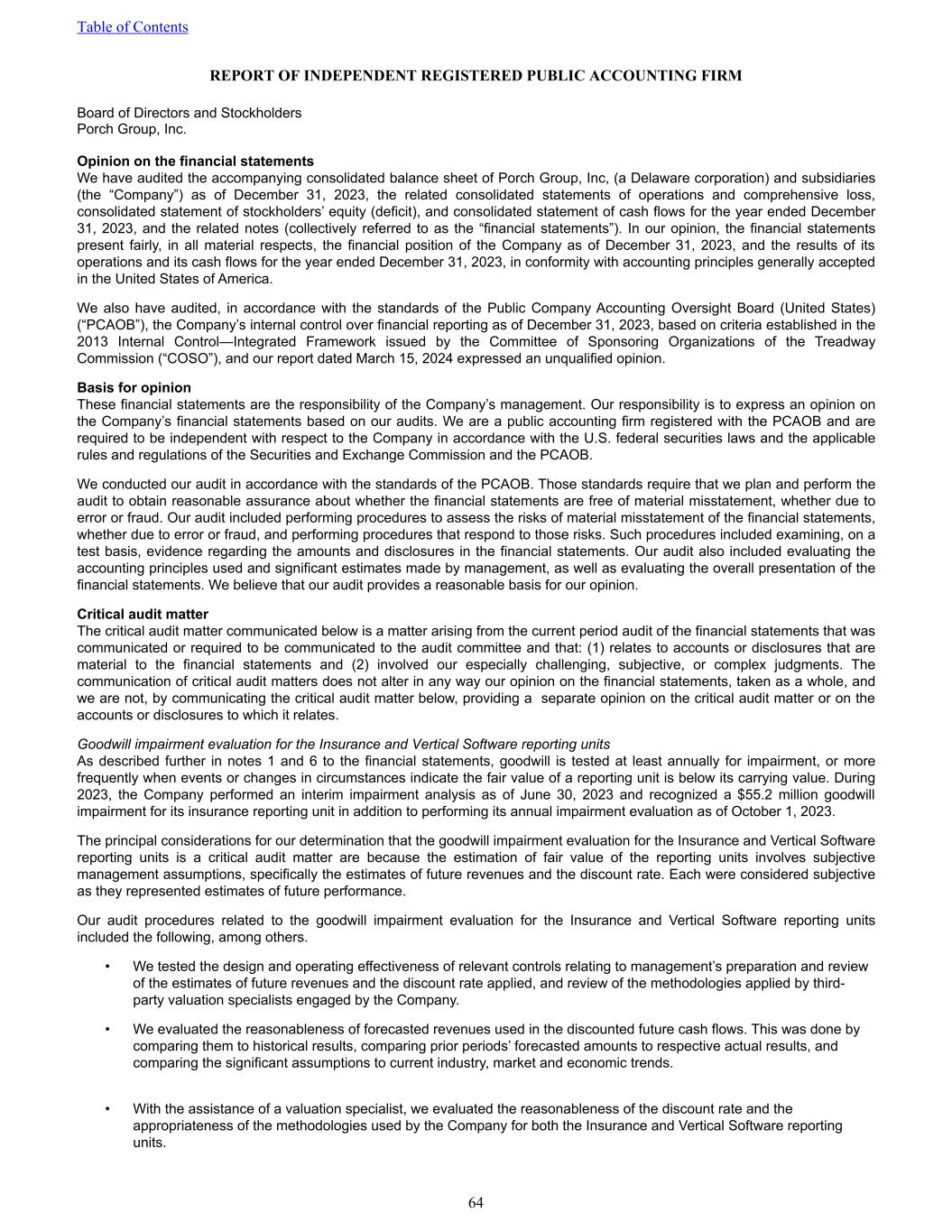 REPORT OF INDEPENDENT REGISTERED PUBLIC ACCOUNTING FIRM Board of Directors and Stockholders Porch Group, Inc. Opinion on the financial statements We have audited the accompanying consolidated balance sheet of Porch Group, Inc, (a Delaware corporation) and subsidiaries (the “Company”) as of December 31, 2023, the related consolidated statements of operations and comprehensive loss, consolidated statement of stockholders’ equity (deficit), and consolidated statement of cash flows for the year ended December 31, 2023, and the related notes (collectively referred to as the “financial statements”). In our opinion, the financial statements present fairly, in all material respects, the financial position of the Company as of December 31, 2023, and the results of its operations and its cash flows for the year ended December 31, 2023, in conformity with accounting principles generally accepted in the United States of America. We also have audited, in accordance with the standards of the Public Company Accounting Oversight Board (United States) (“PCAOB”), the Company’s internal control over financial reporting as of December 31, 2023, based on criteria established in the 2013 Internal Control—Integrated Framework issued by the Committee of Sponsoring Organizations of the Treadway Commission (“COSO”), and our report dated March 15, 2024 expressed an unqualified opinion. Basis for opinion These financial statements are the responsibility of the Company’s management. Our responsibility is to express an opinion on the Company’s financial statements based on our audits. We are a public accounting firm registered with the PCAOB and are required to be independent with respect to the Company in accordance with the U.S. federal securities laws and the applicable rules and regulations of the Securities and Exchange Commission and the PCAOB. We conducted our audit in accordance with the standards of the PCAOB. Those standards require that we plan and perform the audit to obtain reasonable assurance about whether the financial statements are free of material misstatement, whether due to error or fraud. Our audit included performing procedures to assess the risks of material misstatement of the financial statements, whether due to error or fraud, and performing procedures that respond to those risks. Such procedures included examining, on a test basis, evidence regarding the amounts and disclosures in the financial statements. Our audit also included evaluating the accounting principles used and significant estimates made by management, as well as evaluating the overall presentation of the financial statements. We believe that our audit provides a reasonable basis for our opinion. Critical audit matter The critical audit matter communicated below is a matter arising from the current period audit of the financial statements that was communicated or required to be communicated to the audit committee and that: (1) relates to accounts or disclosures that are material to the financial statements and (2) involved our especially challenging, subjective, or complex judgments. The communication of critical audit matters does not alter in any way our opinion on the financial statements, taken as a whole, and we are not, by communicating the critical audit matter below, providing a separate opinion on the critical audit matter or on the accounts or disclosures to which it relates. Goodwill impairment evaluation for the Insurance and Vertical Software reporting units As described further in notes 1 and 6 to the financial statements, goodwill is tested at least annually for impairment, or more frequently when events or changes in circumstances indicate the fair value of a reporting unit is below its carrying value. During 2023, the Company performed an interim impairment analysis as of June 30, 2023 and recognized a $55.2 million goodwill impairment for its insurance reporting unit in addition to performing its annual impairment evaluation as of October 1, 2023. The principal considerations for our determination that the goodwill impairment evaluation for the Insurance and Vertical Software reporting units is a critical audit matter are because the estimation of fair value of the reporting units involves subjective management assumptions, specifically the estimates of future revenues and the discount rate. Each were considered subjective as they represented estimates of future performance. Our audit procedures related to the goodwill impairment evaluation for the Insurance and Vertical Software reporting units included the following, among others. • We tested the design and operating effectiveness of relevant controls relating to management’s preparation and review of the estimates of future revenues and the discount rate applied, and review of the methodologies applied by third- party valuation specialists engaged by the Company. • We evaluated the reasonableness of forecasted revenues used in the discounted future cash flows. This was done by comparing them to historical results, comparing prior periods’ forecasted amounts to respective actual results, and comparing the significant assumptions to current industry, market and economic trends. • With the assistance of a valuation specialist, we evaluated the reasonableness of the discount rate and the appropriateness of the methodologies used by the Company for both the Insurance and Vertical Software reporting units. Table of Contents 64