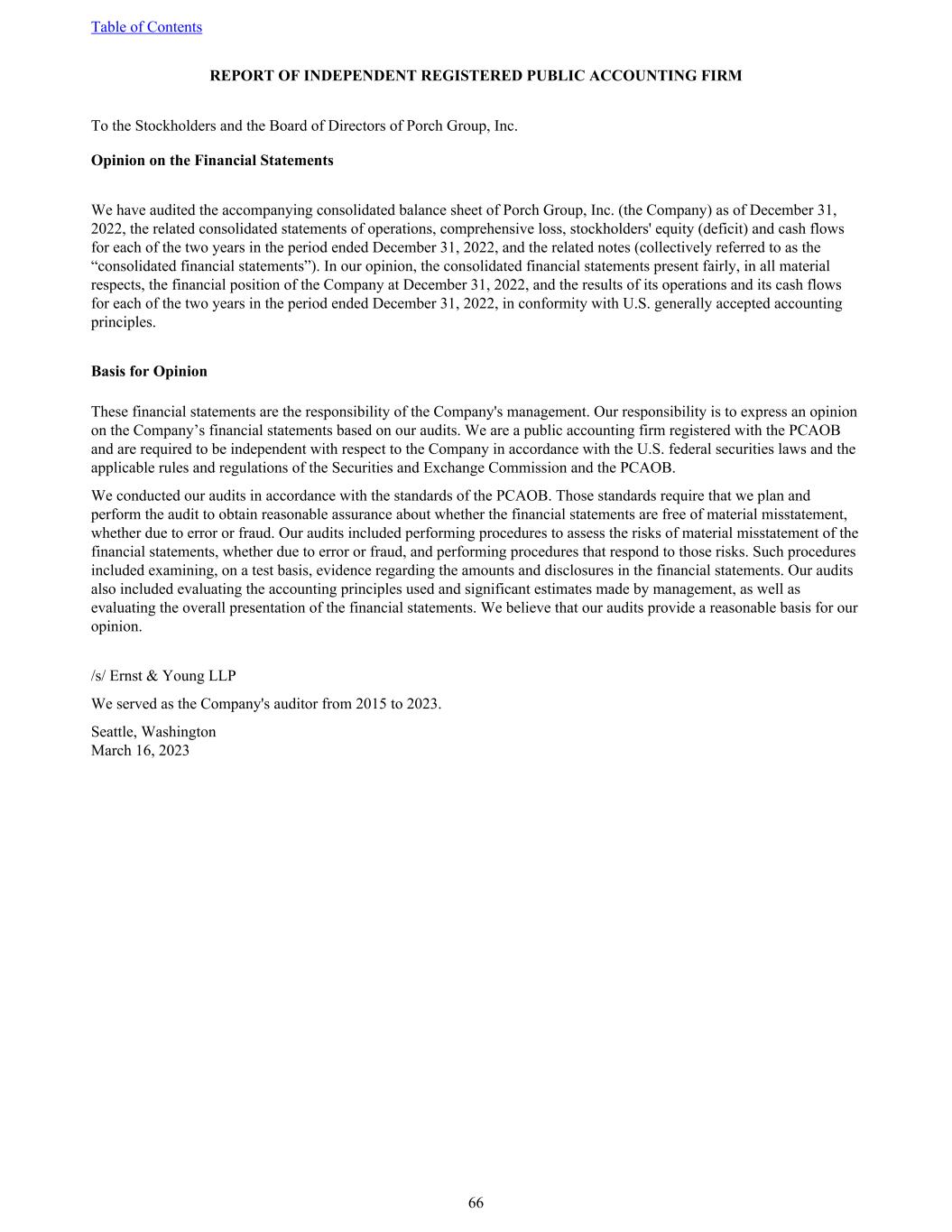 REPORT OF INDEPENDENT REGISTERED PUBLIC ACCOUNTING FIRM To the Stockholders and the Board of Directors of Porch Group, Inc. Opinion on the Financial Statements We have audited the accompanying consolidated balance sheet of Porch Group, Inc. (the Company) as of December 31, 2022, the related consolidated statements of operations, comprehensive loss, stockholders' equity (deficit) and cash flows for each of the two years in the period ended December 31, 2022, and the related notes (collectively referred to as the “consolidated financial statements”). In our opinion, the consolidated financial statements present fairly, in all material respects, the financial position of the Company at December 31, 2022, and the results of its operations and its cash flows for each of the two years in the period ended December 31, 2022, in conformity with U.S. generally accepted accounting principles. Basis for Opinion These financial statements are the responsibility of the Company's management. Our responsibility is to express an opinion on the Company’s financial statements based on our audits. We are a public accounting firm registered with the PCAOB and are required to be independent with respect to the Company in accordance with the U.S. federal securities laws and the applicable rules and regulations of the Securities and Exchange Commission and the PCAOB. We conducted our audits in accordance with the standards of the PCAOB. Those standards require that we plan and perform the audit to obtain reasonable assurance about whether the financial statements are free of material misstatement, whether due to error or fraud. Our audits included performing procedures to assess the risks of material misstatement of the financial statements, whether due to error or fraud, and performing procedures that respond to those risks. Such procedures included examining, on a test basis, evidence regarding the amounts and disclosures in the financial statements. Our audits also included evaluating the accounting principles used and significant estimates made by management, as well as evaluating the overall presentation of the financial statements. We believe that our audits provide a reasonable basis for our opinion. /s/ Ernst & Young LLP We served as the Company's auditor from 2015 to 2023. Seattle, Washington March 16, 2023 Table of Contents 66