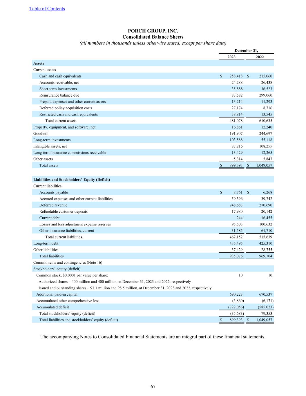 PORCH GROUP, INC. Consolidated Balance Sheets (all numbers in thousands unless otherwise stated, except per share data) December 31, 2023 2022 Assets Current assets Cash and cash equivalents $ 258,418 $ 215,060 Accounts receivable, net 24,288 26,438 Short-term investments 35,588 36,523 Reinsurance balance due 83,582 299,060 Prepaid expenses and other current assets 13,214 11,293 Deferred policy acquisition costs 27,174 8,716 Restricted cash and cash equivalents 38,814 13,545 Total current assets 481,078 610,635 Property, equipment, and software, net 16,861 12,240 Goodwill 191,907 244,697 Long-term investments 103,588 55,118 Intangible assets, net 87,216 108,255 Long-term insurance commissions receivable 13,429 12,265 Other assets 5,314 5,847 Total assets $ 899,393 $ 1,049,057 Liabilities and Stockholders’ Equity (Deficit) Current liabilities Accounts payable $ 8,761 $ 6,268 Accrued expenses and other current liabilities 59,396 39,742 Deferred revenue 248,683 270,690 Refundable customer deposits 17,980 20,142 Current debt 244 16,455 Losses and loss adjustment expense reserves 95,503 100,632 Other insurance liabilities, current 31,585 61,710 Total current liabilities 462,152 515,639 Long-term debt 435,495 425,310 Other liabilities 37,429 28,755 Total liabilities 935,076 969,704 Commitments and contingencies (Note 16) Stockholders’ equity (deficit) Common stock, $0.0001 par value per share: 10 10 Authorized shares – 400 million and 400 million, at December 31, 2023 and 2022, respectively Issued and outstanding shares – 97.1 million and 98.5 million, at December 31, 2023 and 2022, respectively Additional paid-in capital 690,223 670,537 Accumulated other comprehensive loss (3,860) (6,171) Accumulated deficit (722,056) (585,023) Total stockholders’ equity (deficit) (35,683) 79,353 Total liabilities and stockholders’ equity (deficit) $ 899,393 $ 1,049,057 The accompanying Notes to Consolidated Financial Statements are an integral part of these financial statements. Table of Contents 67