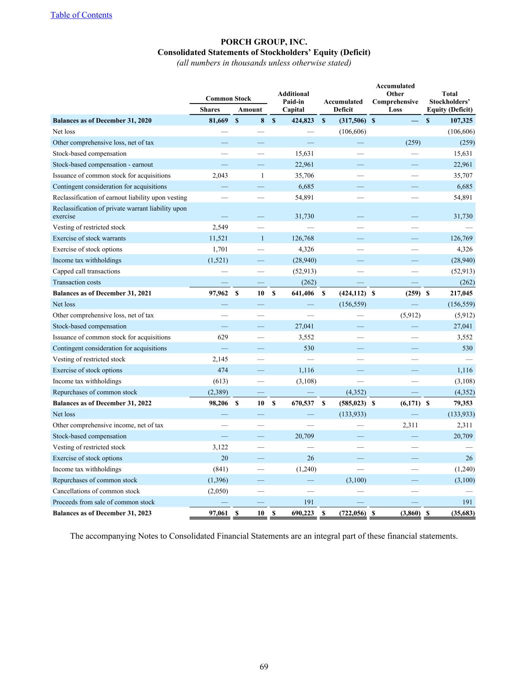 PORCH GROUP, INC. Consolidated Statements of Stockholders’ Equity (Deficit) (all numbers in thousands unless otherwise stated) Common Stock Additional Paid-in Capital Accumulated Deficit Accumulated Other Comprehensive Loss Total Stockholders’ Equity (Deficit)Shares Amount Balances as of December 31, 2020 81,669 $ 8 $ 424,823 $ (317,506) $ — $ 107,325 Net loss — — — (106,606) (106,606) Other comprehensive loss, net of tax — — — — (259) (259) Stock-based compensation — — 15,631 — — 15,631 Stock-based compensation - earnout — — 22,961 — — 22,961 Issuance of common stock for acquisitions 2,043 1 35,706 — — 35,707 Contingent consideration for acquisitions — — 6,685 — — 6,685 Reclassification of earnout liability upon vesting — — 54,891 — — 54,891 Reclassification of private warrant liability upon exercise — — 31,730 — — 31,730 Vesting of restricted stock 2,549 — — — — — Exercise of stock warrants 11,521 1 126,768 — — 126,769 Exercise of stock options 1,701 — 4,326 — — 4,326 Income tax withholdings (1,521) — (28,940) — — (28,940) Capped call transactions — — (52,913) — — (52,913) Transaction costs — — (262) — — (262) Balances as of December 31, 2021 97,962 $ 10 $ 641,406 $ (424,112) $ (259) $ 217,045 Net loss — — — (156,559) — (156,559) Other comprehensive loss, net of tax — — — — (5,912) (5,912) Stock-based compensation — — 27,041 — — 27,041 Issuance of common stock for acquisitions 629 — 3,552 — — 3,552 Contingent consideration for acquisitions — — 530 — — 530 Vesting of restricted stock 2,145 — — — — — Exercise of stock options 474 — 1,116 — — 1,116 Income tax withholdings (613) — (3,108) — — (3,108) Repurchases of common stock (2,389) — — (4,352) — (4,352) Balances as of December 31, 2022 98,206 $ 10 $ 670,537 $ (585,023) $ (6,171) $ 79,353 Net loss — — — (133,933) — (133,933) Other comprehensive income, net of tax — — — — 2,311 2,311 Stock-based compensation — — 20,709 — — 20,709 Vesting of restricted stock 3,122 — — — — — Exercise of stock options 20 — 26 — — 26 Income tax withholdings (841) — (1,240) — — (1,240) Repurchases of common stock (1,396) — — (3,100) — (3,100) Cancellations of common stock (2,050) — — — — — Proceeds from sale of common stock — — 191 — — 191 Balances as of December 31, 2023 97,061 $ 10 $ 690,223 $ (722,056) $ (3,860) $ (35,683) The accompanying Notes to Consolidated Financial Statements are an integral part of these financial statements. Table of Contents 69