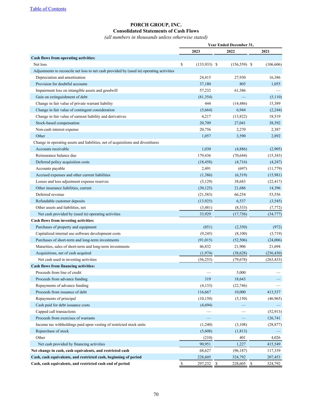 PORCH GROUP, INC. Consolidated Statements of Cash Flows (all numbers in thousands unless otherwise stated) Year Ended December 31, 2023 2022 2021 Cash flows from operating activities: Net loss $ (133,933) $ (156,559) $ (106,606) Adjustments to reconcile net loss to net cash provided by (used in) operating activities Depreciation and amortization 24,415 27,930 16,386 Provision for doubtful accounts 37,180 805 1,055 Impairment loss on intangible assets and goodwill 57,232 61,386 — Gain on extinguishment of debt (81,354) — (5,110) Change in fair value of private warrant liability 444 (14,486) 15,389 Change in fair value of contingent consideration (5,664) 6,944 (2,244) Change in fair value of earnout liability and derivatives 4,217 (13,822) 18,519 Stock-based compensation 20,709 27,041 38,592 Non-cash interest expense 20,756 2,270 2,387 Other 1,057 3,590 2,892 Change in operating assets and liabilities, net of acquisitions and divestitures Accounts receivable 1,030 (4,886) (2,905) Reinsurance balance due 179,436 (70,644) (15,343) Deferred policy acquisition costs (18,458) (4,716) (4,247) Accounts payable 2,491 (697) (11,779) Accrued expenses and other current liabilities (1,386) (6,519) (15,981) Losses and loss adjustment expense reserves (5,129) 38,683 (22,417) Other insurance liabilities, current (30,125) 21,686 14,396 Deferred revenue (21,583) 66,254 53,556 Refundable customer deposits (13,925) 6,537 (3,545) Other assets and liabilities, net (3,481) (8,533) (7,772) Net cash provided by (used in) operating activities 33,929 (17,736) (34,777) Cash flows from investing activities: Purchases of property and equipment (851) (2,350) (972) Capitalized internal use software development costs (9,245) (8,100) (3,719) Purchases of short-term and long-term investments (91,015) (52,506) (24,006) Maturities, sales of short-term and long-term investments 46,832 21,906 21,694 Acquisitions, net of cash acquired (1,974) (38,628) (256,430) Net cash used in investing activities (56,253) (79,678) (263,433) Cash flows from financing activities: Proceeds from line of credit — 5,000 — Proceeds from advance funding 319 18,643 — Repayments of advance funding (4,133) (22,746) — Proceeds from issuance of debt 116,667 10,000 413,537 Repayments of principal (10,150) (5,150) (46,965) Cash paid for debt issuance costs (4,694) — — Capped call transactions — — (52,913) Proceeds from exercises of warrants — — 126,741 Income tax withholdings paid upon vesting of restricted stock units (1,240) (3,108) (28,877) Repurchase of stock (5,608) (1,813) — Other (210) 401 4,026 Net cash provided by financing activities 90,951 1,227 415,549 Net change in cash, cash equivalents, and restricted cash 68,627 (96,187) 117,339 Cash, cash equivalents, and restricted cash, beginning of period 228,605 324,792 207,453 Cash, cash equivalents, and restricted cash end of period $ 297,232 $ 228,605 $ 324,792 Table of Contents 70