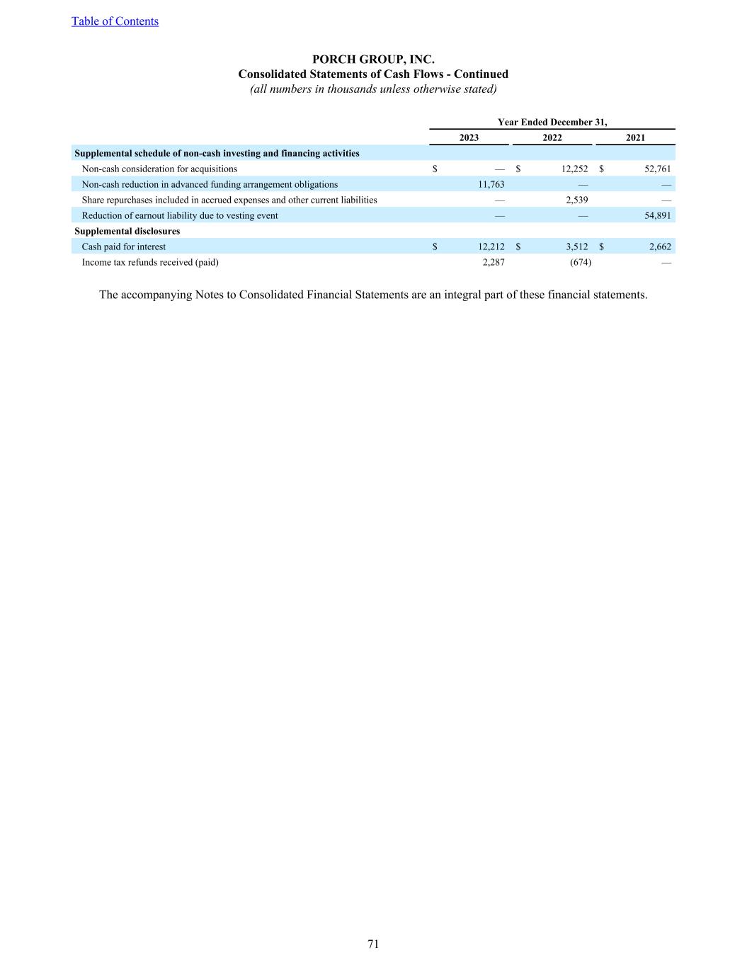 PORCH GROUP, INC. Consolidated Statements of Cash Flows - Continued (all numbers in thousands unless otherwise stated) Year Ended December 31, 2023 2022 2021 Supplemental schedule of non-cash investing and financing activities Non-cash consideration for acquisitions $ — $ 12,252 $ 52,761 Non-cash reduction in advanced funding arrangement obligations 11,763 — — Share repurchases included in accrued expenses and other current liabilities — 2,539 — Reduction of earnout liability due to vesting event — — 54,891 Supplemental disclosures Cash paid for interest $ 12,212 $ 3,512 $ 2,662 Income tax refunds received (paid) 2,287 (674) — The accompanying Notes to Consolidated Financial Statements are an integral part of these financial statements. Table of Contents 71