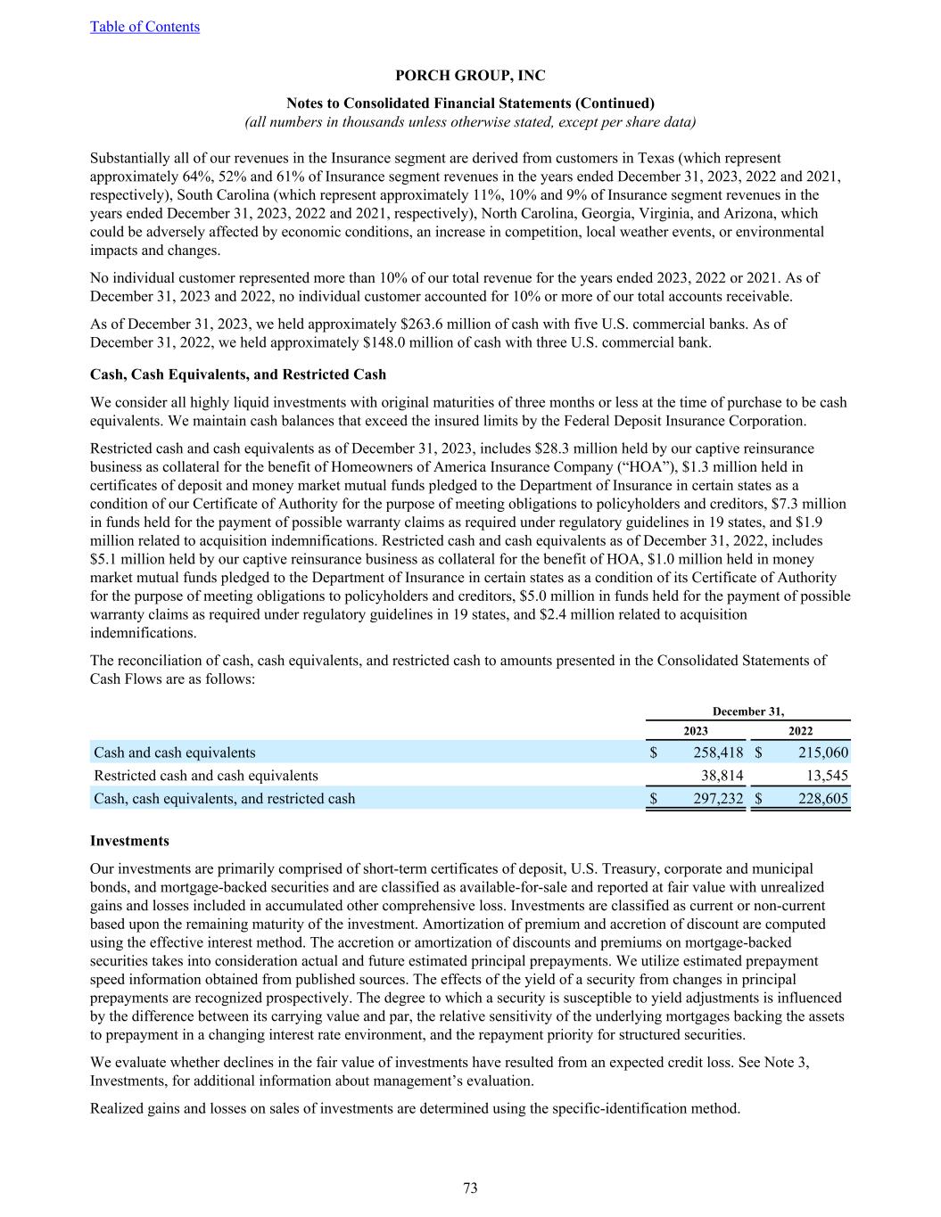 Substantially all of our revenues in the Insurance segment are derived from customers in Texas (which represent approximately 64%, 52% and 61% of Insurance segment revenues in the years ended December 31, 2023, 2022 and 2021, respectively), South Carolina (which represent approximately 11%, 10% and 9% of Insurance segment revenues in the years ended December 31, 2023, 2022 and 2021, respectively), North Carolina, Georgia, Virginia, and Arizona, which could be adversely affected by economic conditions, an increase in competition, local weather events, or environmental impacts and changes. No individual customer represented more than 10% of our total revenue for the years ended 2023, 2022 or 2021. As of December 31, 2023 and 2022, no individual customer accounted for 10% or more of our total accounts receivable. As of December 31, 2023, we held approximately $263.6 million of cash with five U.S. commercial banks. As of December 31, 2022, we held approximately $148.0 million of cash with three U.S. commercial bank. Cash, Cash Equivalents, and Restricted Cash We consider all highly liquid investments with original maturities of three months or less at the time of purchase to be cash equivalents. We maintain cash balances that exceed the insured limits by the Federal Deposit Insurance Corporation. Restricted cash and cash equivalents as of December 31, 2023, includes $28.3 million held by our captive reinsurance business as collateral for the benefit of Homeowners of America Insurance Company (“HOA”), $1.3 million held in certificates of deposit and money market mutual funds pledged to the Department of Insurance in certain states as a condition of our Certificate of Authority for the purpose of meeting obligations to policyholders and creditors, $7.3 million in funds held for the payment of possible warranty claims as required under regulatory guidelines in 19 states, and $1.9 million related to acquisition indemnifications. Restricted cash and cash equivalents as of December 31, 2022, includes $5.1 million held by our captive reinsurance business as collateral for the benefit of HOA, $1.0 million held in money market mutual funds pledged to the Department of Insurance in certain states as a condition of its Certificate of Authority for the purpose of meeting obligations to policyholders and creditors, $5.0 million in funds held for the payment of possible warranty claims as required under regulatory guidelines in 19 states, and $2.4 million related to acquisition indemnifications. The reconciliation of cash, cash equivalents, and restricted cash to amounts presented in the Consolidated Statements of Cash Flows are as follows: December 31, 2023 2022 Cash and cash equivalents $ 258,418 $ 215,060 Restricted cash and cash equivalents 38,814 13,545 Cash, cash equivalents, and restricted cash $ 297,232 $ 228,605 Investments Our investments are primarily comprised of short-term certificates of deposit, U.S. Treasury, corporate and municipal bonds, and mortgage-backed securities and are classified as available-for-sale and reported at fair value with unrealized gains and losses included in accumulated other comprehensive loss. Investments are classified as current or non-current based upon the remaining maturity of the investment. Amortization of premium and accretion of discount are computed using the effective interest method. The accretion or amortization of discounts and premiums on mortgage-backed securities takes into consideration actual and future estimated principal prepayments. We utilize estimated prepayment speed information obtained from published sources. The effects of the yield of a security from changes in principal prepayments are recognized prospectively. The degree to which a security is susceptible to yield adjustments is influenced by the difference between its carrying value and par, the relative sensitivity of the underlying mortgages backing the assets to prepayment in a changing interest rate environment, and the repayment priority for structured securities. We evaluate whether declines in the fair value of investments have resulted from an expected credit loss. See Note 3, Investments, for additional information about management’s evaluation. Realized gains and losses on sales of investments are determined using the specific-identification method. Table of Contents PORCH GROUP, INC Notes to Consolidated Financial Statements (Continued) (all numbers in thousands unless otherwise stated, except per share data) 73