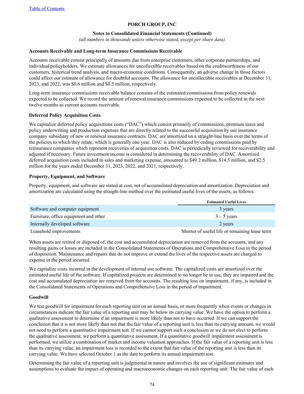 Accounts Receivable and Long-term Insurance Commissions Receivable Accounts receivable consist principally of amounts due from enterprise customers, other corporate partnerships, and individual policyholders. We estimate allowances for uncollectible receivables based on the creditworthiness of our customers, historical trend analysis, and macro-economic conditions. Consequently, an adverse change in those factors could affect our estimate of allowance for doubtful accounts. The allowance for uncollectible receivables at December 31, 2023, and 2022, was $0.6 million and $0.5 million, respectively. Long-term insurance commissions receivable balance consists of the estimated commissions from policy renewals expected to be collected. We record the amount of renewal insurance commissions expected to be collected in the next twelve months as current accounts receivable. Deferred Policy Acquisition Costs We capitalize deferred policy acquisitions costs (“DAC”) which consist primarily of commissions, premium taxes and policy underwriting and production expenses that are directly related to the successful acquisition by our insurance company subsidiary of new or renewal insurance contracts. DAC are amortized on a straight-line basis over the terms of the policies to which they relate, which is generally one year. DAC is also reduced by ceding commissions paid by reinsurance companies which represent recoveries of acquisition costs. DAC is periodically reviewed for recoverability and adjusted if necessary. Future investment income is considered in determining the recoverability of DAC. Amortized deferred acquisition costs included in sales and marketing expense, amounted to $49.2 million, $14.5 million, and $2.5 million for the years ended December 31, 2023, 2022, and 2021, respectively. Property, Equipment, and Software Property, equipment, and software are stated at cost, net of accumulated depreciation and amortization. Depreciation and amortization are calculated using the straight-line method over the estimated useful lives of the assets, as follows: Estimated Useful Lives Software and computer equipment 3 years Furniture, office equipment and other 3 – 5 years Internally developed software 2 years Leasehold improvements Shorter of useful life or remaining lease term When assets are retired or disposed of, the cost and accumulated depreciation are removed from the accounts, and any resulting gains or losses are included in the Consolidated Statements of Operations and Comprehensive Loss in the period of disposition. Maintenance and repairs that do not improve or extend the lives of the respective assets are charged to expense in the period incurred. We capitalize costs incurred in the development of internal use software. The capitalized costs are amortized over the estimated useful life of the software. If capitalized projects are determined to no longer be in use, they are impaired and the cost and accumulated depreciation are removed from the accounts. The resulting loss on impairment, if any, is included in the Consolidated Statements of Operations and Comprehensive Loss in the period of impairment. Goodwill We test goodwill for impairment for each reporting unit on an annual basis, or more frequently when events or changes in circumstances indicate the fair value of a reporting unit may be below its carrying value. We have the option to perform a qualitative assessment to determine if an impairment is more likely than not to have occurred. If we can support the conclusion that it is not more likely than not that the fair value of a reporting unit is less than its carrying amount, we would not need to perform a quantitative impairment test. If we cannot support such a conclusion or we do not elect to perform the qualitative assessment, we perform a quantitative assessment. If a quantitative goodwill impairment assessment is performed, we utilize a combination of market and income valuation approaches. If the fair value of a reporting unit is less than its carrying value, an impairment loss is recorded to the extent that fair value of the reporting unit is less than its carrying value. We have selected October 1 as the date to perform its annual impairment test. Determining the fair value of a reporting unit is judgmental in nature and involves the use of significant estimates and assumptions to evaluate the impact of operating and macroeconomic changes on each reporting unit. The fair value of each Table of Contents PORCH GROUP, INC Notes to Consolidated Financial Statements (Continued) (all numbers in thousands unless otherwise stated, except per share data) 74