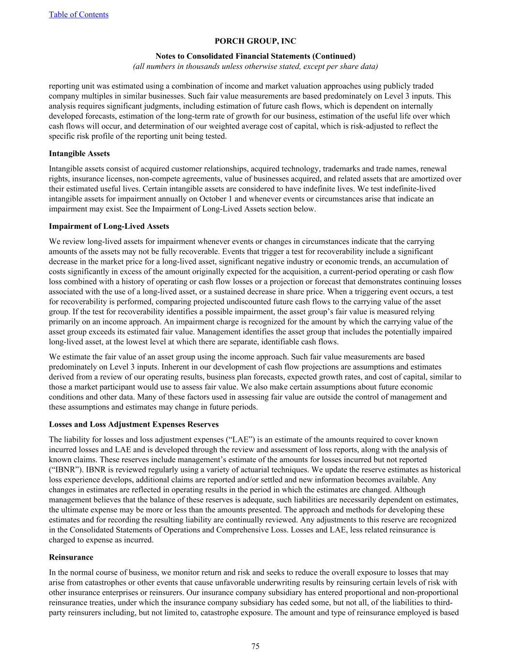 reporting unit was estimated using a combination of income and market valuation approaches using publicly traded company multiples in similar businesses. Such fair value measurements are based predominately on Level 3 inputs. This analysis requires significant judgments, including estimation of future cash flows, which is dependent on internally developed forecasts, estimation of the long-term rate of growth for our business, estimation of the useful life over which cash flows will occur, and determination of our weighted average cost of capital, which is risk-adjusted to reflect the specific risk profile of the reporting unit being tested. Intangible Assets Intangible assets consist of acquired customer relationships, acquired technology, trademarks and trade names, renewal rights, insurance licenses, non-compete agreements, value of businesses acquired, and related assets that are amortized over their estimated useful lives. Certain intangible assets are considered to have indefinite lives. We test indefinite-lived intangible assets for impairment annually on October 1 and whenever events or circumstances arise that indicate an impairment may exist. See the Impairment of Long-Lived Assets section below. Impairment of Long-Lived Assets We review long-lived assets for impairment whenever events or changes in circumstances indicate that the carrying amounts of the assets may not be fully recoverable. Events that trigger a test for recoverability include a significant decrease in the market price for a long-lived asset, significant negative industry or economic trends, an accumulation of costs significantly in excess of the amount originally expected for the acquisition, a current-period operating or cash flow loss combined with a history of operating or cash flow losses or a projection or forecast that demonstrates continuing losses associated with the use of a long-lived asset, or a sustained decrease in share price. When a triggering event occurs, a test for recoverability is performed, comparing projected undiscounted future cash flows to the carrying value of the asset group. If the test for recoverability identifies a possible impairment, the asset group’s fair value is measured relying primarily on an income approach. An impairment charge is recognized for the amount by which the carrying value of the asset group exceeds its estimated fair value. Management identifies the asset group that includes the potentially impaired long-lived asset, at the lowest level at which there are separate, identifiable cash flows. We estimate the fair value of an asset group using the income approach. Such fair value measurements are based predominately on Level 3 inputs. Inherent in our development of cash flow projections are assumptions and estimates derived from a review of our operating results, business plan forecasts, expected growth rates, and cost of capital, similar to those a market participant would use to assess fair value. We also make certain assumptions about future economic conditions and other data. Many of these factors used in assessing fair value are outside the control of management and these assumptions and estimates may change in future periods. Losses and Loss Adjustment Expenses Reserves The liability for losses and loss adjustment expenses (“LAE”) is an estimate of the amounts required to cover known incurred losses and LAE and is developed through the review and assessment of loss reports, along with the analysis of known claims. These reserves include management’s estimate of the amounts for losses incurred but not reported (“IBNR”). IBNR is reviewed regularly using a variety of actuarial techniques. We update the reserve estimates as historical loss experience develops, additional claims are reported and/or settled and new information becomes available. Any changes in estimates are reflected in operating results in the period in which the estimates are changed. Although management believes that the balance of these reserves is adequate, such liabilities are necessarily dependent on estimates, the ultimate expense may be more or less than the amounts presented. The approach and methods for developing these estimates and for recording the resulting liability are continually reviewed. Any adjustments to this reserve are recognized in the Consolidated Statements of Operations and Comprehensive Loss. Losses and LAE, less related reinsurance is charged to expense as incurred. Reinsurance In the normal course of business, we monitor return and risk and seeks to reduce the overall exposure to losses that may arise from catastrophes or other events that cause unfavorable underwriting results by reinsuring certain levels of risk with other insurance enterprises or reinsurers. Our insurance company subsidiary has entered proportional and non-proportional reinsurance treaties, under which the insurance company subsidiary has ceded some, but not all, of the liabilities to third- party reinsurers including, but not limited to, catastrophe exposure. The amount and type of reinsurance employed is based Table of Contents PORCH GROUP, INC Notes to Consolidated Financial Statements (Continued) (all numbers in thousands unless otherwise stated, except per share data) 75