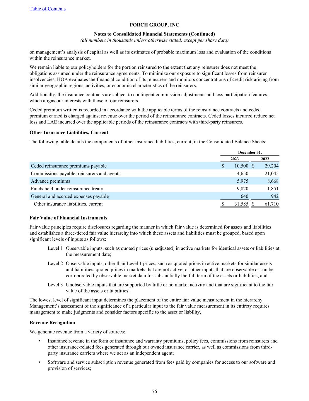 on management’s analysis of capital as well as its estimates of probable maximum loss and evaluation of the conditions within the reinsurance market. We remain liable to our policyholders for the portion reinsured to the extent that any reinsurer does not meet the obligations assumed under the reinsurance agreements. To minimize our exposure to significant losses from reinsurer insolvencies, HOA evaluates the financial condition of its reinsurers and monitors concentrations of credit risk arising from similar geographic regions, activities, or economic characteristics of the reinsurers. Additionally, the insurance contracts are subject to contingent commission adjustments and loss participation features, which aligns our interests with those of our reinsurers. Ceded premium written is recorded in accordance with the applicable terms of the reinsurance contracts and ceded premium earned is charged against revenue over the period of the reinsurance contracts. Ceded losses incurred reduce net loss and LAE incurred over the applicable periods of the reinsurance contracts with third-party reinsurers. Other Insurance Liabilities, Current The following table details the components of other insurance liabilities, current, in the Consolidated Balance Sheets: December 31, 2023 2022 Ceded reinsurance premiums payable $ 10,500 $ 29,204 Commissions payable, reinsurers and agents 4,650 21,045 Advance premiums 5,975 8,668 Funds held under reinsurance treaty 9,820 1,851 General and accrued expenses payable 640 942 Other insurance liabilities, current $ 31,585 $ 61,710 Fair Value of Financial Instruments Fair value principles require disclosures regarding the manner in which fair value is determined for assets and liabilities and establishes a three-tiered fair value hierarchy into which these assets and liabilities must be grouped, based upon significant levels of inputs as follows: Level 1 Observable inputs, such as quoted prices (unadjusted) in active markets for identical assets or liabilities at the measurement date; Level 2 Observable inputs, other than Level 1 prices, such as quoted prices in active markets for similar assets and liabilities, quoted prices in markets that are not active, or other inputs that are observable or can be corroborated by observable market data for substantially the full term of the assets or liabilities; and Level 3 Unobservable inputs that are supported by little or no market activity and that are significant to the fair value of the assets or liabilities. The lowest level of significant input determines the placement of the entire fair value measurement in the hierarchy. Management’s assessment of the significance of a particular input to the fair value measurement in its entirety requires management to make judgments and consider factors specific to the asset or liability. Revenue Recognition We generate revenue from a variety of sources: • Insurance revenue in the form of insurance and warranty premiums, policy fees, commissions from reinsurers and other insurance-related fees generated through our owned insurance carrier, as well as commissions from third- party insurance carriers where we act as an independent agent; • Software and service subscription revenue generated from fees paid by companies for access to our software and provision of services; Table of Contents PORCH GROUP, INC Notes to Consolidated Financial Statements (Continued) (all numbers in thousands unless otherwise stated, except per share data) 76