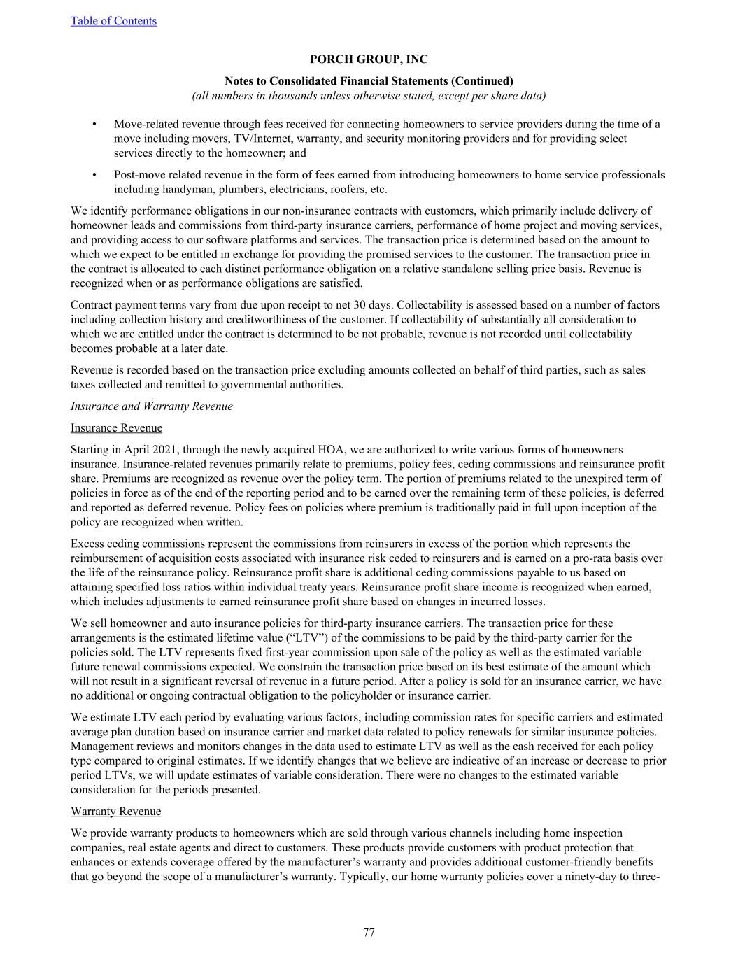 • Move-related revenue through fees received for connecting homeowners to service providers during the time of a move including movers, TV/Internet, warranty, and security monitoring providers and for providing select services directly to the homeowner; and • Post-move related revenue in the form of fees earned from introducing homeowners to home service professionals including handyman, plumbers, electricians, roofers, etc. We identify performance obligations in our non-insurance contracts with customers, which primarily include delivery of homeowner leads and commissions from third-party insurance carriers, performance of home project and moving services, and providing access to our software platforms and services. The transaction price is determined based on the amount to which we expect to be entitled in exchange for providing the promised services to the customer. The transaction price in the contract is allocated to each distinct performance obligation on a relative standalone selling price basis. Revenue is recognized when or as performance obligations are satisfied. Contract payment terms vary from due upon receipt to net 30 days. Collectability is assessed based on a number of factors including collection history and creditworthiness of the customer. If collectability of substantially all consideration to which we are entitled under the contract is determined to be not probable, revenue is not recorded until collectability becomes probable at a later date. Revenue is recorded based on the transaction price excluding amounts collected on behalf of third parties, such as sales taxes collected and remitted to governmental authorities. Insurance and Warranty Revenue Insurance Revenue Starting in April 2021, through the newly acquired HOA, we are authorized to write various forms of homeowners insurance. Insurance-related revenues primarily relate to premiums, policy fees, ceding commissions and reinsurance profit share. Premiums are recognized as revenue over the policy term. The portion of premiums related to the unexpired term of policies in force as of the end of the reporting period and to be earned over the remaining term of these policies, is deferred and reported as deferred revenue. Policy fees on policies where premium is traditionally paid in full upon inception of the policy are recognized when written. Excess ceding commissions represent the commissions from reinsurers in excess of the portion which represents the reimbursement of acquisition costs associated with insurance risk ceded to reinsurers and is earned on a pro-rata basis over the life of the reinsurance policy. Reinsurance profit share is additional ceding commissions payable to us based on attaining specified loss ratios within individual treaty years. Reinsurance profit share income is recognized when earned, which includes adjustments to earned reinsurance profit share based on changes in incurred losses. We sell homeowner and auto insurance policies for third-party insurance carriers. The transaction price for these arrangements is the estimated lifetime value (“LTV”) of the commissions to be paid by the third-party carrier for the policies sold. The LTV represents fixed first-year commission upon sale of the policy as well as the estimated variable future renewal commissions expected. We constrain the transaction price based on its best estimate of the amount which will not result in a significant reversal of revenue in a future period. After a policy is sold for an insurance carrier, we have no additional or ongoing contractual obligation to the policyholder or insurance carrier. We estimate LTV each period by evaluating various factors, including commission rates for specific carriers and estimated average plan duration based on insurance carrier and market data related to policy renewals for similar insurance policies. Management reviews and monitors changes in the data used to estimate LTV as well as the cash received for each policy type compared to original estimates. If we identify changes that we believe are indicative of an increase or decrease to prior period LTVs, we will update estimates of variable consideration. There were no changes to the estimated variable consideration for the periods presented. Warranty Revenue We provide warranty products to homeowners which are sold through various channels including home inspection companies, real estate agents and direct to customers. These products provide customers with product protection that enhances or extends coverage offered by the manufacturer’s warranty and provides additional customer-friendly benefits that go beyond the scope of a manufacturer’s warranty. Typically, our home warranty policies cover a ninety-day to three- Table of Contents PORCH GROUP, INC Notes to Consolidated Financial Statements (Continued) (all numbers in thousands unless otherwise stated, except per share data) 77