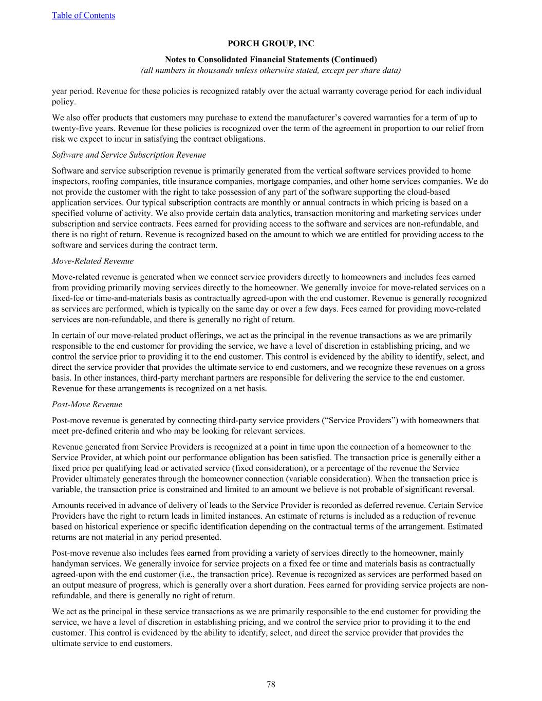 year period. Revenue for these policies is recognized ratably over the actual warranty coverage period for each individual policy. We also offer products that customers may purchase to extend the manufacturer’s covered warranties for a term of up to twenty-five years. Revenue for these policies is recognized over the term of the agreement in proportion to our relief from risk we expect to incur in satisfying the contract obligations. Software and Service Subscription Revenue Software and service subscription revenue is primarily generated from the vertical software services provided to home inspectors, roofing companies, title insurance companies, mortgage companies, and other home services companies. We do not provide the customer with the right to take possession of any part of the software supporting the cloud-based application services. Our typical subscription contracts are monthly or annual contracts in which pricing is based on a specified volume of activity. We also provide certain data analytics, transaction monitoring and marketing services under subscription and service contracts. Fees earned for providing access to the software and services are non-refundable, and there is no right of return. Revenue is recognized based on the amount to which we are entitled for providing access to the software and services during the contract term. Move-Related Revenue Move-related revenue is generated when we connect service providers directly to homeowners and includes fees earned from providing primarily moving services directly to the homeowner. We generally invoice for move-related services on a fixed-fee or time-and-materials basis as contractually agreed-upon with the end customer. Revenue is generally recognized as services are performed, which is typically on the same day or over a few days. Fees earned for providing move-related services are non-refundable, and there is generally no right of return. In certain of our move-related product offerings, we act as the principal in the revenue transactions as we are primarily responsible to the end customer for providing the service, we have a level of discretion in establishing pricing, and we control the service prior to providing it to the end customer. This control is evidenced by the ability to identify, select, and direct the service provider that provides the ultimate service to end customers, and we recognize these revenues on a gross basis. In other instances, third-party merchant partners are responsible for delivering the service to the end customer. Revenue for these arrangements is recognized on a net basis. Post-Move Revenue Post-move revenue is generated by connecting third-party service providers (“Service Providers”) with homeowners that meet pre-defined criteria and who may be looking for relevant services. Revenue generated from Service Providers is recognized at a point in time upon the connection of a homeowner to the Service Provider, at which point our performance obligation has been satisfied. The transaction price is generally either a fixed price per qualifying lead or activated service (fixed consideration), or a percentage of the revenue the Service Provider ultimately generates through the homeowner connection (variable consideration). When the transaction price is variable, the transaction price is constrained and limited to an amount we believe is not probable of significant reversal. Amounts received in advance of delivery of leads to the Service Provider is recorded as deferred revenue. Certain Service Providers have the right to return leads in limited instances. An estimate of returns is included as a reduction of revenue based on historical experience or specific identification depending on the contractual terms of the arrangement. Estimated returns are not material in any period presented. Post-move revenue also includes fees earned from providing a variety of services directly to the homeowner, mainly handyman services. We generally invoice for service projects on a fixed fee or time and materials basis as contractually agreed-upon with the end customer (i.e., the transaction price). Revenue is recognized as services are performed based on an output measure of progress, which is generally over a short duration. Fees earned for providing service projects are non- refundable, and there is generally no right of return. We act as the principal in these service transactions as we are primarily responsible to the end customer for providing the service, we have a level of discretion in establishing pricing, and we control the service prior to providing it to the end customer. This control is evidenced by the ability to identify, select, and direct the service provider that provides the ultimate service to end customers. Table of Contents PORCH GROUP, INC Notes to Consolidated Financial Statements (Continued) (all numbers in thousands unless otherwise stated, except per share data) 78