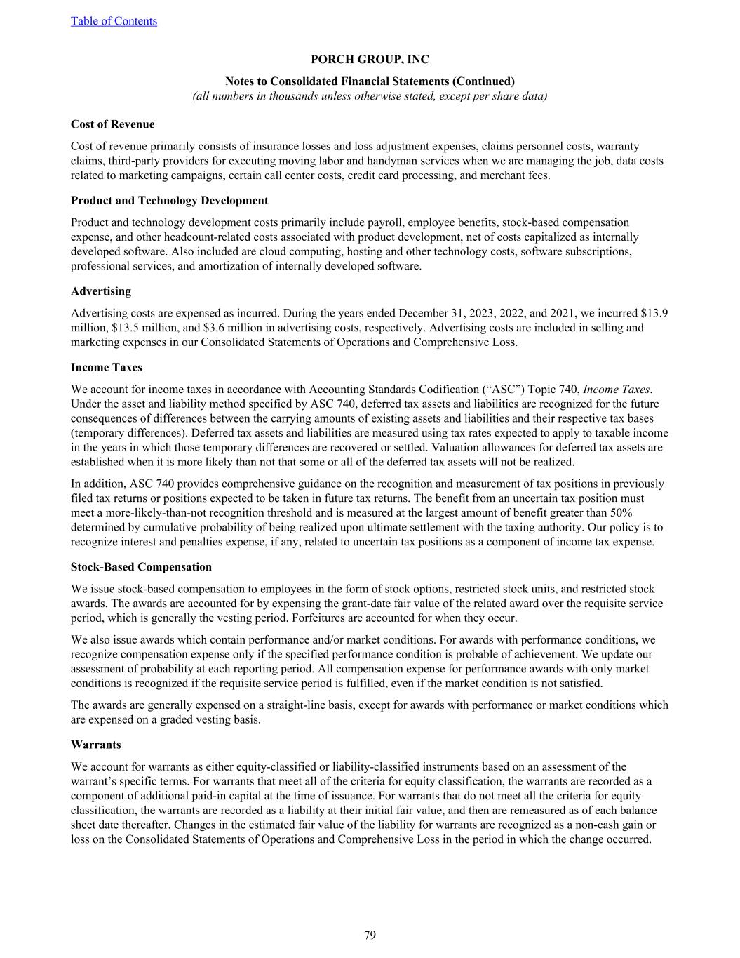 Cost of Revenue Cost of revenue primarily consists of insurance losses and loss adjustment expenses, claims personnel costs, warranty claims, third-party providers for executing moving labor and handyman services when we are managing the job, data costs related to marketing campaigns, certain call center costs, credit card processing, and merchant fees. Product and Technology Development Product and technology development costs primarily include payroll, employee benefits, stock-based compensation expense, and other headcount-related costs associated with product development, net of costs capitalized as internally developed software. Also included are cloud computing, hosting and other technology costs, software subscriptions, professional services, and amortization of internally developed software. Advertising Advertising costs are expensed as incurred. During the years ended December 31, 2023, 2022, and 2021, we incurred $13.9 million, $13.5 million, and $3.6 million in advertising costs, respectively. Advertising costs are included in selling and marketing expenses in our Consolidated Statements of Operations and Comprehensive Loss. Income Taxes We account for income taxes in accordance with Accounting Standards Codification (“ASC”) Topic 740, Income Taxes. Under the asset and liability method specified by ASC 740, deferred tax assets and liabilities are recognized for the future consequences of differences between the carrying amounts of existing assets and liabilities and their respective tax bases (temporary differences). Deferred tax assets and liabilities are measured using tax rates expected to apply to taxable income in the years in which those temporary differences are recovered or settled. Valuation allowances for deferred tax assets are established when it is more likely than not that some or all of the deferred tax assets will not be realized. In addition, ASC 740 provides comprehensive guidance on the recognition and measurement of tax positions in previously filed tax returns or positions expected to be taken in future tax returns. The benefit from an uncertain tax position must meet a more-likely-than-not recognition threshold and is measured at the largest amount of benefit greater than 50% determined by cumulative probability of being realized upon ultimate settlement with the taxing authority. Our policy is to recognize interest and penalties expense, if any, related to uncertain tax positions as a component of income tax expense. Stock-Based Compensation We issue stock-based compensation to employees in the form of stock options, restricted stock units, and restricted stock awards. The awards are accounted for by expensing the grant-date fair value of the related award over the requisite service period, which is generally the vesting period. Forfeitures are accounted for when they occur. We also issue awards which contain performance and/or market conditions. For awards with performance conditions, we recognize compensation expense only if the specified performance condition is probable of achievement. We update our assessment of probability at each reporting period. All compensation expense for performance awards with only market conditions is recognized if the requisite service period is fulfilled, even if the market condition is not satisfied. The awards are generally expensed on a straight-line basis, except for awards with performance or market conditions which are expensed on a graded vesting basis. Warrants We account for warrants as either equity-classified or liability-classified instruments based on an assessment of the warrant’s specific terms. For warrants that meet all of the criteria for equity classification, the warrants are recorded as a component of additional paid-in capital at the time of issuance. For warrants that do not meet all the criteria for equity classification, the warrants are recorded as a liability at their initial fair value, and then are remeasured as of each balance sheet date thereafter. Changes in the estimated fair value of the liability for warrants are recognized as a non-cash gain or loss on the Consolidated Statements of Operations and Comprehensive Loss in the period in which the change occurred. Table of Contents PORCH GROUP, INC Notes to Consolidated Financial Statements (Continued) (all numbers in thousands unless otherwise stated, except per share data) 79