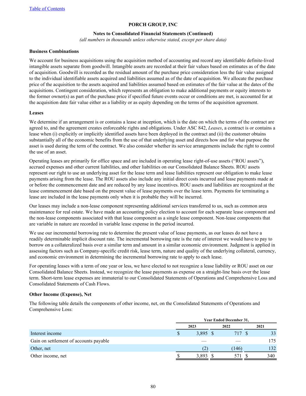 Business Combinations We account for business acquisitions using the acquisition method of accounting and record any identifiable definite-lived intangible assets separate from goodwill. Intangible assets are recorded at their fair values based on estimates as of the date of acquisition. Goodwill is recorded as the residual amount of the purchase price consideration less the fair value assigned to the individual identifiable assets acquired and liabilities assumed as of the date of acquisition. We allocate the purchase price of the acquisition to the assets acquired and liabilities assumed based on estimates of the fair value at the dates of the acquisitions. Contingent consideration, which represents an obligation to make additional payments or equity interests to the former owner(s) as part of the purchase price if specified future events occur or conditions are met, is accounted for at the acquisition date fair value either as a liability or as equity depending on the terms of the acquisition agreement. Leases We determine if an arrangement is or contains a lease at inception, which is the date on which the terms of the contract are agreed to, and the agreement creates enforceable rights and obligations. Under ASC 842, Leases, a contract is or contains a lease when (i) explicitly or implicitly identified assets have been deployed in the contract and (ii) the customer obtains substantially all of the economic benefits from the use of that underlying asset and directs how and for what purpose the asset is used during the term of the contract. We also consider whether its service arrangements include the right to control the use of an asset. Operating leases are primarily for office space and are included in operating lease right-of-use assets (“ROU assets”), accrued expenses and other current liabilities, and other liabilities on our Consolidated Balance Sheets. ROU assets represent our right to use an underlying asset for the lease term and lease liabilities represent our obligation to make lease payments arising from the lease. The ROU assets also include any initial direct costs incurred and lease payments made at or before the commencement date and are reduced by any lease incentives. ROU assets and liabilities are recognized at the lease commencement date based on the present value of lease payments over the lease term. Payments for terminating a lease are included in the lease payments only when it is probable they will be incurred. Our leases may include a non-lease component representing additional services transferred to us, such as common area maintenance for real estate. We have made an accounting policy election to account for each separate lease component and the non-lease components associated with that lease component as a single lease component. Non-lease components that are variable in nature are recorded in variable lease expense in the period incurred. We use our incremental borrowing rate to determine the present value of lease payments, as our leases do not have a readily determinable implicit discount rate. The incremental borrowing rate is the rate of interest we would have to pay to borrow on a collateralized basis over a similar term and amount in a similar economic environment. Judgment is applied in assessing factors such as Company-specific credit risk, lease term, nature and quality of the underlying collateral, currency, and economic environment in determining the incremental borrowing rate to apply to each lease. For operating leases with a term of one year or less, we have elected to not recognize a lease liability or ROU asset on our Consolidated Balance Sheets. Instead, we recognize the lease payments as expense on a straight-line basis over the lease term. Short-term lease expenses are immaterial to our Consolidated Statements of Operations and Comprehensive Loss and Consolidated Statements of Cash Flows. Other Income (Expense), Net The following table details the components of other income, net, on the Consolidated Statements of Operations and Comprehensive Loss: Year Ended December 31, 2023 2022 2021 Interest income $ 3,895 $ 717 $ 33 Gain on settlement of accounts payable — — 175 Other, net (2) (146) 132 Other income, net $ 3,893 $ 571 $ 340 Table of Contents PORCH GROUP, INC Notes to Consolidated Financial Statements (Continued) (all numbers in thousands unless otherwise stated, except per share data) 80