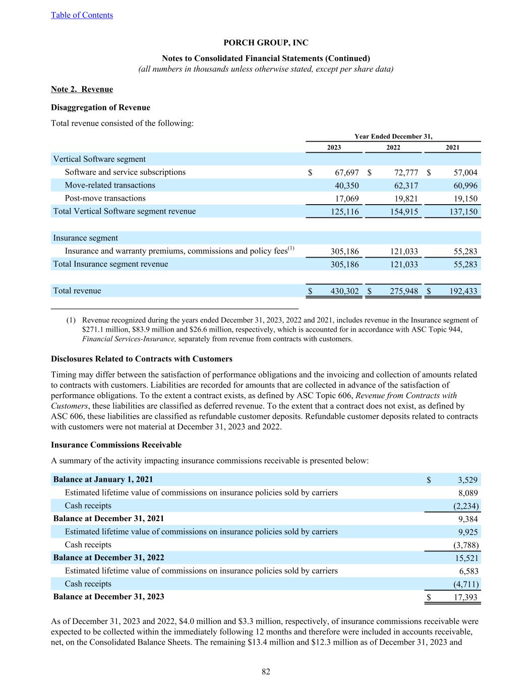 Note 2. Revenue Disaggregation of Revenue Total revenue consisted of the following: Year Ended December 31, 2023 2022 2021 Vertical Software segment Software and service subscriptions $ 67,697 $ 72,777 $ 57,004 Move-related transactions 40,350 62,317 60,996 Post-move transactions 17,069 19,821 19,150 Total Vertical Software segment revenue 125,116 154,915 137,150 Insurance segment Insurance and warranty premiums, commissions and policy fees(1) 305,186 121,033 55,283 Total Insurance segment revenue 305,186 121,033 55,283 Total revenue $ 430,302 $ 275,948 $ 192,433 _________________________________________________________ (1) Revenue recognized during the years ended December 31, 2023, 2022 and 2021, includes revenue in the Insurance segment of $271.1 million, $83.9 million and $26.6 million, respectively, which is accounted for in accordance with ASC Topic 944, Financial Services-Insurance, separately from revenue from contracts with customers. Disclosures Related to Contracts with Customers Timing may differ between the satisfaction of performance obligations and the invoicing and collection of amounts related to contracts with customers. Liabilities are recorded for amounts that are collected in advance of the satisfaction of performance obligations. To the extent a contract exists, as defined by ASC Topic 606, Revenue from Contracts with Customers, these liabilities are classified as deferred revenue. To the extent that a contract does not exist, as defined by ASC 606, these liabilities are classified as refundable customer deposits. Refundable customer deposits related to contracts with customers were not material at December 31, 2023 and 2022. Insurance Commissions Receivable A summary of the activity impacting insurance commissions receivable is presented below: Balance at January 1, 2021 $ 3,529 Estimated lifetime value of commissions on insurance policies sold by carriers 8,089 Cash receipts (2,234) Balance at December 31, 2021 9,384 Estimated lifetime value of commissions on insurance policies sold by carriers 9,925 Cash receipts (3,788) Balance at December 31, 2022 15,521 Estimated lifetime value of commissions on insurance policies sold by carriers 6,583 Cash receipts (4,711) Balance at December 31, 2023 $ 17,393 As of December 31, 2023 and 2022, $4.0 million and $3.3 million, respectively, of insurance commissions receivable were expected to be collected within the immediately following 12 months and therefore were included in accounts receivable, net, on the Consolidated Balance Sheets. The remaining $13.4 million and $12.3 million as of December 31, 2023 and Table of Contents PORCH GROUP, INC Notes to Consolidated Financial Statements (Continued) (all numbers in thousands unless otherwise stated, except per share data) 82