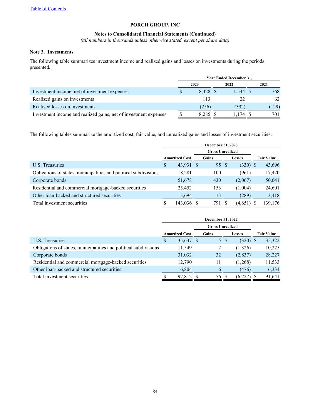 Note 3. Investments The following table summarizes investment income and realized gains and losses on investments during the periods presented. Year Ended December 31, 2023 2022 2021 Investment income, net of investment expenses $ 8,428 $ 1,544 $ 768 Realized gains on investments 113 22 62 Realized losses on investments (256) (392) (129) Investment income and realized gains, net of investment expenses $ 8,285 $ 1,174 $ 701 The following tables summarize the amortized cost, fair value, and unrealized gains and losses of investment securities: December 31, 2023 Amortized Cost Gross Unrealized Fair ValueGains Losses U.S. Treasuries $ 43,931 $ 95 $ (330) $ 43,696 Obligations of states, municipalities and political subdivisions 18,281 100 (961) 17,420 Corporate bonds 51,678 430 (2,067) 50,041 Residential and commercial mortgage-backed securities 25,452 153 (1,004) 24,601 Other loan-backed and structured securities 3,694 13 (289) 3,418 Total investment securities $ 143,036 $ 791 $ (4,651) $ 139,176 December 31, 2022 Amortized Cost Gross Unrealized Fair ValueGains Losses U.S. Treasuries $ 35,637 $ 5 $ (320) $ 35,322 Obligations of states, municipalities and political subdivisions 11,549 2 (1,326) 10,225 Corporate bonds 31,032 32 (2,837) 28,227 Residential and commercial mortgage-backed securities 12,790 11 (1,268) 11,533 Other loan-backed and structured securities 6,804 6 (476) 6,334 Total investment securities $ 97,812 $ 56 $ (6,227) $ 91,641 Table of Contents PORCH GROUP, INC Notes to Consolidated Financial Statements (Continued) (all numbers in thousands unless otherwise stated, except per share data) 84