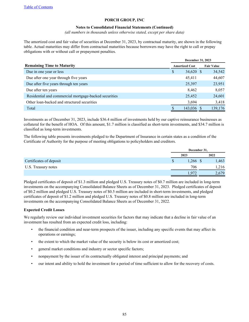 The amortized cost and fair value of securities at December 31, 2023, by contractual maturity, are shown in the following table. Actual maturities may differ from contractual maturities because borrowers may have the right to call or prepay obligations with or without call or prepayment penalties. December 31, 2023 Remaining Time to Maturity Amortized Cost Fair Value Due in one year or less $ 34,620 $ 34,542 Due after one year through five years 45,411 44,607 Due after five years through ten years 25,397 23,951 Due after ten years 8,462 8,057 Residential and commercial mortgage-backed securities 25,452 24,601 Other loan-backed and structured securities 3,694 3,418 Total $ 143,036 $ 139,176 Investments as of December 31, 2023, include $36.4 million of investments held by our captive reinsurance businesses as collateral for the benefit of HOA. Of this amount, $1.7 million is classified as short-term investments, and $34.7 million is classified as long-term investments. The following table presents investments pledged to the Department of Insurance in certain states as a condition of the Certificate of Authority for the purpose of meeting obligations to policyholders and creditors. December 31, 2023 2022 Certificates of deposit $ 1,266 $ 1,463 U.S. Treasury notes 706 1,216 1,972 2,679 Pledged certificates of deposit of $1.3 million and pledged U.S. Treasury notes of $0.7 million are included in long-term investments on the accompanying Consolidated Balance Sheets as of December 31, 2023. Pledged certificates of deposit of $0.2 million and pledged U.S. Treasury notes of $0.5 million are included in short-term investments, and pledged certificates of deposit of $1.2 million and pledged U.S. Treasury notes of $0.8 million are included in long-term investments on the accompanying Consolidated Balance Sheets as of December 31, 2022. Expected Credit Losses We regularly review our individual investment securities for factors that may indicate that a decline in fair value of an investment has resulted from an expected credit loss, including: • the financial condition and near-term prospects of the issuer, including any specific events that may affect its operations or earnings; • the extent to which the market value of the security is below its cost or amortized cost; • general market conditions and industry or sector specific factors; • nonpayment by the issuer of its contractually obligated interest and principal payments; and • our intent and ability to hold the investment for a period of time sufficient to allow for the recovery of costs. Table of Contents PORCH GROUP, INC Notes to Consolidated Financial Statements (Continued) (all numbers in thousands unless otherwise stated, except per share data) 85
