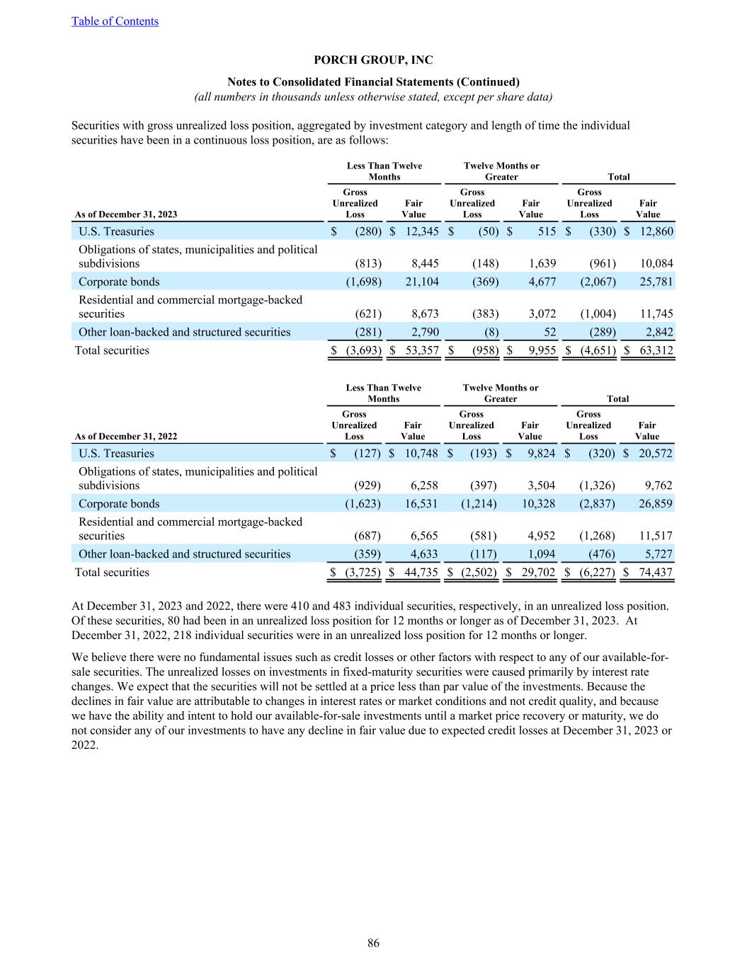 Securities with gross unrealized loss position, aggregated by investment category and length of time the individual securities have been in a continuous loss position, are as follows: Less Than Twelve Months Twelve Months or Greater Total As of December 31, 2023 Gross Unrealized Loss Fair Value Gross Unrealized Loss Fair Value Gross Unrealized Loss Fair Value U.S. Treasuries $ (280) $ 12,345 $ (50) $ 515 $ (330) $ 12,860 Obligations of states, municipalities and political subdivisions (813) 8,445 (148) 1,639 (961) 10,084 Corporate bonds (1,698) 21,104 (369) 4,677 (2,067) 25,781 Residential and commercial mortgage-backed securities (621) 8,673 (383) 3,072 (1,004) 11,745 Other loan-backed and structured securities (281) 2,790 (8) 52 (289) 2,842 Total securities $ (3,693) $ 53,357 $ (958) $ 9,955 $ (4,651) $ 63,312 Less Than Twelve Months Twelve Months or Greater Total As of December 31, 2022 Gross Unrealized Loss Fair Value Gross Unrealized Loss Fair Value Gross Unrealized Loss Fair Value U.S. Treasuries $ (127) $ 10,748 $ (193) $ 9,824 $ (320) $ 20,572 Obligations of states, municipalities and political subdivisions (929) 6,258 (397) 3,504 (1,326) 9,762 Corporate bonds (1,623) 16,531 (1,214) 10,328 (2,837) 26,859 Residential and commercial mortgage-backed securities (687) 6,565 (581) 4,952 (1,268) 11,517 Other loan-backed and structured securities (359) 4,633 (117) 1,094 (476) 5,727 Total securities $ (3,725) $ 44,735 $ (2,502) $ 29,702 $ (6,227) $ 74,437 At December 31, 2023 and 2022, there were 410 and 483 individual securities, respectively, in an unrealized loss position. Of these securities, 80 had been in an unrealized loss position for 12 months or longer as of December 31, 2023. At December 31, 2022, 218 individual securities were in an unrealized loss position for 12 months or longer. We believe there were no fundamental issues such as credit losses or other factors with respect to any of our available-for- sale securities. The unrealized losses on investments in fixed-maturity securities were caused primarily by interest rate changes. We expect that the securities will not be settled at a price less than par value of the investments. Because the declines in fair value are attributable to changes in interest rates or market conditions and not credit quality, and because we have the ability and intent to hold our available-for-sale investments until a market price recovery or maturity, we do not consider any of our investments to have any decline in fair value due to expected credit losses at December 31, 2023 or 2022. Table of Contents PORCH GROUP, INC Notes to Consolidated Financial Statements (Continued) (all numbers in thousands unless otherwise stated, except per share data) 86