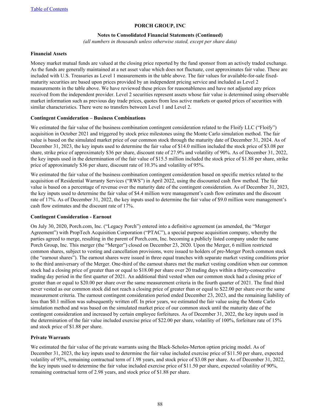 Financial Assets Money market mutual funds are valued at the closing price reported by the fund sponsor from an actively traded exchange. As the funds are generally maintained at a net asset value which does not fluctuate, cost approximates fair value. These are included with U.S. Treasuries as Level 1 measurements in the table above. The fair values for available-for-sale fixed- maturity securities are based upon prices provided by an independent pricing service and included as Level 2 measurements in the table above. We have reviewed these prices for reasonableness and have not adjusted any prices received from the independent provider. Level 2 securities represent assets whose fair value is determined using observable market information such as previous day trade prices, quotes from less active markets or quoted prices of securities with similar characteristics. There were no transfers between Level 1 and Level 2. Contingent Consideration – Business Combinations We estimated the fair value of the business combination contingent consideration related to the Floify LLC (“Floify”) acquisition in October 2021 and triggered by stock price milestones using the Monte Carlo simulation method. The fair value is based on the simulated market price of our common stock through the maturity date of December 31, 2024. As of December 31, 2023, the key inputs used to determine the fair value of $14.0 million included the stock price of $3.08 per share, strike price of approximately $36 per share, discount rate of 27.9% and volatility of 90%. As of December 31, 2022, the key inputs used in the determination of the fair value of $15.5 million included the stock price of $1.88 per share, strike price of approximately $36 per share, discount rate of 10.3% and volatility of 95%. We estimated the fair value of the business combination contingent consideration based on specific metrics related to the acquisition of Residential Warranty Services (“RWS”) in April 2022, using the discounted cash flow method. The fair value is based on a percentage of revenue over the maturity date of the contingent consideration. As of December 31, 2023, the key inputs used to determine the fair value of $4.4 million were management’s cash flow estimates and the discount rate of 17%. As of December 31, 2022, the key inputs used to determine the fair value of $9.0 million were management’s cash flow estimates and the discount rate of 17%. Contingent Consideration - Earnout On July 30, 2020, Porch.com, Inc. (“Legacy Porch”) entered into a definitive agreement (as amended, the “Merger Agreement”) with PropTech Acquisition Corporation (“PTAC”), a special purpose acquisition company, whereby the parties agreed to merge, resulting in the parent of Porch.com, Inc. becoming a publicly listed company under the name Porch Group, Inc. This merger (the “Merger”) closed on December 23, 2020. Upon the Merger, 6 million restricted common shares, subject to vesting and cancellation provisions, were issued to holders of pre-Merger Porch common stock (the “earnout shares”). The earnout shares were issued in three equal tranches with separate market vesting conditions prior to the third anniversary of the Merger. One-third of the earnout shares met the market vesting condition when our common stock had a closing price of greater than or equal to $18.00 per share over 20 trading days within a thirty-consecutive trading day period in the first quarter of 2021. An additional third vested when our common stock had a closing price of greater than or equal to $20.00 per share over the same measurement criteria in the fourth quarter of 2021. The final third never vested as our common stock did not reach a closing price of greater than or equal to $22.00 per share over the same measurement criteria. The earnout contingent consideration period ended December 23, 2023, and the remaining liability of less than $0.1 million was subsequently written off. In prior years, we estimated the fair value using the Monte Carlo simulation method and was based on the simulated market price of our common stock until the maturity date of the contingent consideration and increased by certain employee forfeitures. As of December 31, 2022, the key inputs used in the determination of the fair value included exercise price of $22.00 per share, volatility of 100%, forfeiture rate of 15% and stock price of $1.88 per share. Private Warrants We estimated the fair value of the private warrants using the Black-Scholes-Merton option pricing model. As of December 31, 2023, the key inputs used to determine the fair value included exercise price of $11.50 per share, expected volatility of 95%, remaining contractual term of 1.98 years, and stock price of $3.08 per share. As of December 31, 2022, the key inputs used to determine the fair value included exercise price of $11.50 per share, expected volatility of 90%, remaining contractual term of 2.98 years, and stock price of $1.88 per share. Table of Contents PORCH GROUP, INC Notes to Consolidated Financial Statements (Continued) (all numbers in thousands unless otherwise stated, except per share data) 88