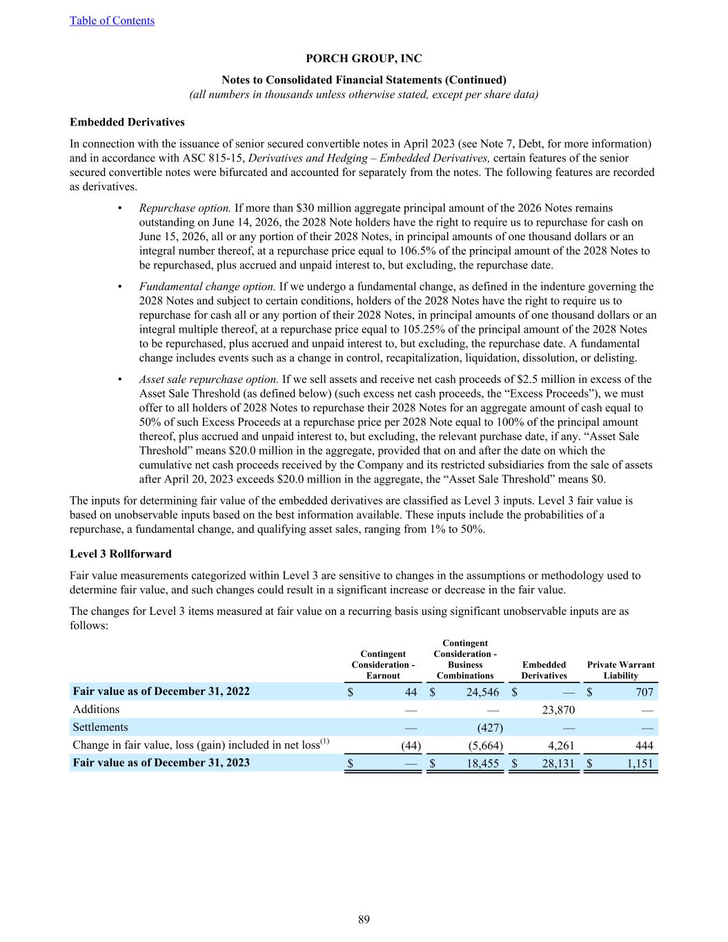 Embedded Derivatives In connection with the issuance of senior secured convertible notes in April 2023 (see Note 7, Debt, for more information) and in accordance with ASC 815-15, Derivatives and Hedging – Embedded Derivatives, certain features of the senior secured convertible notes were bifurcated and accounted for separately from the notes. The following features are recorded as derivatives. • Repurchase option. If more than $30 million aggregate principal amount of the 2026 Notes remains outstanding on June 14, 2026, the 2028 Note holders have the right to require us to repurchase for cash on June 15, 2026, all or any portion of their 2028 Notes, in principal amounts of one thousand dollars or an integral number thereof, at a repurchase price equal to 106.5% of the principal amount of the 2028 Notes to be repurchased, plus accrued and unpaid interest to, but excluding, the repurchase date. • Fundamental change option. If we undergo a fundamental change, as defined in the indenture governing the 2028 Notes and subject to certain conditions, holders of the 2028 Notes have the right to require us to repurchase for cash all or any portion of their 2028 Notes, in principal amounts of one thousand dollars or an integral multiple thereof, at a repurchase price equal to 105.25% of the principal amount of the 2028 Notes to be repurchased, plus accrued and unpaid interest to, but excluding, the repurchase date. A fundamental change includes events such as a change in control, recapitalization, liquidation, dissolution, or delisting. • Asset sale repurchase option. If we sell assets and receive net cash proceeds of $2.5 million in excess of the Asset Sale Threshold (as defined below) (such excess net cash proceeds, the “Excess Proceeds”), we must offer to all holders of 2028 Notes to repurchase their 2028 Notes for an aggregate amount of cash equal to 50% of such Excess Proceeds at a repurchase price per 2028 Note equal to 100% of the principal amount thereof, plus accrued and unpaid interest to, but excluding, the relevant purchase date, if any. “Asset Sale Threshold” means $20.0 million in the aggregate, provided that on and after the date on which the cumulative net cash proceeds received by the Company and its restricted subsidiaries from the sale of assets after April 20, 2023 exceeds $20.0 million in the aggregate, the “Asset Sale Threshold” means $0. The inputs for determining fair value of the embedded derivatives are classified as Level 3 inputs. Level 3 fair value is based on unobservable inputs based on the best information available. These inputs include the probabilities of a repurchase, a fundamental change, and qualifying asset sales, ranging from 1% to 50%. Level 3 Rollforward Fair value measurements categorized within Level 3 are sensitive to changes in the assumptions or methodology used to determine fair value, and such changes could result in a significant increase or decrease in the fair value. The changes for Level 3 items measured at fair value on a recurring basis using significant unobservable inputs are as follows: Contingent Consideration - Earnout Contingent Consideration - Business Combinations Embedded Derivatives Private Warrant Liability Fair value as of December 31, 2022 $ 44 $ 24,546 $ — $ 707 Additions — — 23,870 — Settlements — (427) — — Change in fair value, loss (gain) included in net loss(1) (44) (5,664) 4,261 444 Fair value as of December 31, 2023 $ — $ 18,455 $ 28,131 $ 1,151 Table of Contents PORCH GROUP, INC Notes to Consolidated Financial Statements (Continued) (all numbers in thousands unless otherwise stated, except per share data) 89