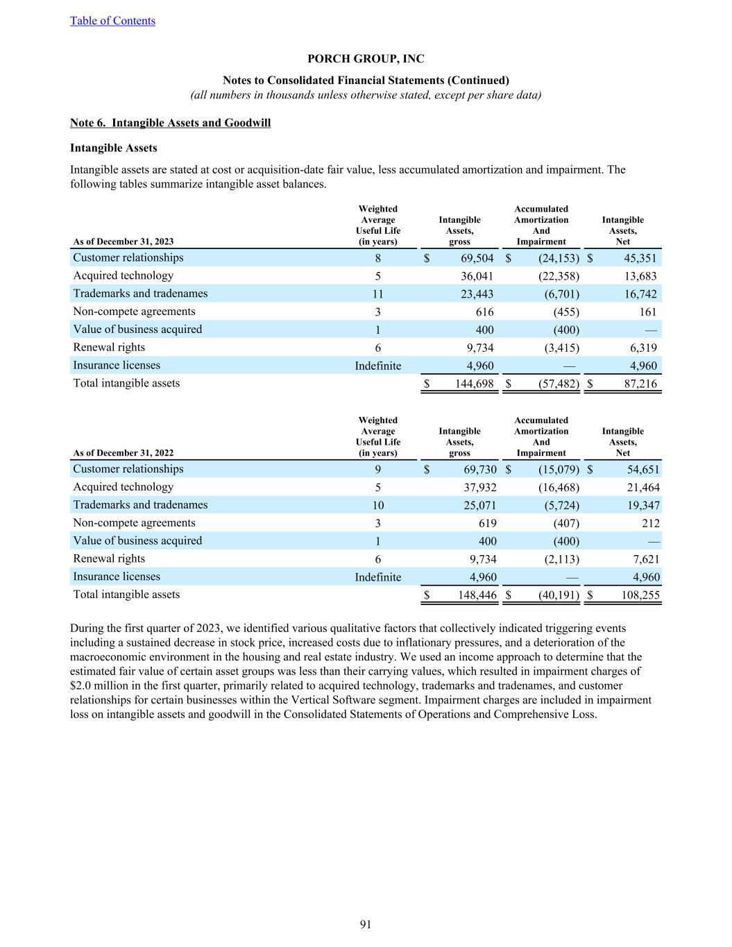 Note 6. Intangible Assets and Goodwill Intangible Assets Intangible assets are stated at cost or acquisition-date fair value, less accumulated amortization and impairment. The following tables summarize intangible asset balances. As of December 31, 2023 Weighted Average Useful Life (in years) Intangible Assets, gross Accumulated Amortization And Impairment Intangible Assets, Net Customer relationships 8 $ 69,504 $ (24,153) $ 45,351 Acquired technology 5 36,041 (22,358) 13,683 Trademarks and tradenames 11 23,443 (6,701) 16,742 Non-compete agreements 3 616 (455) 161 Value of business acquired 1 400 (400) — Renewal rights 6 9,734 (3,415) 6,319 Insurance licenses Indefinite 4,960 — 4,960 Total intangible assets $ 144,698 $ (57,482) $ 87,216 As of December 31, 2022 Weighted Average Useful Life (in years) Intangible Assets, gross Accumulated Amortization And Impairment Intangible Assets, Net Customer relationships 9 $ 69,730 $ (15,079) $ 54,651 Acquired technology 5 37,932 (16,468) 21,464 Trademarks and tradenames 10 25,071 (5,724) 19,347 Non-compete agreements 3 619 (407) 212 Value of business acquired 1 400 (400) — Renewal rights 6 9,734 (2,113) 7,621 Insurance licenses Indefinite 4,960 — 4,960 Total intangible assets $ 148,446 $ (40,191) $ 108,255 During the first quarter of 2023, we identified various qualitative factors that collectively indicated triggering events including a sustained decrease in stock price, increased costs due to inflationary pressures, and a deterioration of the macroeconomic environment in the housing and real estate industry. We used an income approach to determine that the estimated fair value of certain asset groups was less than their carrying values, which resulted in impairment charges of $2.0 million in the first quarter, primarily related to acquired technology, trademarks and tradenames, and customer relationships for certain businesses within the Vertical Software segment. Impairment charges are included in impairment loss on intangible assets and goodwill in the Consolidated Statements of Operations and Comprehensive Loss. Table of Contents PORCH GROUP, INC Notes to Consolidated Financial Statements (Continued) (all numbers in thousands unless otherwise stated, except per share data) 91