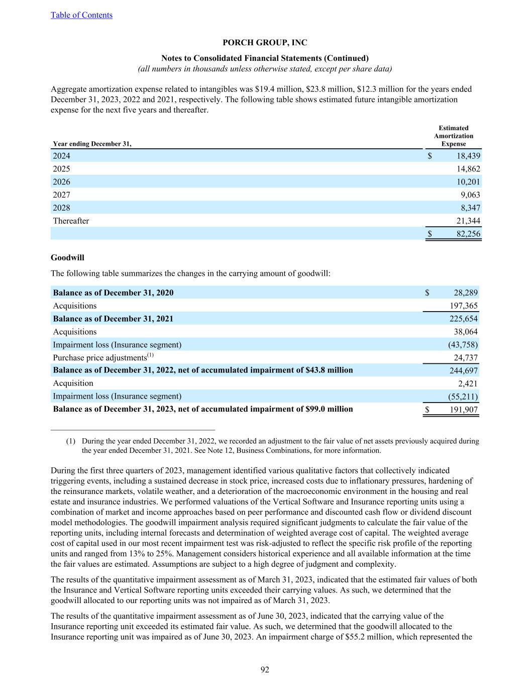 Aggregate amortization expense related to intangibles was $19.4 million, $23.8 million, $12.3 million for the years ended December 31, 2023, 2022 and 2021, respectively. The following table shows estimated future intangible amortization expense for the next five years and thereafter. Year ending December 31, Estimated Amortization Expense 2024 $ 18,439 2025 14,862 2026 10,201 2027 9,063 2028 8,347 Thereafter 21,344 $ 82,256 Goodwill The following table summarizes the changes in the carrying amount of goodwill: Balance as of December 31, 2020 $ 28,289 Acquisitions 197,365 Balance as of December 31, 2021 225,654 Acquisitions 38,064 Impairment loss (Insurance segment) (43,758) Purchase price adjustments(1) 24,737 Balance as of December 31, 2022, net of accumulated impairment of $43.8 million 244,697 Acquisition 2,421 Impairment loss (Insurance segment) (55,211) Balance as of December 31, 2023, net of accumulated impairment of $99.0 million $ 191,907 ______________________________________ (1) During the year ended December 31, 2022, we recorded an adjustment to the fair value of net assets previously acquired during the year ended December 31, 2021. See Note 12, Business Combinations, for more information. During the first three quarters of 2023, management identified various qualitative factors that collectively indicated triggering events, including a sustained decrease in stock price, increased costs due to inflationary pressures, hardening of the reinsurance markets, volatile weather, and a deterioration of the macroeconomic environment in the housing and real estate and insurance industries. We performed valuations of the Vertical Software and Insurance reporting units using a combination of market and income approaches based on peer performance and discounted cash flow or dividend discount model methodologies. The goodwill impairment analysis required significant judgments to calculate the fair value of the reporting units, including internal forecasts and determination of weighted average cost of capital. The weighted average cost of capital used in our most recent impairment test was risk-adjusted to reflect the specific risk profile of the reporting units and ranged from 13% to 25%. Management considers historical experience and all available information at the time the fair values are estimated. Assumptions are subject to a high degree of judgment and complexity. The results of the quantitative impairment assessment as of March 31, 2023, indicated that the estimated fair values of both the Insurance and Vertical Software reporting units exceeded their carrying values. As such, we determined that the goodwill allocated to our reporting units was not impaired as of March 31, 2023. The results of the quantitative impairment assessment as of June 30, 2023, indicated that the carrying value of the Insurance reporting unit exceeded its estimated fair value. As such, we determined that the goodwill allocated to the Insurance reporting unit was impaired as of June 30, 2023. An impairment charge of $55.2 million, which represented the Table of Contents PORCH GROUP, INC Notes to Consolidated Financial Statements (Continued) (all numbers in thousands unless otherwise stated, except per share data) 92