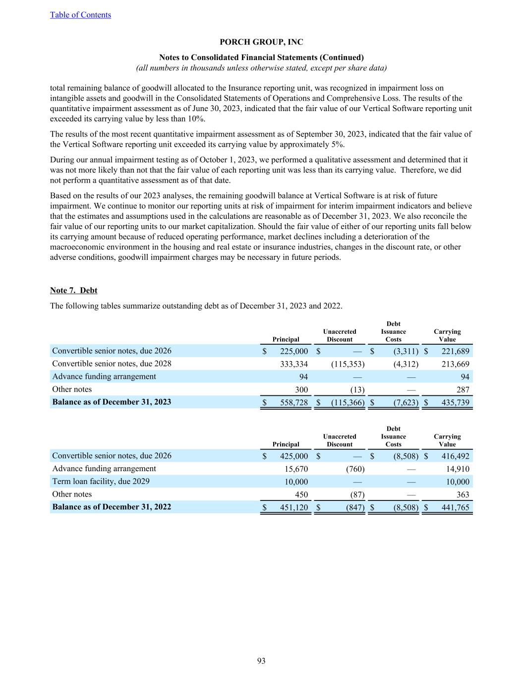 total remaining balance of goodwill allocated to the Insurance reporting unit, was recognized in impairment loss on intangible assets and goodwill in the Consolidated Statements of Operations and Comprehensive Loss. The results of the quantitative impairment assessment as of June 30, 2023, indicated that the fair value of our Vertical Software reporting unit exceeded its carrying value by less than 10%. The results of the most recent quantitative impairment assessment as of September 30, 2023, indicated that the fair value of the Vertical Software reporting unit exceeded its carrying value by approximately 5%. During our annual impairment testing as of October 1, 2023, we performed a qualitative assessment and determined that it was not more likely than not that the fair value of each reporting unit was less than its carrying value. Therefore, we did not perform a quantitative assessment as of that date. Based on the results of our 2023 analyses, the remaining goodwill balance at Vertical Software is at risk of future impairment. We continue to monitor our reporting units at risk of impairment for interim impairment indicators and believe that the estimates and assumptions used in the calculations are reasonable as of December 31, 2023. We also reconcile the fair value of our reporting units to our market capitalization. Should the fair value of either of our reporting units fall below its carrying amount because of reduced operating performance, market declines including a deterioration of the macroeconomic environment in the housing and real estate or insurance industries, changes in the discount rate, or other adverse conditions, goodwill impairment charges may be necessary in future periods. Note 7. Debt The following tables summarize outstanding debt as of December 31, 2023 and 2022. Principal Unaccreted Discount Debt Issuance Costs Carrying Value Convertible senior notes, due 2026 $ 225,000 $ — $ (3,311) $ 221,689 Convertible senior notes, due 2028 333,334 (115,353) (4,312) 213,669 Advance funding arrangement 94 — — 94 Other notes 300 (13) — 287 Balance as of December 31, 2023 $ 558,728 $ (115,366) $ (7,623) $ 435,739 Principal Unaccreted Discount Debt Issuance Costs Carrying Value Convertible senior notes, due 2026 $ 425,000 $ — $ (8,508) $ 416,492 Advance funding arrangement 15,670 (760) — 14,910 Term loan facility, due 2029 10,000 — — 10,000 Other notes 450 (87) — 363 Balance as of December 31, 2022 $ 451,120 $ (847) $ (8,508) $ 441,765 Table of Contents PORCH GROUP, INC Notes to Consolidated Financial Statements (Continued) (all numbers in thousands unless otherwise stated, except per share data) 93