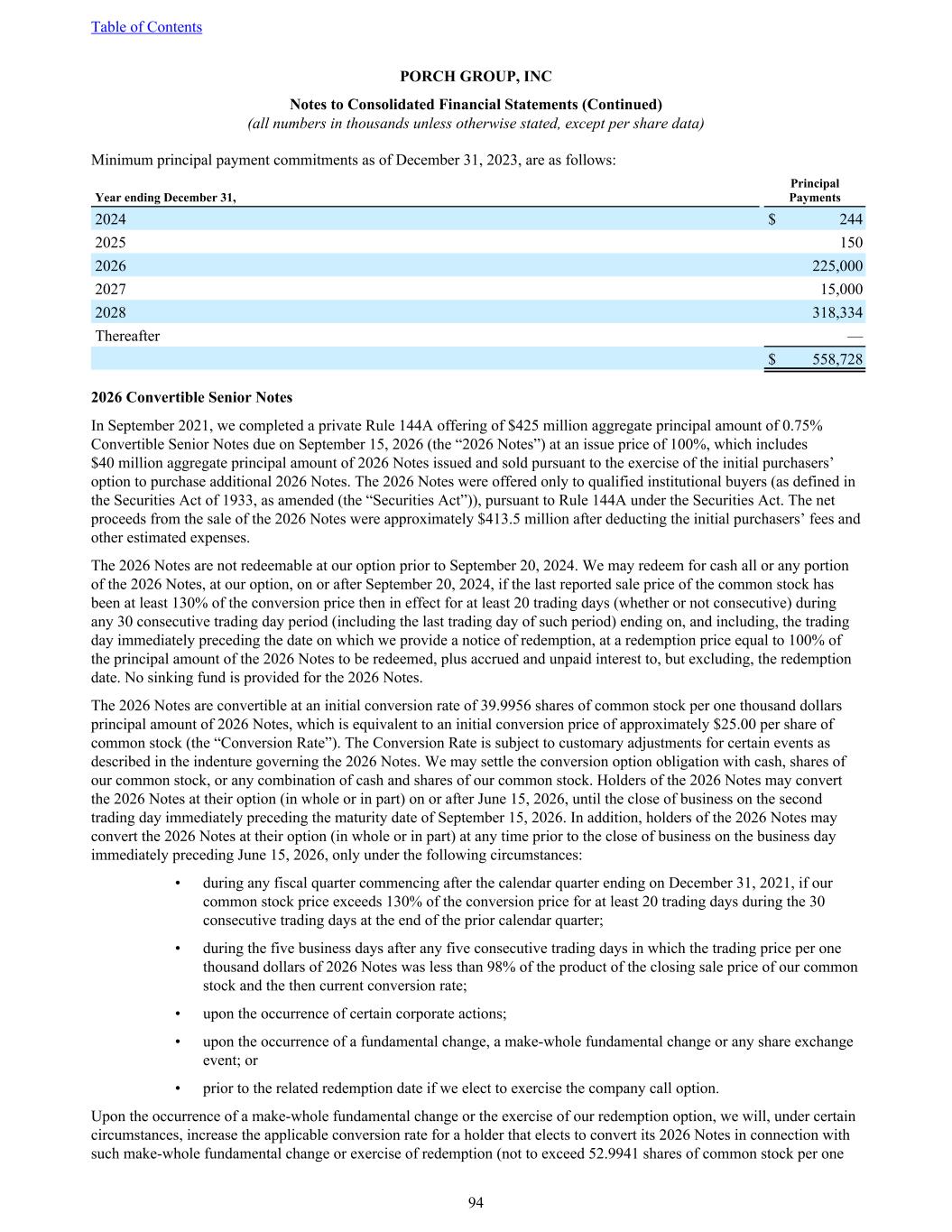 Minimum principal payment commitments as of December 31, 2023, are as follows: Year ending December 31, Principal Payments 2024 $ 244 2025 150 2026 225,000 2027 15,000 2028 318,334 Thereafter — $ 558,728 2026 Convertible Senior Notes In September 2021, we completed a private Rule 144A offering of $425 million aggregate principal amount of 0.75% Convertible Senior Notes due on September 15, 2026 (the “2026 Notes”) at an issue price of 100%, which includes $40 million aggregate principal amount of 2026 Notes issued and sold pursuant to the exercise of the initial purchasers’ option to purchase additional 2026 Notes. The 2026 Notes were offered only to qualified institutional buyers (as defined in the Securities Act of 1933, as amended (the “Securities Act”)), pursuant to Rule 144A under the Securities Act. The net proceeds from the sale of the 2026 Notes were approximately $413.5 million after deducting the initial purchasers’ fees and other estimated expenses. The 2026 Notes are not redeemable at our option prior to September 20, 2024. We may redeem for cash all or any portion of the 2026 Notes, at our option, on or after September 20, 2024, if the last reported sale price of the common stock has been at least 130% of the conversion price then in effect for at least 20 trading days (whether or not consecutive) during any 30 consecutive trading day period (including the last trading day of such period) ending on, and including, the trading day immediately preceding the date on which we provide a notice of redemption, at a redemption price equal to 100% of the principal amount of the 2026 Notes to be redeemed, plus accrued and unpaid interest to, but excluding, the redemption date. No sinking fund is provided for the 2026 Notes. The 2026 Notes are convertible at an initial conversion rate of 39.9956 shares of common stock per one thousand dollars principal amount of 2026 Notes, which is equivalent to an initial conversion price of approximately $25.00 per share of common stock (the “Conversion Rate”). The Conversion Rate is subject to customary adjustments for certain events as described in the indenture governing the 2026 Notes. We may settle the conversion option obligation with cash, shares of our common stock, or any combination of cash and shares of our common stock. Holders of the 2026 Notes may convert the 2026 Notes at their option (in whole or in part) on or after June 15, 2026, until the close of business on the second trading day immediately preceding the maturity date of September 15, 2026. In addition, holders of the 2026 Notes may convert the 2026 Notes at their option (in whole or in part) at any time prior to the close of business on the business day immediately preceding June 15, 2026, only under the following circumstances: • during any fiscal quarter commencing after the calendar quarter ending on December 31, 2021, if our common stock price exceeds 130% of the conversion price for at least 20 trading days during the 30 consecutive trading days at the end of the prior calendar quarter; • during the five business days after any five consecutive trading days in which the trading price per one thousand dollars of 2026 Notes was less than 98% of the product of the closing sale price of our common stock and the then current conversion rate; • upon the occurrence of certain corporate actions; • upon the occurrence of a fundamental change, a make-whole fundamental change or any share exchange event; or • prior to the related redemption date if we elect to exercise the company call option. Upon the occurrence of a make-whole fundamental change or the exercise of our redemption option, we will, under certain circumstances, increase the applicable conversion rate for a holder that elects to convert its 2026 Notes in connection with such make-whole fundamental change or exercise of redemption (not to exceed 52.9941 shares of common stock per one Table of Contents PORCH GROUP, INC Notes to Consolidated Financial Statements (Continued) (all numbers in thousands unless otherwise stated, except per share data) 94