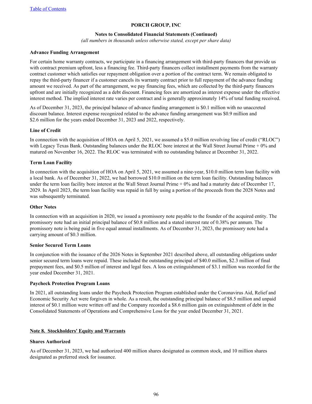 Advance Funding Arrangement For certain home warranty contracts, we participate in a financing arrangement with third-party financers that provide us with contract premium upfront, less a financing fee. Third-party financers collect installment payments from the warranty contract customer which satisfies our repayment obligation over a portion of the contract term. We remain obligated to repay the third-party financer if a customer cancels its warranty contract prior to full repayment of the advance funding amount we received. As part of the arrangement, we pay financing fees, which are collected by the third-party financers upfront and are initially recognized as a debt discount. Financing fees are amortized as interest expense under the effective interest method. The implied interest rate varies per contract and is generally approximately 14% of total funding received. As of December 31, 2023, the principal balance of advance funding arrangement is $0.1 million with no unaccreted discount balance. Interest expense recognized related to the advance funding arrangement was $0.9 million and $2.6 million for the years ended December 31, 2023 and 2022, respectively. Line of Credit In connection with the acquisition of HOA on April 5, 2021, we assumed a $5.0 million revolving line of credit (“RLOC”) with Legacy Texas Bank. Outstanding balances under the RLOC bore interest at the Wall Street Journal Prime + 0% and matured on November 16, 2022. The RLOC was terminated with no outstanding balance at December 31, 2022. Term Loan Facility In connection with the acquisition of HOA on April 5, 2021, we assumed a nine-year, $10.0 million term loan facility with a local bank. As of December 31, 2022, we had borrowed $10.0 million on the term loan facility. Outstanding balances under the term loan facility bore interest at the Wall Street Journal Prime + 0% and had a maturity date of December 17, 2029. In April 2023, the term loan facility was repaid in full by using a portion of the proceeds from the 2028 Notes and was subsequently terminated. Other Notes In connection with an acquisition in 2020, we issued a promissory note payable to the founder of the acquired entity. The promissory note had an initial principal balance of $0.8 million and a stated interest rate of 0.38% per annum. The promissory note is being paid in five equal annual installments. As of December 31, 2023, the promissory note had a carrying amount of $0.3 million. Senior Secured Term Loans In conjunction with the issuance of the 2026 Notes in September 2021 described above, all outstanding obligations under senior secured term loans were repaid. These included the outstanding principal of $40.0 million, $2.3 million of final prepayment fees, and $0.5 million of interest and legal fees. A loss on extinguishment of $3.1 million was recorded for the year ended December 31, 2021. Paycheck Protection Program Loans In 2021, all outstanding loans under the Paycheck Protection Program established under the Coronavirus Aid, Relief and Economic Security Act were forgiven in whole. As a result, the outstanding principal balance of $8.5 million and unpaid interest of $0.1 million were written off and the Company recorded a $8.6 million gain on extinguishment of debt in the Consolidated Statements of Operations and Comprehensive Loss for the year ended December 31, 2021. Note 8. Stockholders' Equity and Warrants Shares Authorized As of December 31, 2023, we had authorized 400 million shares designated as common stock, and 10 million shares designated as preferred stock for issuance. Table of Contents PORCH GROUP, INC Notes to Consolidated Financial Statements (Continued) (all numbers in thousands unless otherwise stated, except per share data) 96
