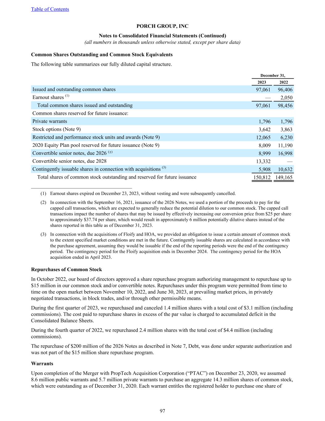 Common Shares Outstanding and Common Stock Equivalents The following table summarizes our fully diluted capital structure. December 31, 2023 2022 Issued and outstanding common shares 97,061 96,406 Earnout shares (1) — 2,050 Total common shares issued and outstanding 97,061 98,456 Common shares reserved for future issuance: Private warrants 1,796 1,796 Stock options (Note 9) 3,642 3,863 Restricted and performance stock units and awards (Note 9) 12,065 6,230 2020 Equity Plan pool reserved for future issuance (Note 9) 8,009 11,190 Convertible senior notes, due 2026 ⁽²⁾ 8,999 16,998 Convertible senior notes, due 2028 13,332 — Contingently issuable shares in connection with acquisitions (3) 5,908 10,632 Total shares of common stock outstanding and reserved for future issuance 150,812 149,165 ______________________________________ (1) Earnout shares expired on December 23, 2023, without vesting and were subsequently cancelled. (2) In connection with the September 16, 2021, issuance of the 2026 Notes, we used a portion of the proceeds to pay for the capped call transactions, which are expected to generally reduce the potential dilution to our common stock. The capped call transactions impact the number of shares that may be issued by effectively increasing our conversion price from $25 per share to approximately $37.74 per share, which would result in approximately 6 million potentially dilutive shares instead of the shares reported in this table as of December 31, 2023. (3) In connection with the acquisitions of Floify and HOA, we provided an obligation to issue a certain amount of common stock to the extent specified market conditions are met in the future. Contingently issuable shares are calculated in accordance with the purchase agreement, assuming they would be issuable if the end of the reporting periods were the end of the contingency period. The contingency period for the Floify acquisition ends in December 2024. The contingency period for the HOA acquisition ended in April 2023. Repurchases of Common Stock In October 2022, our board of directors approved a share repurchase program authorizing management to repurchase up to $15 million in our common stock and/or convertible notes. Repurchases under this program were permitted from time to time on the open market between November 10, 2022, and June 30, 2023, at prevailing market prices, in privately negotiated transactions, in block trades, and/or through other permissible means. During the first quarter of 2023, we repurchased and canceled 1.4 million shares with a total cost of $3.1 million (including commissions). The cost paid to repurchase shares in excess of the par value is charged to accumulated deficit in the Consolidated Balance Sheets. During the fourth quarter of 2022, we repurchased 2.4 million shares with the total cost of $4.4 million (including commissions). The repurchase of $200 million of the 2026 Notes as described in Note 7, Debt, was done under separate authorization and was not part of the $15 million share repurchase program. Warrants Upon completion of the Merger with PropTech Acquisition Corporation (“PTAC”) on December 23, 2020, we assumed 8.6 million public warrants and 5.7 million private warrants to purchase an aggregate 14.3 million shares of common stock, which were outstanding as of December 31, 2020. Each warrant entitles the registered holder to purchase one share of Table of Contents PORCH GROUP, INC Notes to Consolidated Financial Statements (Continued) (all numbers in thousands unless otherwise stated, except per share data) 97