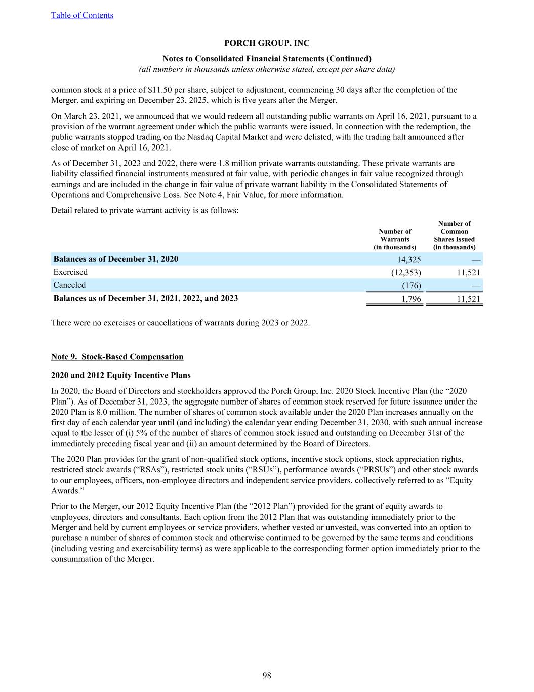 common stock at a price of $11.50 per share, subject to adjustment, commencing 30 days after the completion of the Merger, and expiring on December 23, 2025, which is five years after the Merger. On March 23, 2021, we announced that we would redeem all outstanding public warrants on April 16, 2021, pursuant to a provision of the warrant agreement under which the public warrants were issued. In connection with the redemption, the public warrants stopped trading on the Nasdaq Capital Market and were delisted, with the trading halt announced after close of market on April 16, 2021. As of December 31, 2023 and 2022, there were 1.8 million private warrants outstanding. These private warrants are liability classified financial instruments measured at fair value, with periodic changes in fair value recognized through earnings and are included in the change in fair value of private warrant liability in the Consolidated Statements of Operations and Comprehensive Loss. See Note 4, Fair Value, for more information. Detail related to private warrant activity is as follows: Number of Warrants (in thousands) Number of Common Shares Issued (in thousands) Balances as of December 31, 2020 14,325 — Exercised (12,353) 11,521 Canceled (176) — Balances as of December 31, 2021, 2022, and 2023 1,796 11,521 There were no exercises or cancellations of warrants during 2023 or 2022. Note 9. Stock-Based Compensation 2020 and 2012 Equity Incentive Plans In 2020, the Board of Directors and stockholders approved the Porch Group, Inc. 2020 Stock Incentive Plan (the “2020 Plan”). As of December 31, 2023, the aggregate number of shares of common stock reserved for future issuance under the 2020 Plan is 8.0 million. The number of shares of common stock available under the 2020 Plan increases annually on the first day of each calendar year until (and including) the calendar year ending December 31, 2030, with such annual increase equal to the lesser of (i) 5% of the number of shares of common stock issued and outstanding on December 31st of the immediately preceding fiscal year and (ii) an amount determined by the Board of Directors. The 2020 Plan provides for the grant of non-qualified stock options, incentive stock options, stock appreciation rights, restricted stock awards (“RSAs”), restricted stock units (“RSUs”), performance awards (“PRSUs”) and other stock awards to our employees, officers, non-employee directors and independent service providers, collectively referred to as “Equity Awards.” Prior to the Merger, our 2012 Equity Incentive Plan (the “2012 Plan”) provided for the grant of equity awards to employees, directors and consultants. Each option from the 2012 Plan that was outstanding immediately prior to the Merger and held by current employees or service providers, whether vested or unvested, was converted into an option to purchase a number of shares of common stock and otherwise continued to be governed by the same terms and conditions (including vesting and exercisability terms) as were applicable to the corresponding former option immediately prior to the consummation of the Merger. Table of Contents PORCH GROUP, INC Notes to Consolidated Financial Statements (Continued) (all numbers in thousands unless otherwise stated, except per share data) 98