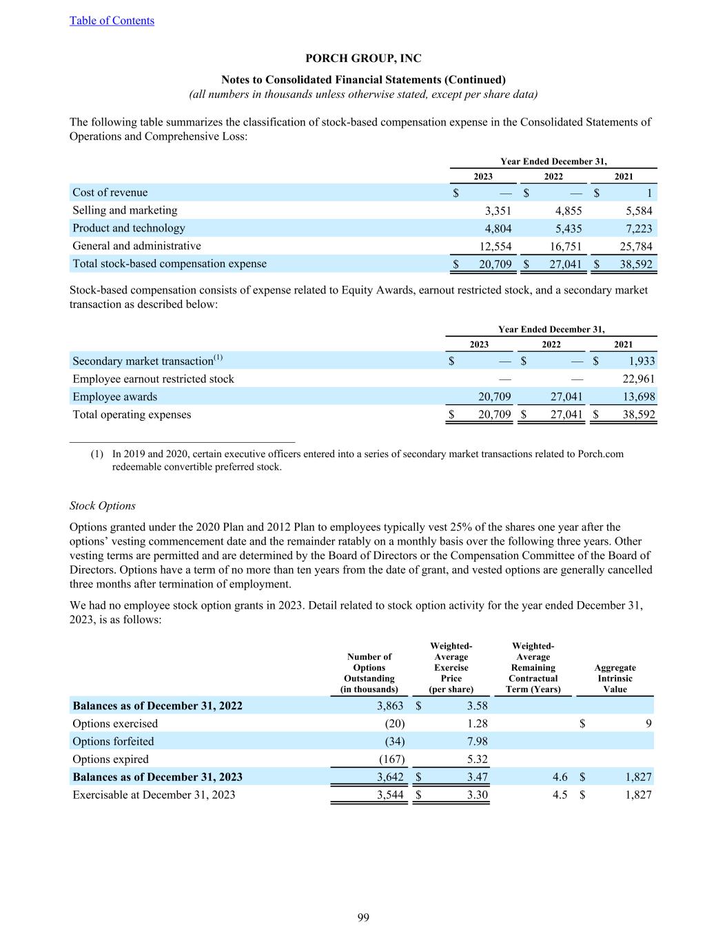 The following table summarizes the classification of stock-based compensation expense in the Consolidated Statements of Operations and Comprehensive Loss: Year Ended December 31, 2023 2022 2021 Cost of revenue $ — $ — $ 1 Selling and marketing 3,351 4,855 5,584 Product and technology 4,804 5,435 7,223 General and administrative 12,554 16,751 25,784 Total stock-based compensation expense $ 20,709 $ 27,041 $ 38,592 Stock-based compensation consists of expense related to Equity Awards, earnout restricted stock, and a secondary market transaction as described below: Year Ended December 31, 2023 2022 2021 Secondary market transaction(1) $ — $ — $ 1,933 Employee earnout restricted stock — — 22,961 Employee awards 20,709 27,041 13,698 Total operating expenses $ 20,709 $ 27,041 $ 38,592 ______________________________________ (1) In 2019 and 2020, certain executive officers entered into a series of secondary market transactions related to Porch.com redeemable convertible preferred stock. Stock Options Options granted under the 2020 Plan and 2012 Plan to employees typically vest 25% of the shares one year after the options’ vesting commencement date and the remainder ratably on a monthly basis over the following three years. Other vesting terms are permitted and are determined by the Board of Directors or the Compensation Committee of the Board of Directors. Options have a term of no more than ten years from the date of grant, and vested options are generally cancelled three months after termination of employment. We had no employee stock option grants in 2023. Detail related to stock option activity for the year ended December 31, 2023, is as follows: Number of Options Outstanding (in thousands) Weighted- Average Exercise Price (per share) Weighted- Average Remaining Contractual Term (Years) Aggregate Intrinsic Value Balances as of December 31, 2022 3,863 $ 3.58 Options exercised (20) 1.28 $ 9 Options forfeited (34) 7.98 Options expired (167) 5.32 Balances as of December 31, 2023 3,642 $ 3.47 4.6 $ 1,827 Exercisable at December 31, 2023 3,544 $ 3.30 4.5 $ 1,827 Table of Contents PORCH GROUP, INC Notes to Consolidated Financial Statements (Continued) (all numbers in thousands unless otherwise stated, except per share data) 99