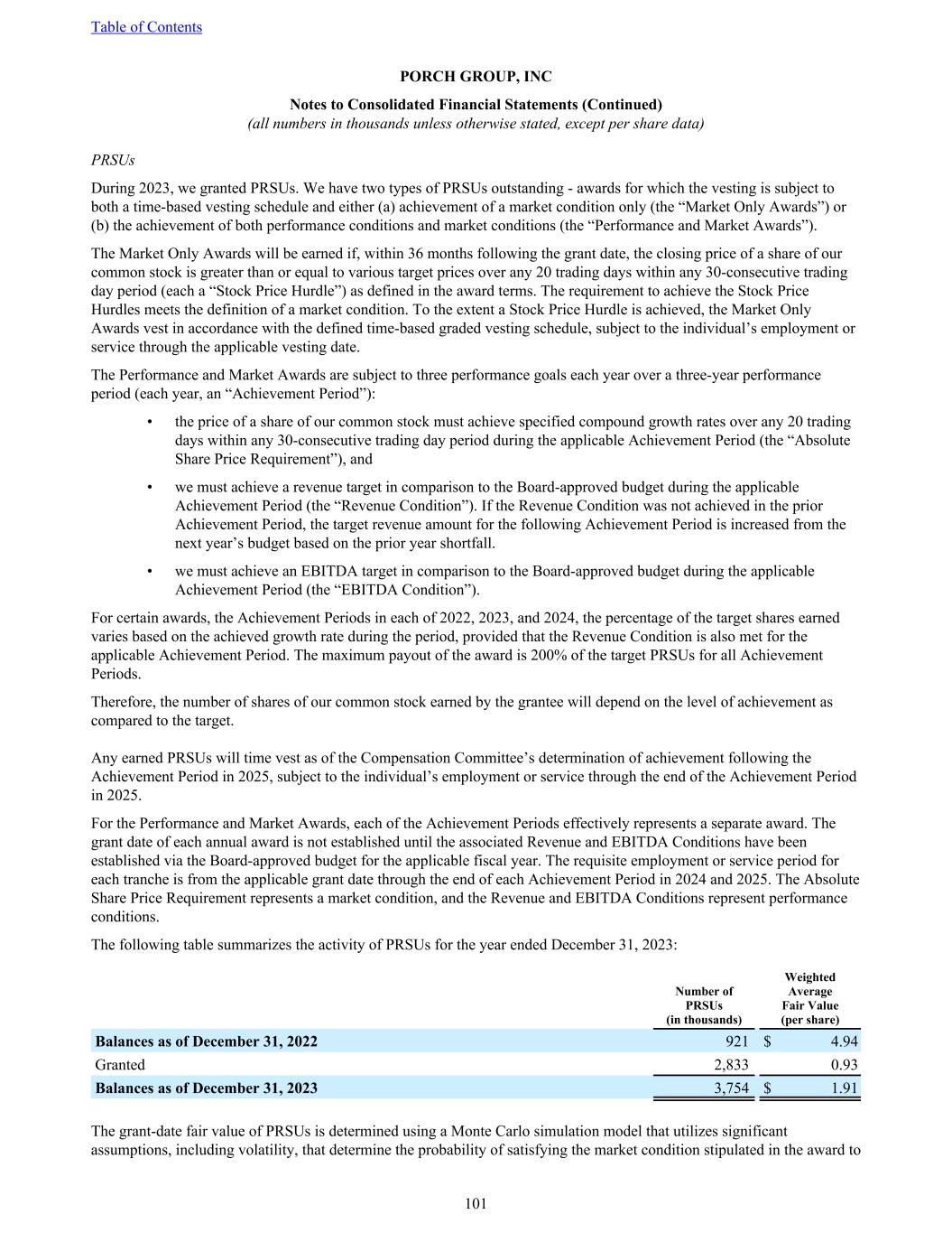 PRSUs During 2023, we granted PRSUs. We have two types of PRSUs outstanding - awards for which the vesting is subject to both a time-based vesting schedule and either (a) achievement of a market condition only (the “Market Only Awards”) or (b) the achievement of both performance conditions and market conditions (the “Performance and Market Awards”). The Market Only Awards will be earned if, within 36 months following the grant date, the closing price of a share of our common stock is greater than or equal to various target prices over any 20 trading days within any 30-consecutive trading day period (each a “Stock Price Hurdle”) as defined in the award terms. The requirement to achieve the Stock Price Hurdles meets the definition of a market condition. To the extent a Stock Price Hurdle is achieved, the Market Only Awards vest in accordance with the defined time-based graded vesting schedule, subject to the individual’s employment or service through the applicable vesting date. The Performance and Market Awards are subject to three performance goals each year over a three-year performance period (each year, an “Achievement Period”): • the price of a share of our common stock must achieve specified compound growth rates over any 20 trading days within any 30-consecutive trading day period during the applicable Achievement Period (the “Absolute Share Price Requirement”), and • we must achieve a revenue target in comparison to the Board-approved budget during the applicable Achievement Period (the “Revenue Condition”). If the Revenue Condition was not achieved in the prior Achievement Period, the target revenue amount for the following Achievement Period is increased from the next year’s budget based on the prior year shortfall. • we must achieve an EBITDA target in comparison to the Board-approved budget during the applicable Achievement Period (the “EBITDA Condition”). For certain awards, the Achievement Periods in each of 2022, 2023, and 2024, the percentage of the target shares earned varies based on the achieved growth rate during the period, provided that the Revenue Condition is also met for the applicable Achievement Period. The maximum payout of the award is 200% of the target PRSUs for all Achievement Periods. Therefore, the number of shares of our common stock earned by the grantee will depend on the level of achievement as compared to the target. Any earned PRSUs will time vest as of the Compensation Committee’s determination of achievement following the Achievement Period in 2025, subject to the individual’s employment or service through the end of the Achievement Period in 2025. For the Performance and Market Awards, each of the Achievement Periods effectively represents a separate award. The grant date of each annual award is not established until the associated Revenue and EBITDA Conditions have been established via the Board-approved budget for the applicable fiscal year. The requisite employment or service period for each tranche is from the applicable grant date through the end of each Achievement Period in 2024 and 2025. The Absolute Share Price Requirement represents a market condition, and the Revenue and EBITDA Conditions represent performance conditions. The following table summarizes the activity of PRSUs for the year ended December 31, 2023: Number of PRSUs (in thousands) Weighted Average Fair Value (per share) Balances as of December 31, 2022 921 $ 4.94 Granted 2,833 0.93 Balances as of December 31, 2023 3,754 $ 1.91 The grant-date fair value of PRSUs is determined using a Monte Carlo simulation model that utilizes significant assumptions, including volatility, that determine the probability of satisfying the market condition stipulated in the award to Table of Contents PORCH GROUP, INC Notes to Consolidated Financial Statements (Continued) (all numbers in thousands unless otherwise stated, except per share data) 101