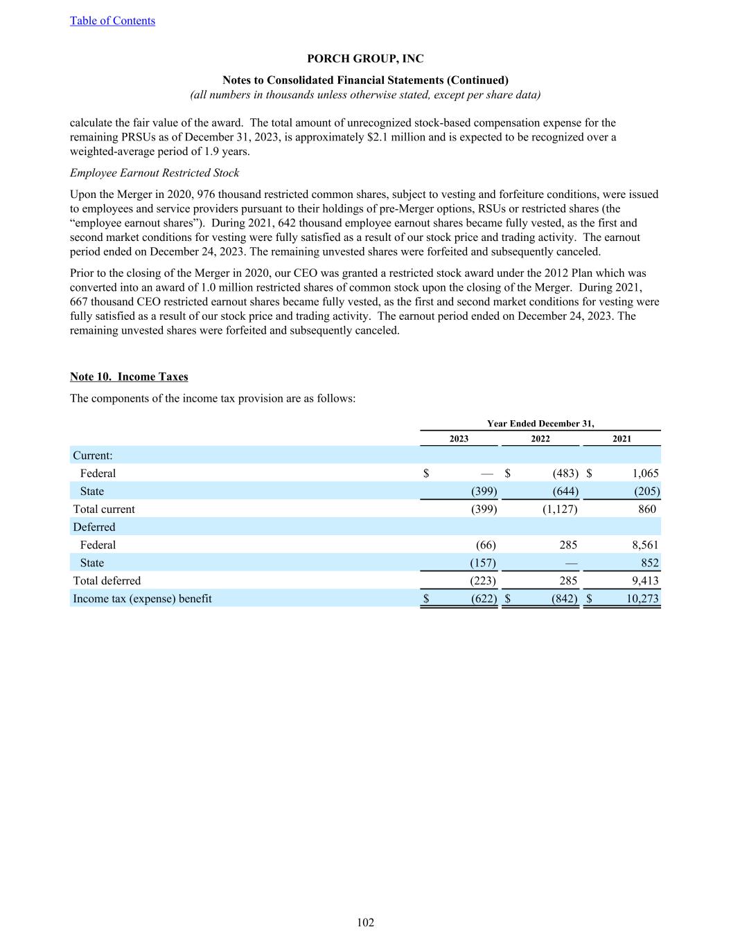 calculate the fair value of the award. The total amount of unrecognized stock-based compensation expense for the remaining PRSUs as of December 31, 2023, is approximately $2.1 million and is expected to be recognized over a weighted-average period of 1.9 years. Employee Earnout Restricted Stock Upon the Merger in 2020, 976 thousand restricted common shares, subject to vesting and forfeiture conditions, were issued to employees and service providers pursuant to their holdings of pre-Merger options, RSUs or restricted shares (the “employee earnout shares”). During 2021, 642 thousand employee earnout shares became fully vested, as the first and second market conditions for vesting were fully satisfied as a result of our stock price and trading activity. The earnout period ended on December 24, 2023. The remaining unvested shares were forfeited and subsequently canceled. Prior to the closing of the Merger in 2020, our CEO was granted a restricted stock award under the 2012 Plan which was converted into an award of 1.0 million restricted shares of common stock upon the closing of the Merger. During 2021, 667 thousand CEO restricted earnout shares became fully vested, as the first and second market conditions for vesting were fully satisfied as a result of our stock price and trading activity. The earnout period ended on December 24, 2023. The remaining unvested shares were forfeited and subsequently canceled. Note 10. Income Taxes The components of the income tax provision are as follows: Year Ended December 31, 2023 2022 2021 Current: Federal $ — $ (483) $ 1,065 State (399) (644) (205) Total current (399) (1,127) 860 Deferred Federal (66) 285 8,561 State (157) — 852 Total deferred (223) 285 9,413 Income tax (expense) benefit $ (622) $ (842) $ 10,273 Table of Contents PORCH GROUP, INC Notes to Consolidated Financial Statements (Continued) (all numbers in thousands unless otherwise stated, except per share data) 102