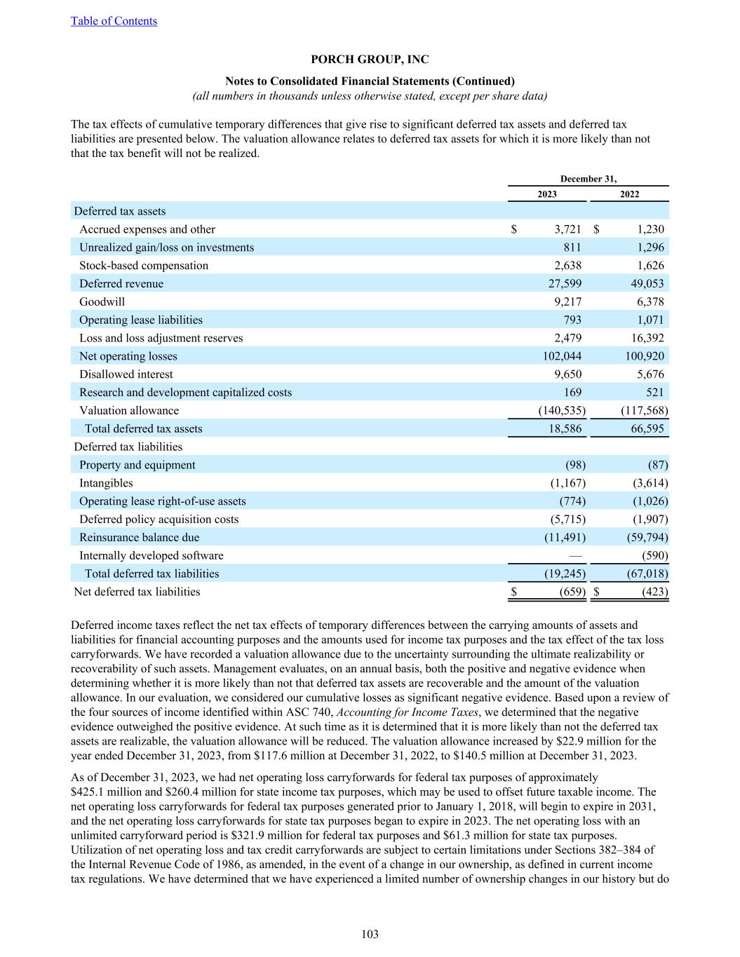 The tax effects of cumulative temporary differences that give rise to significant deferred tax assets and deferred tax liabilities are presented below. The valuation allowance relates to deferred tax assets for which it is more likely than not that the tax benefit will not be realized. December 31, 2023 2022 Deferred tax assets Accrued expenses and other $ 3,721 $ 1,230 Unrealized gain/loss on investments 811 1,296 Stock-based compensation 2,638 1,626 Deferred revenue 27,599 49,053 Goodwill 9,217 6,378 Operating lease liabilities 793 1,071 Loss and loss adjustment reserves 2,479 16,392 Net operating losses 102,044 100,920 Disallowed interest 9,650 5,676 Research and development capitalized costs 169 521 Valuation allowance (140,535) (117,568) Total deferred tax assets 18,586 66,595 Deferred tax liabilities Property and equipment (98) (87) Intangibles (1,167) (3,614) Operating lease right-of-use assets (774) (1,026) Deferred policy acquisition costs (5,715) (1,907) Reinsurance balance due (11,491) (59,794) Internally developed software — (590) Total deferred tax liabilities (19,245) (67,018) Net deferred tax liabilities $ (659) $ (423) Deferred income taxes reflect the net tax effects of temporary differences between the carrying amounts of assets and liabilities for financial accounting purposes and the amounts used for income tax purposes and the tax effect of the tax loss carryforwards. We have recorded a valuation allowance due to the uncertainty surrounding the ultimate realizability or recoverability of such assets. Management evaluates, on an annual basis, both the positive and negative evidence when determining whether it is more likely than not that deferred tax assets are recoverable and the amount of the valuation allowance. In our evaluation, we considered our cumulative losses as significant negative evidence. Based upon a review of the four sources of income identified within ASC 740, Accounting for Income Taxes, we determined that the negative evidence outweighed the positive evidence. At such time as it is determined that it is more likely than not the deferred tax assets are realizable, the valuation allowance will be reduced. The valuation allowance increased by $22.9 million for the year ended December 31, 2023, from $117.6 million at December 31, 2022, to $140.5 million at December 31, 2023. As of December 31, 2023, we had net operating loss carryforwards for federal tax purposes of approximately $425.1 million and $260.4 million for state income tax purposes, which may be used to offset future taxable income. The net operating loss carryforwards for federal tax purposes generated prior to January 1, 2018, will begin to expire in 2031, and the net operating loss carryforwards for state tax purposes began to expire in 2023. The net operating loss with an unlimited carryforward period is $321.9 million for federal tax purposes and $61.3 million for state tax purposes. Utilization of net operating loss and tax credit carryforwards are subject to certain limitations under Sections 382–384 of the Internal Revenue Code of 1986, as amended, in the event of a change in our ownership, as defined in current income tax regulations. We have determined that we have experienced a limited number of ownership changes in our history but do Table of Contents PORCH GROUP, INC Notes to Consolidated Financial Statements (Continued) (all numbers in thousands unless otherwise stated, except per share data) 103