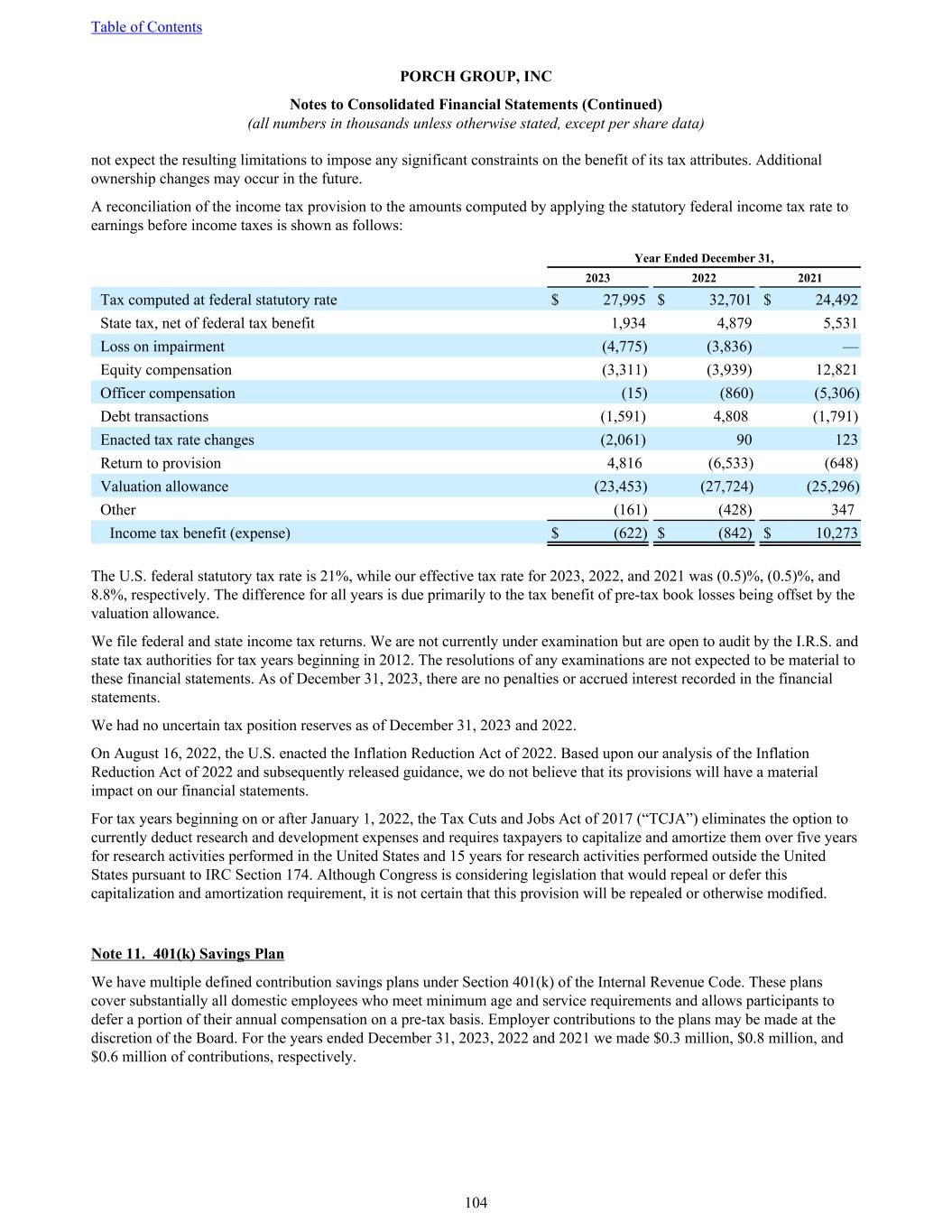not expect the resulting limitations to impose any significant constraints on the benefit of its tax attributes. Additional ownership changes may occur in the future. A reconciliation of the income tax provision to the amounts computed by applying the statutory federal income tax rate to earnings before income taxes is shown as follows: Year Ended December 31, 2023 2022 2021 Tax computed at federal statutory rate $ 27,995 $ 32,701 $ 24,492 State tax, net of federal tax benefit 1,934 4,879 5,531 Loss on impairment (4,775) (3,836) — Equity compensation (3,311) (3,939) 12,821 Officer compensation (15) (860) (5,306) Debt transactions (1,591) 4,808 (1,791) Enacted tax rate changes (2,061) 90 123 Return to provision 4,816 (6,533) (648) Valuation allowance (23,453) (27,724) (25,296) Other (161) (428) 347 Income tax benefit (expense) $ (622) $ (842) $ 10,273 The U.S. federal statutory tax rate is 21%, while our effective tax rate for 2023, 2022, and 2021 was (0.5)%, (0.5)%, and 8.8%, respectively. The difference for all years is due primarily to the tax benefit of pre-tax book losses being offset by the valuation allowance. We file federal and state income tax returns. We are not currently under examination but are open to audit by the I.R.S. and state tax authorities for tax years beginning in 2012. The resolutions of any examinations are not expected to be material to these financial statements. As of December 31, 2023, there are no penalties or accrued interest recorded in the financial statements. We had no uncertain tax position reserves as of December 31, 2023 and 2022. On August 16, 2022, the U.S. enacted the Inflation Reduction Act of 2022. Based upon our analysis of the Inflation Reduction Act of 2022 and subsequently released guidance, we do not believe that its provisions will have a material impact on our financial statements. For tax years beginning on or after January 1, 2022, the Tax Cuts and Jobs Act of 2017 (“TCJA”) eliminates the option to currently deduct research and development expenses and requires taxpayers to capitalize and amortize them over five years for research activities performed in the United States and 15 years for research activities performed outside the United States pursuant to IRC Section 174. Although Congress is considering legislation that would repeal or defer this capitalization and amortization requirement, it is not certain that this provision will be repealed or otherwise modified. Note 11. 401(k) Savings Plan We have multiple defined contribution savings plans under Section 401(k) of the Internal Revenue Code. These plans cover substantially all domestic employees who meet minimum age and service requirements and allows participants to defer a portion of their annual compensation on a pre-tax basis. Employer contributions to the plans may be made at the discretion of the Board. For the years ended December 31, 2023, 2022 and 2021 we made $0.3 million, $0.8 million, and $0.6 million of contributions, respectively. Table of Contents PORCH GROUP, INC Notes to Consolidated Financial Statements (Continued) (all numbers in thousands unless otherwise stated, except per share data) 104