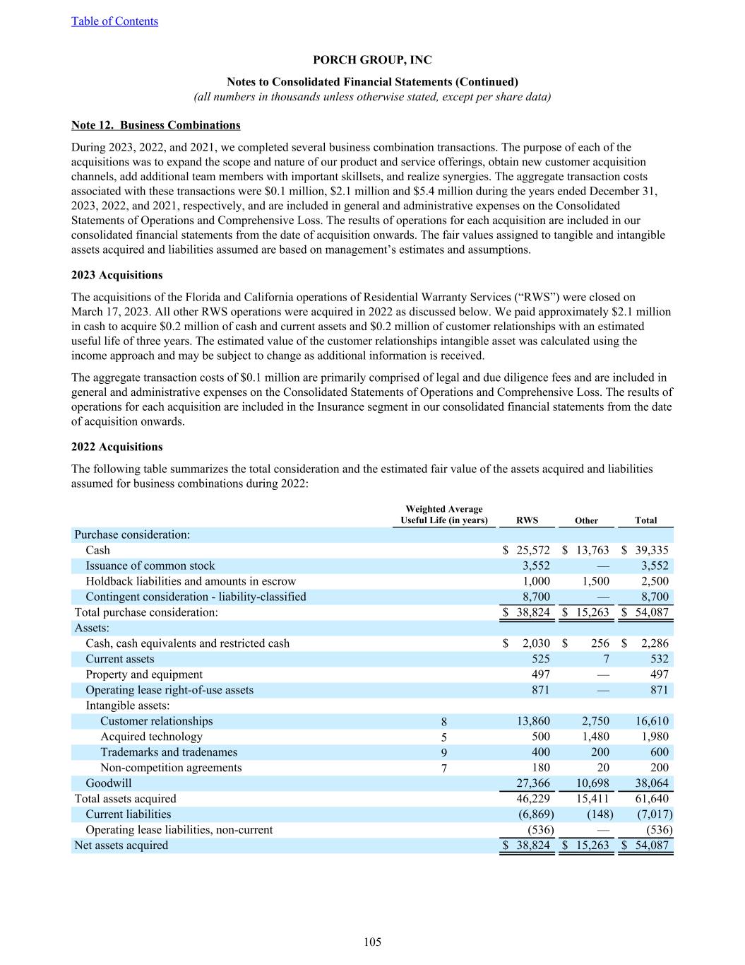 Note 12. Business Combinations During 2023, 2022, and 2021, we completed several business combination transactions. The purpose of each of the acquisitions was to expand the scope and nature of our product and service offerings, obtain new customer acquisition channels, add additional team members with important skillsets, and realize synergies. The aggregate transaction costs associated with these transactions were $0.1 million, $2.1 million and $5.4 million during the years ended December 31, 2023, 2022, and 2021, respectively, and are included in general and administrative expenses on the Consolidated Statements of Operations and Comprehensive Loss. The results of operations for each acquisition are included in our consolidated financial statements from the date of acquisition onwards. The fair values assigned to tangible and intangible assets acquired and liabilities assumed are based on management’s estimates and assumptions. 2023 Acquisitions The acquisitions of the Florida and California operations of Residential Warranty Services (“RWS”) were closed on March 17, 2023. All other RWS operations were acquired in 2022 as discussed below. We paid approximately $2.1 million in cash to acquire $0.2 million of cash and current assets and $0.2 million of customer relationships with an estimated useful life of three years. The estimated value of the customer relationships intangible asset was calculated using the income approach and may be subject to change as additional information is received. The aggregate transaction costs of $0.1 million are primarily comprised of legal and due diligence fees and are included in general and administrative expenses on the Consolidated Statements of Operations and Comprehensive Loss. The results of operations for each acquisition are included in the Insurance segment in our consolidated financial statements from the date of acquisition onwards. 2022 Acquisitions The following table summarizes the total consideration and the estimated fair value of the assets acquired and liabilities assumed for business combinations during 2022: Weighted Average Useful Life (in years) RWS Other Total Purchase consideration: Cash $ 25,572 $ 13,763 $ 39,335 Issuance of common stock 3,552 — 3,552 Holdback liabilities and amounts in escrow 1,000 1,500 2,500 Contingent consideration - liability-classified 8,700 — 8,700 Total purchase consideration: $ 38,824 $ 15,263 $ 54,087 Assets: Cash, cash equivalents and restricted cash $ 2,030 $ 256 $ 2,286 Current assets 525 7 532 Property and equipment 497 — 497 Operating lease right-of-use assets 871 — 871 Intangible assets: Customer relationships 8 13,860 2,750 16,610 Acquired technology 5 500 1,480 1,980 Trademarks and tradenames 9 400 200 600 Non-competition agreements 7 180 20 200 Goodwill 27,366 10,698 38,064 Total assets acquired 46,229 15,411 61,640 Current liabilities (6,869) (148) (7,017) Operating lease liabilities, non-current (536) — (536) Net assets acquired $ 38,824 $ 15,263 $ 54,087 Table of Contents PORCH GROUP, INC Notes to Consolidated Financial Statements (Continued) (all numbers in thousands unless otherwise stated, except per share data) 105