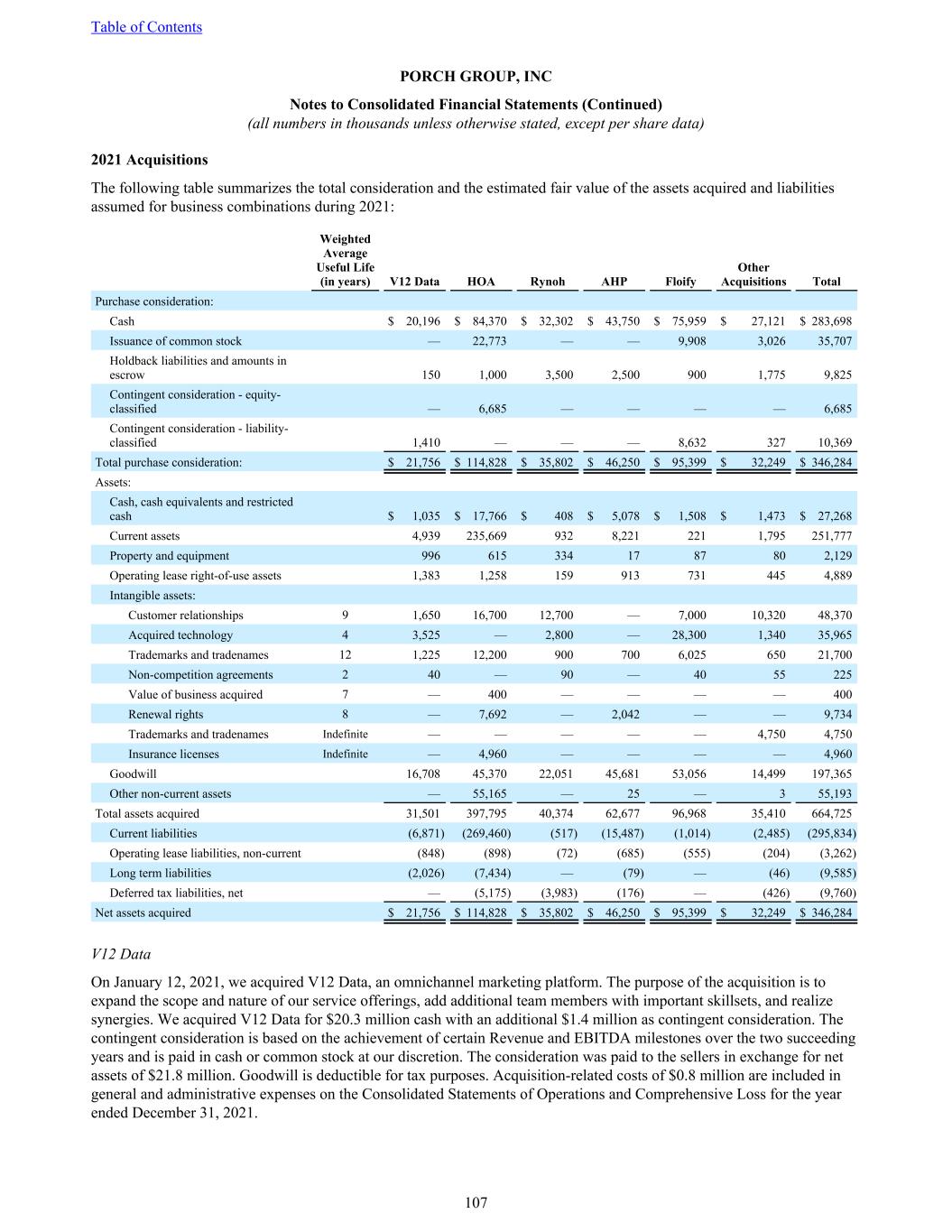 2021 Acquisitions The following table summarizes the total consideration and the estimated fair value of the assets acquired and liabilities assumed for business combinations during 2021: Weighted Average Useful Life (in years) V12 Data HOA Rynoh AHP Floify Other Acquisitions Total Purchase consideration: Cash $ 20,196 $ 84,370 $ 32,302 $ 43,750 $ 75,959 $ 27,121 $ 283,698 Issuance of common stock — 22,773 — — 9,908 3,026 35,707 Holdback liabilities and amounts in escrow 150 1,000 3,500 2,500 900 1,775 9,825 Contingent consideration - equity- classified — 6,685 — — — — 6,685 Contingent consideration - liability- classified 1,410 — — — 8,632 327 10,369 Total purchase consideration: $ 21,756 $ 114,828 $ 35,802 $ 46,250 $ 95,399 $ 32,249 $ 346,284 Assets: Cash, cash equivalents and restricted cash $ 1,035 $ 17,766 $ 408 $ 5,078 $ 1,508 $ 1,473 $ 27,268 Current assets 4,939 235,669 932 8,221 221 1,795 251,777 Property and equipment 996 615 334 17 87 80 2,129 Operating lease right-of-use assets 1,383 1,258 159 913 731 445 4,889 Intangible assets: Customer relationships 9 1,650 16,700 12,700 — 7,000 10,320 48,370 Acquired technology 4 3,525 — 2,800 — 28,300 1,340 35,965 Trademarks and tradenames 12 1,225 12,200 900 700 6,025 650 21,700 Non-competition agreements 2 40 — 90 — 40 55 225 Value of business acquired 7 — 400 — — — — 400 Renewal rights 8 — 7,692 — 2,042 — — 9,734 Trademarks and tradenames Indefinite — — — — — 4,750 4,750 Insurance licenses Indefinite — 4,960 — — — — 4,960 Goodwill 16,708 45,370 22,051 45,681 53,056 14,499 197,365 Other non-current assets — 55,165 — 25 — 3 55,193 Total assets acquired 31,501 397,795 40,374 62,677 96,968 35,410 664,725 Current liabilities (6,871) (269,460) (517) (15,487) (1,014) (2,485) (295,834) Operating lease liabilities, non-current (848) (898) (72) (685) (555) (204) (3,262) Long term liabilities (2,026) (7,434) — (79) — (46) (9,585) Deferred tax liabilities, net — (5,175) (3,983) (176) — (426) (9,760) Net assets acquired $ 21,756 $ 114,828 $ 35,802 $ 46,250 $ 95,399 $ 32,249 $ 346,284 V12 Data On January 12, 2021, we acquired V12 Data, an omnichannel marketing platform. The purpose of the acquisition is to expand the scope and nature of our service offerings, add additional team members with important skillsets, and realize synergies. We acquired V12 Data for $20.3 million cash with an additional $1.4 million as contingent consideration. The contingent consideration is based on the achievement of certain Revenue and EBITDA milestones over the two succeeding years and is paid in cash or common stock at our discretion. The consideration was paid to the sellers in exchange for net assets of $21.8 million. Goodwill is deductible for tax purposes. Acquisition-related costs of $0.8 million are included in general and administrative expenses on the Consolidated Statements of Operations and Comprehensive Loss for the year ended December 31, 2021. Table of Contents PORCH GROUP, INC Notes to Consolidated Financial Statements (Continued) (all numbers in thousands unless otherwise stated, except per share data) 107