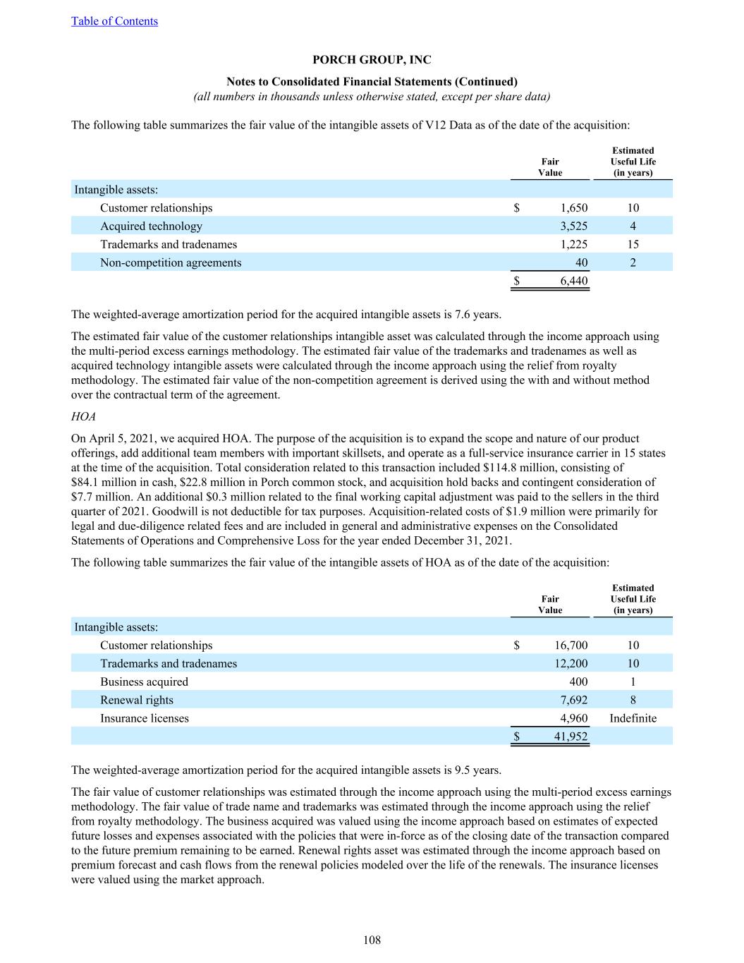 The following table summarizes the fair value of the intangible assets of V12 Data as of the date of the acquisition: Fair Value Estimated Useful Life (in years) Intangible assets: Customer relationships $ 1,650 10 Acquired technology 3,525 4 Trademarks and tradenames 1,225 15 Non-competition agreements 40 2 $ 6,440 The weighted-average amortization period for the acquired intangible assets is 7.6 years. The estimated fair value of the customer relationships intangible asset was calculated through the income approach using the multi-period excess earnings methodology. The estimated fair value of the trademarks and tradenames as well as acquired technology intangible assets were calculated through the income approach using the relief from royalty methodology. The estimated fair value of the non-competition agreement is derived using the with and without method over the contractual term of the agreement. HOA On April 5, 2021, we acquired HOA. The purpose of the acquisition is to expand the scope and nature of our product offerings, add additional team members with important skillsets, and operate as a full-service insurance carrier in 15 states at the time of the acquisition. Total consideration related to this transaction included $114.8 million, consisting of $84.1 million in cash, $22.8 million in Porch common stock, and acquisition hold backs and contingent consideration of $7.7 million. An additional $0.3 million related to the final working capital adjustment was paid to the sellers in the third quarter of 2021. Goodwill is not deductible for tax purposes. Acquisition-related costs of $1.9 million were primarily for legal and due-diligence related fees and are included in general and administrative expenses on the Consolidated Statements of Operations and Comprehensive Loss for the year ended December 31, 2021. The following table summarizes the fair value of the intangible assets of HOA as of the date of the acquisition: Fair Value Estimated Useful Life (in years) Intangible assets: Customer relationships $ 16,700 10 Trademarks and tradenames 12,200 10 Business acquired 400 1 Renewal rights 7,692 8 Insurance licenses 4,960 Indefinite $ 41,952 The weighted-average amortization period for the acquired intangible assets is 9.5 years. The fair value of customer relationships was estimated through the income approach using the multi-period excess earnings methodology. The fair value of trade name and trademarks was estimated through the income approach using the relief from royalty methodology. The business acquired was valued using the income approach based on estimates of expected future losses and expenses associated with the policies that were in-force as of the closing date of the transaction compared to the future premium remaining to be earned. Renewal rights asset was estimated through the income approach based on premium forecast and cash flows from the renewal policies modeled over the life of the renewals. The insurance licenses were valued using the market approach. Table of Contents PORCH GROUP, INC Notes to Consolidated Financial Statements (Continued) (all numbers in thousands unless otherwise stated, except per share data) 108