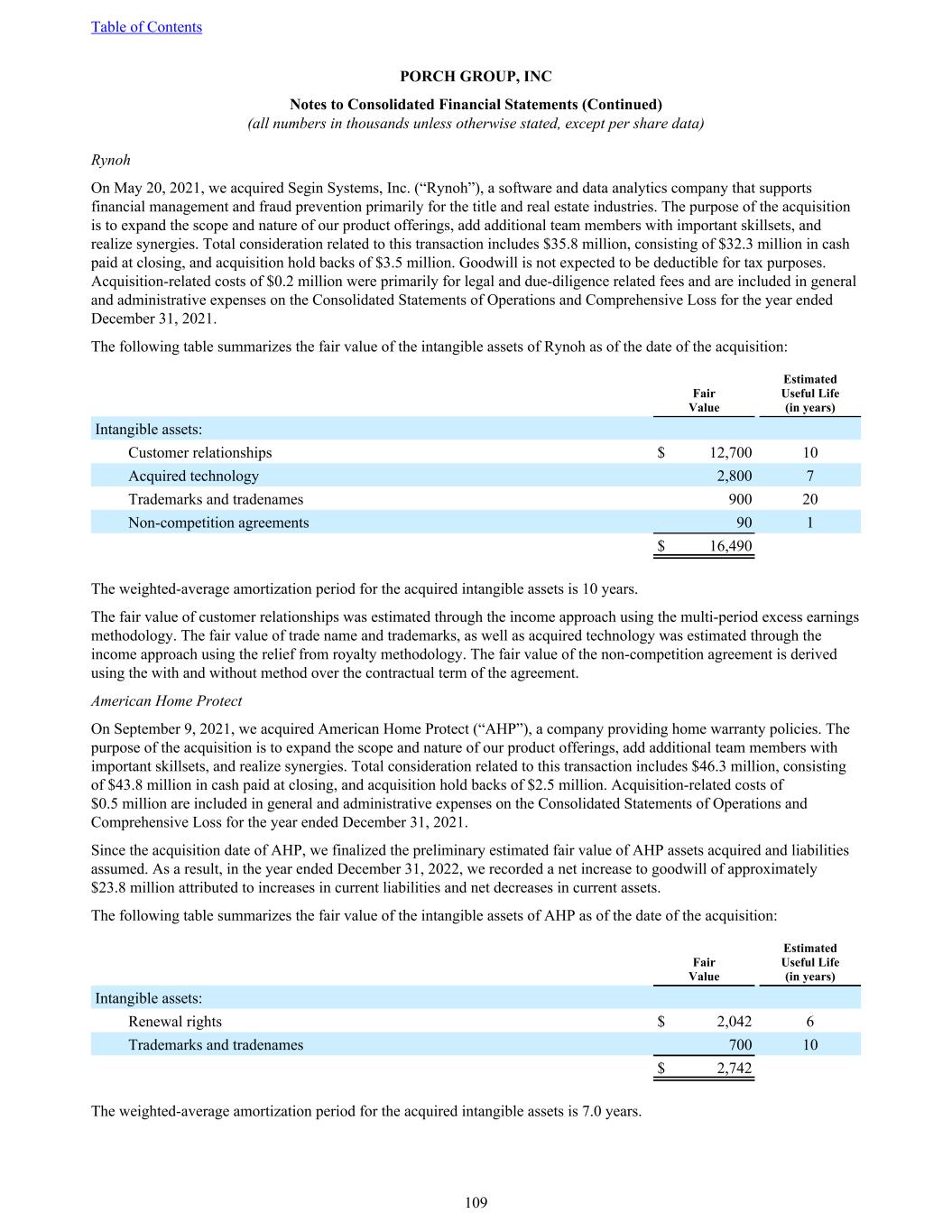 Rynoh On May 20, 2021, we acquired Segin Systems, Inc. (“Rynoh”), a software and data analytics company that supports financial management and fraud prevention primarily for the title and real estate industries. The purpose of the acquisition is to expand the scope and nature of our product offerings, add additional team members with important skillsets, and realize synergies. Total consideration related to this transaction includes $35.8 million, consisting of $32.3 million in cash paid at closing, and acquisition hold backs of $3.5 million. Goodwill is not expected to be deductible for tax purposes. Acquisition-related costs of $0.2 million were primarily for legal and due-diligence related fees and are included in general and administrative expenses on the Consolidated Statements of Operations and Comprehensive Loss for the year ended December 31, 2021. The following table summarizes the fair value of the intangible assets of Rynoh as of the date of the acquisition: Fair Value Estimated Useful Life (in years) Intangible assets: Customer relationships $ 12,700 10 Acquired technology 2,800 7 Trademarks and tradenames 900 20 Non-competition agreements 90 1 $ 16,490 The weighted-average amortization period for the acquired intangible assets is 10 years. The fair value of customer relationships was estimated through the income approach using the multi-period excess earnings methodology. The fair value of trade name and trademarks, as well as acquired technology was estimated through the income approach using the relief from royalty methodology. The fair value of the non-competition agreement is derived using the with and without method over the contractual term of the agreement. American Home Protect On September 9, 2021, we acquired American Home Protect (“AHP”), a company providing home warranty policies. The purpose of the acquisition is to expand the scope and nature of our product offerings, add additional team members with important skillsets, and realize synergies. Total consideration related to this transaction includes $46.3 million, consisting of $43.8 million in cash paid at closing, and acquisition hold backs of $2.5 million. Acquisition-related costs of $0.5 million are included in general and administrative expenses on the Consolidated Statements of Operations and Comprehensive Loss for the year ended December 31, 2021. Since the acquisition date of AHP, we finalized the preliminary estimated fair value of AHP assets acquired and liabilities assumed. As a result, in the year ended December 31, 2022, we recorded a net increase to goodwill of approximately $23.8 million attributed to increases in current liabilities and net decreases in current assets. The following table summarizes the fair value of the intangible assets of AHP as of the date of the acquisition: Fair Value Estimated Useful Life (in years) Intangible assets: Renewal rights $ 2,042 6 Trademarks and tradenames 700 10 $ 2,742 The weighted-average amortization period for the acquired intangible assets is 7.0 years. Table of Contents PORCH GROUP, INC Notes to Consolidated Financial Statements (Continued) (all numbers in thousands unless otherwise stated, except per share data) 109