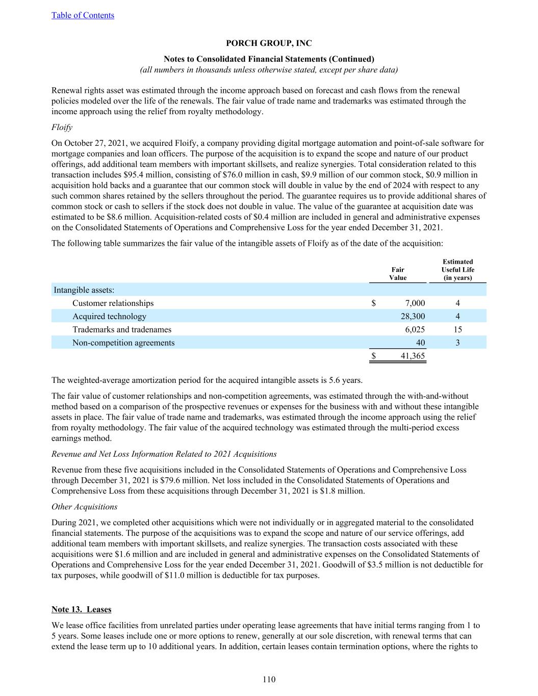 Renewal rights asset was estimated through the income approach based on forecast and cash flows from the renewal policies modeled over the life of the renewals. The fair value of trade name and trademarks was estimated through the income approach using the relief from royalty methodology. Floify On October 27, 2021, we acquired Floify, a company providing digital mortgage automation and point-of-sale software for mortgage companies and loan officers. The purpose of the acquisition is to expand the scope and nature of our product offerings, add additional team members with important skillsets, and realize synergies. Total consideration related to this transaction includes $95.4 million, consisting of $76.0 million in cash, $9.9 million of our common stock, $0.9 million in acquisition hold backs and a guarantee that our common stock will double in value by the end of 2024 with respect to any such common shares retained by the sellers throughout the period. The guarantee requires us to provide additional shares of common stock or cash to sellers if the stock does not double in value. The value of the guarantee at acquisition date was estimated to be $8.6 million. Acquisition-related costs of $0.4 million are included in general and administrative expenses on the Consolidated Statements of Operations and Comprehensive Loss for the year ended December 31, 2021. The following table summarizes the fair value of the intangible assets of Floify as of the date of the acquisition: Fair Value Estimated Useful Life (in years) Intangible assets: Customer relationships $ 7,000 4 Acquired technology 28,300 4 Trademarks and tradenames 6,025 15 Non-competition agreements 40 3 $ 41,365 The weighted-average amortization period for the acquired intangible assets is 5.6 years. The fair value of customer relationships and non-competition agreements, was estimated through the with-and-without method based on a comparison of the prospective revenues or expenses for the business with and without these intangible assets in place. The fair value of trade name and trademarks, was estimated through the income approach using the relief from royalty methodology. The fair value of the acquired technology was estimated through the multi-period excess earnings method. Revenue and Net Loss Information Related to 2021 Acquisitions Revenue from these five acquisitions included in the Consolidated Statements of Operations and Comprehensive Loss through December 31, 2021 is $79.6 million. Net loss included in the Consolidated Statements of Operations and Comprehensive Loss from these acquisitions through December 31, 2021 is $1.8 million. Other Acquisitions During 2021, we completed other acquisitions which were not individually or in aggregated material to the consolidated financial statements. The purpose of the acquisitions was to expand the scope and nature of our service offerings, add additional team members with important skillsets, and realize synergies. The transaction costs associated with these acquisitions were $1.6 million and are included in general and administrative expenses on the Consolidated Statements of Operations and Comprehensive Loss for the year ended December 31, 2021. Goodwill of $3.5 million is not deductible for tax purposes, while goodwill of $11.0 million is deductible for tax purposes. Note 13. Leases We lease office facilities from unrelated parties under operating lease agreements that have initial terms ranging from 1 to 5 years. Some leases include one or more options to renew, generally at our sole discretion, with renewal terms that can extend the lease term up to 10 additional years. In addition, certain leases contain termination options, where the rights to Table of Contents PORCH GROUP, INC Notes to Consolidated Financial Statements (Continued) (all numbers in thousands unless otherwise stated, except per share data) 110